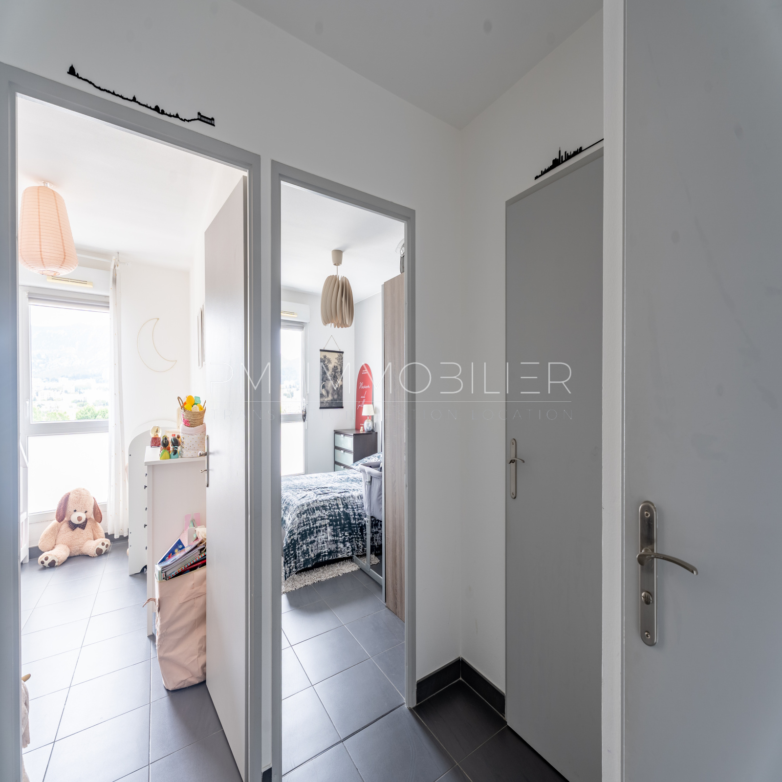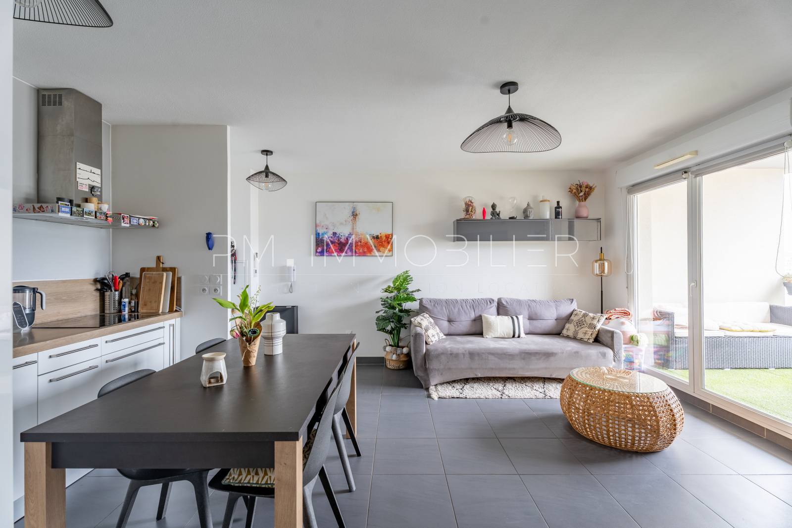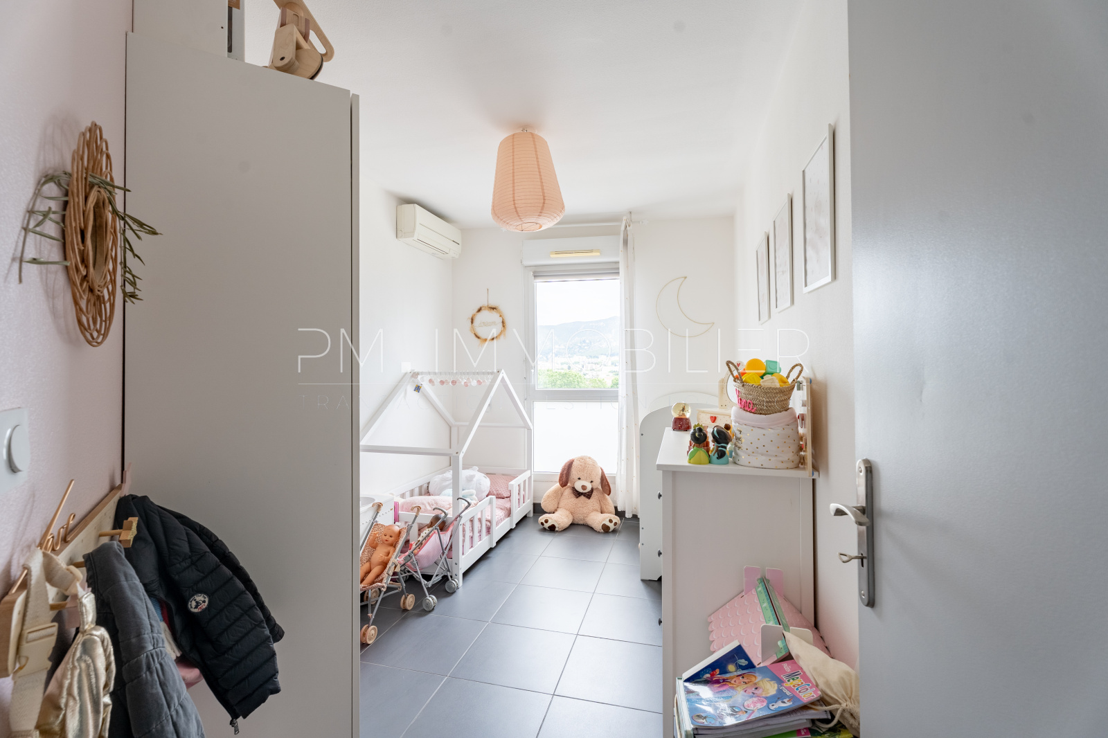 L’appartement se compose d’un séjour lumineux de 22,50m2 avec une cuisine ouverte moderne et fonctionnelle, le tout donnant sur une agréable terrasse où il fait bon se détendre. La pièce à vivre, baignée de lumière, est équipée d’une climatisation réversible, tout comme les deux chambres, ce qui garantit un confort optimal en toute saison.