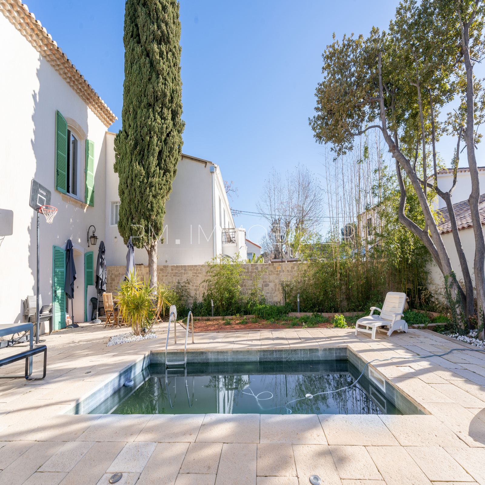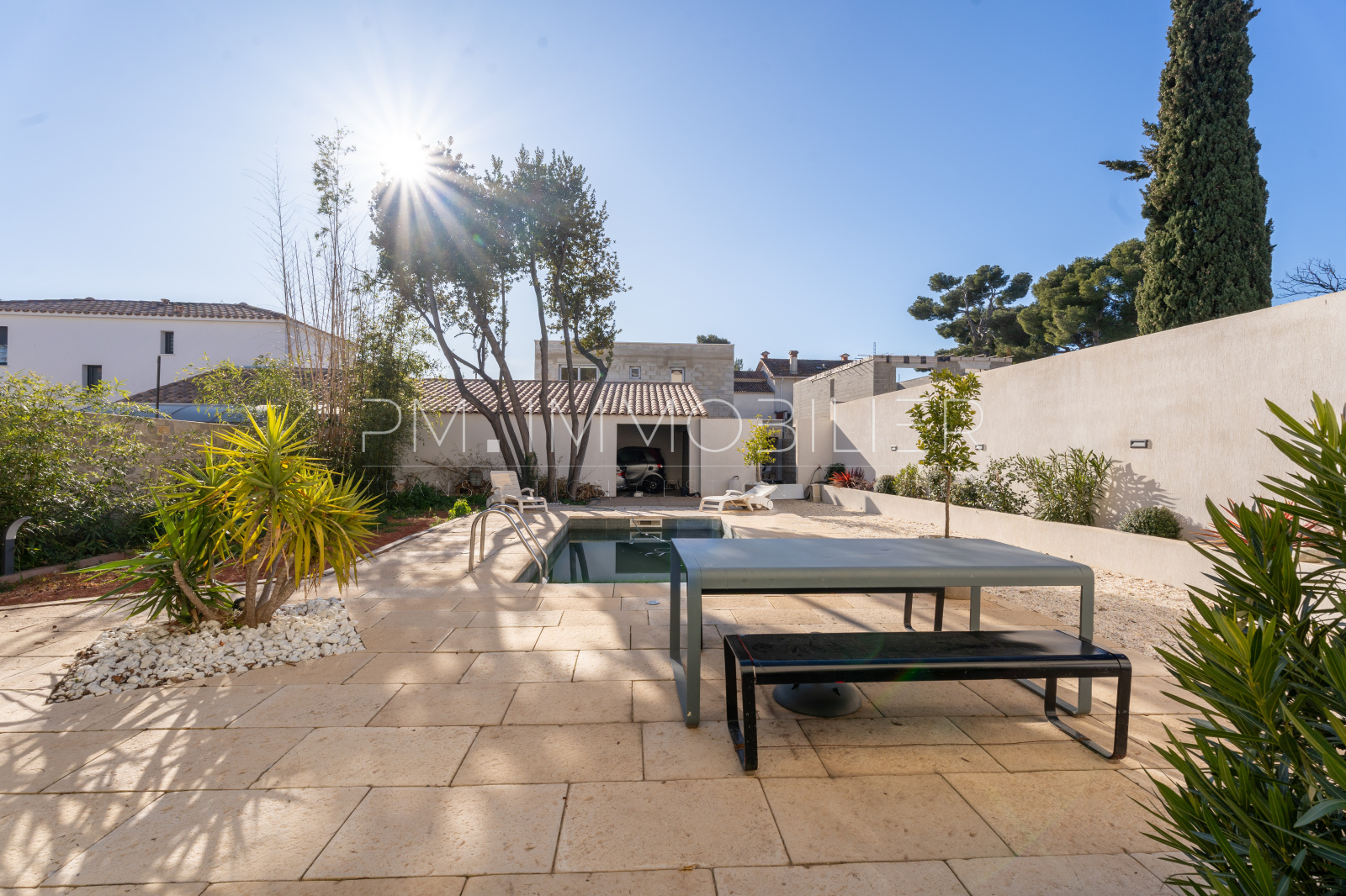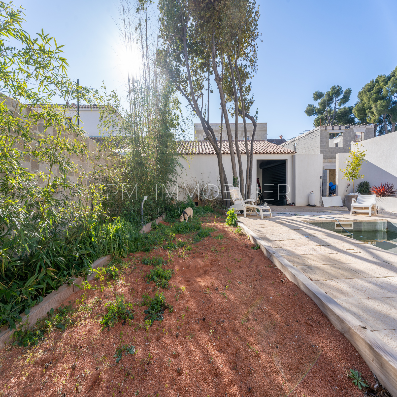 Le salon ouvre sur une terrasse-jardin paysagée spacieuse et ensoleillée, avec une piscine centrale de 5X2m2.