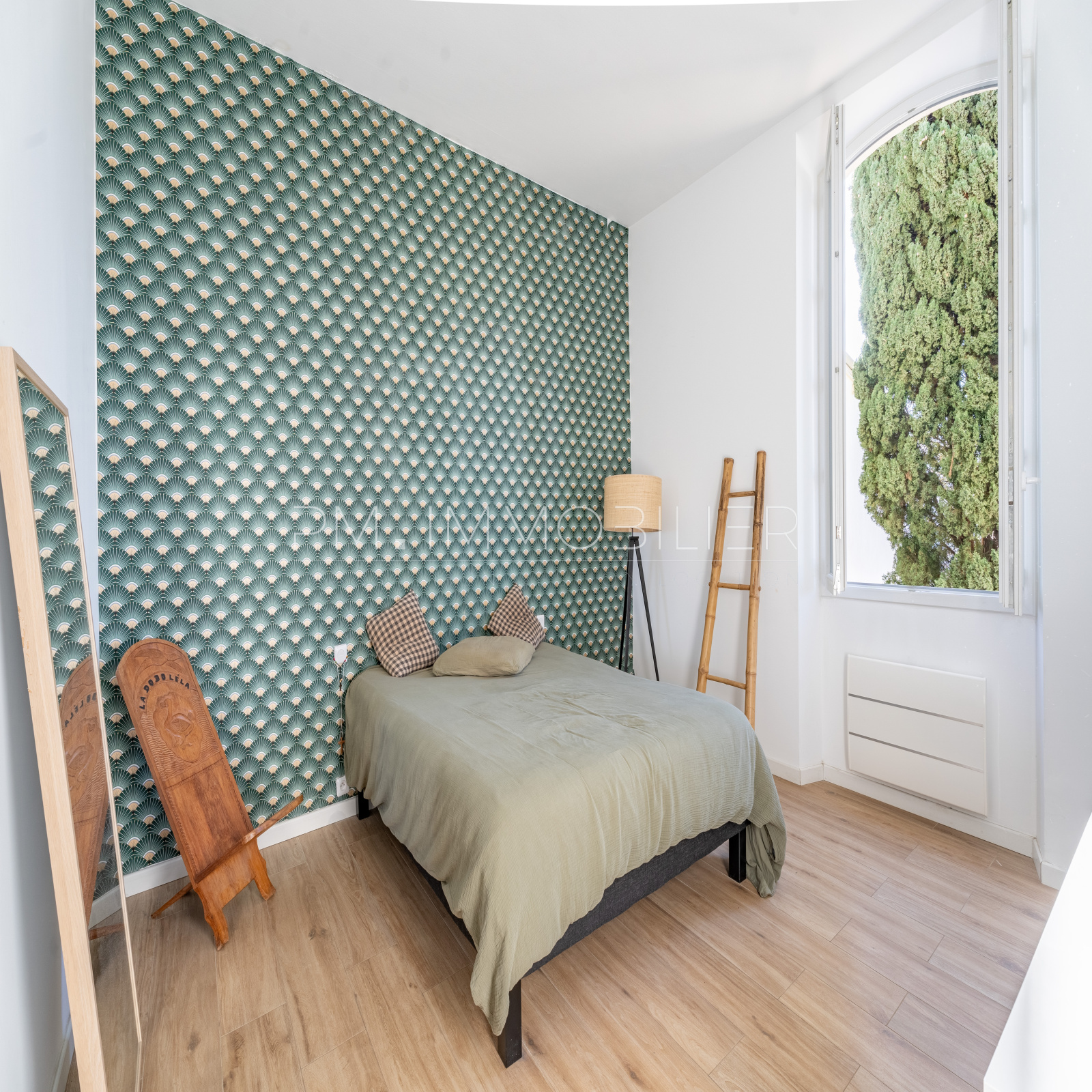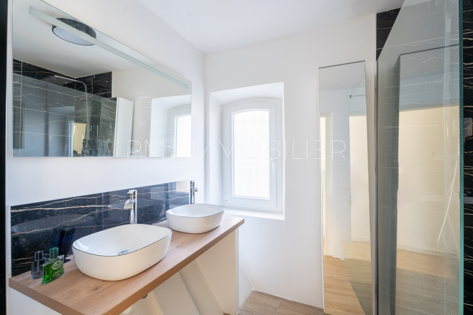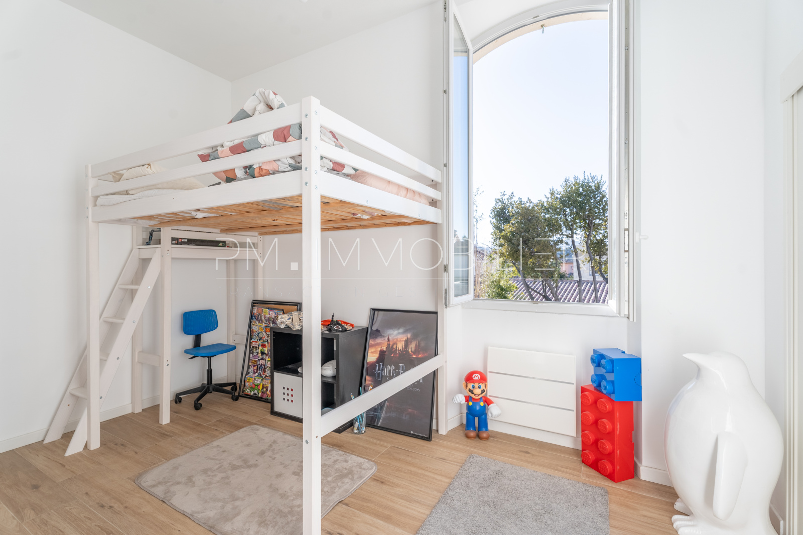 A l'étage, la suite parentale bénéficie d'une belle lumière naturelle ainsi que sa propre salle de bains. On retrouve en plus deux autres chambres à ce niveau et une salle d'eau, un WC séparé. Le tout a été entièrement rénové avec de jolis matériaux. Ce niveau est également éclairée par une belle lumière au sud.