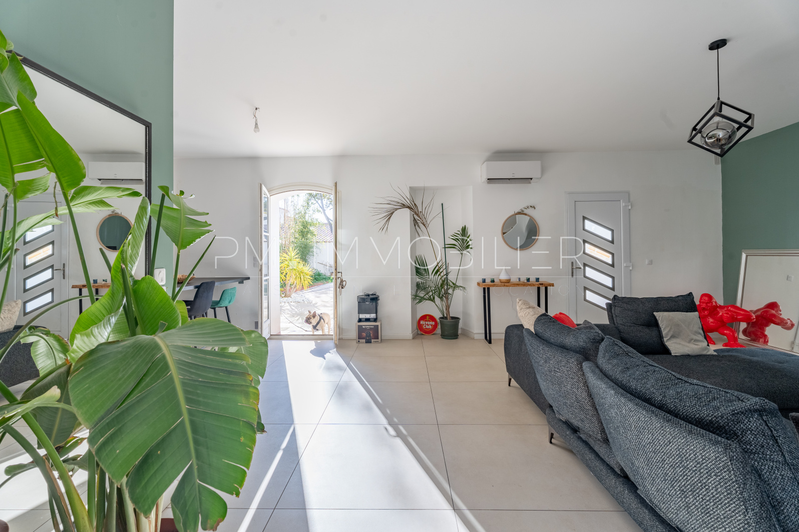 Elevée sur une parcelle de 400m2 exposée au sud, cette maison, mitoyenne sur les côtés, s'articule sur deux niveaux.