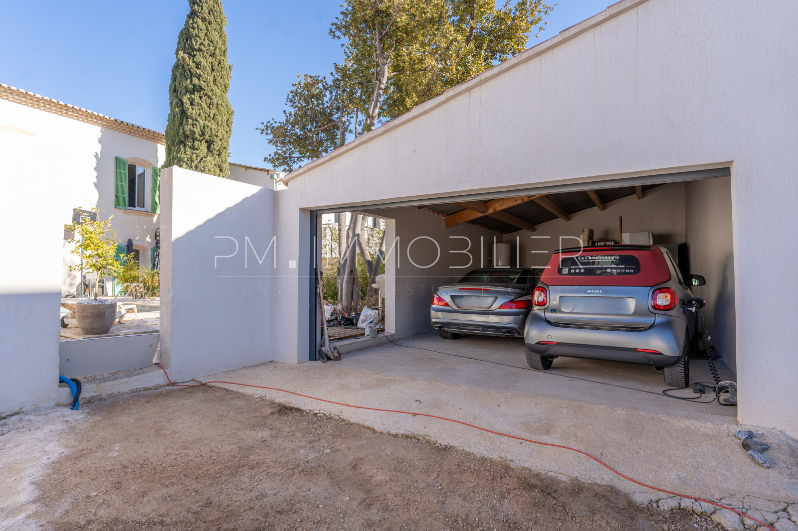 Quatre places de stationnement couvertes sont disponibles en fond de terrain.