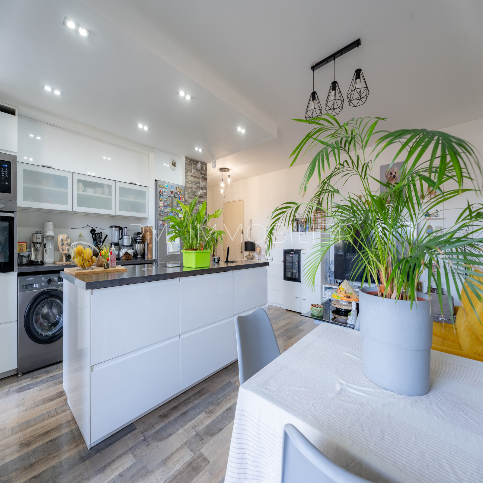 La cuisine contemporaine avec îlot central s’intègre harmonieusement au séjour, créant un espace fonctionnel et chaleureux. L’espace nuit se compose de deux chambres confortables, d’une salle d’eau moderne et de rangements optimisés.