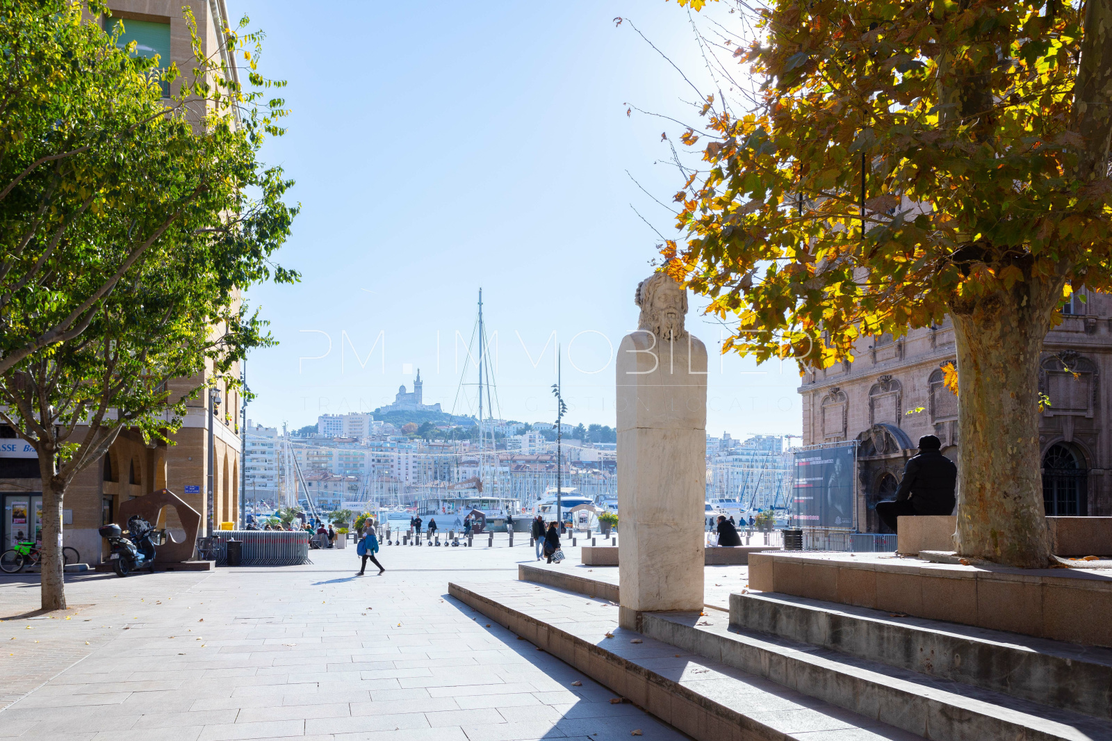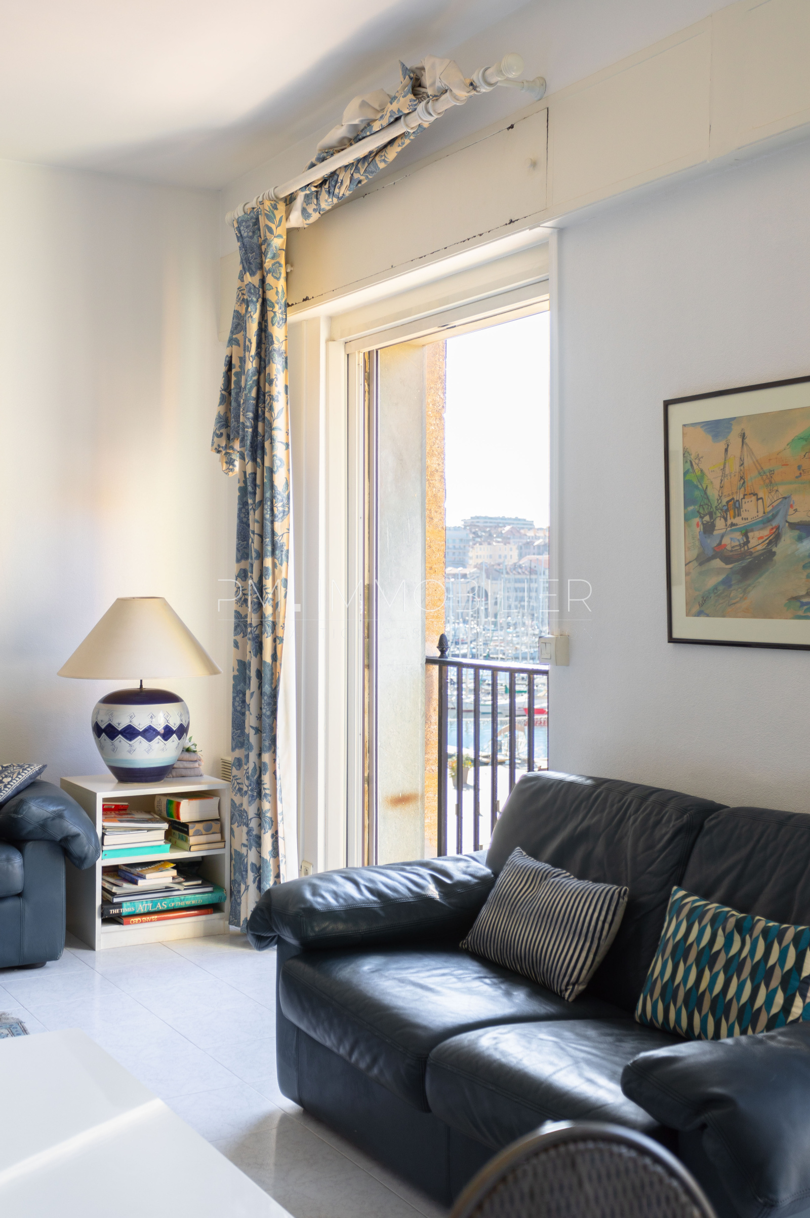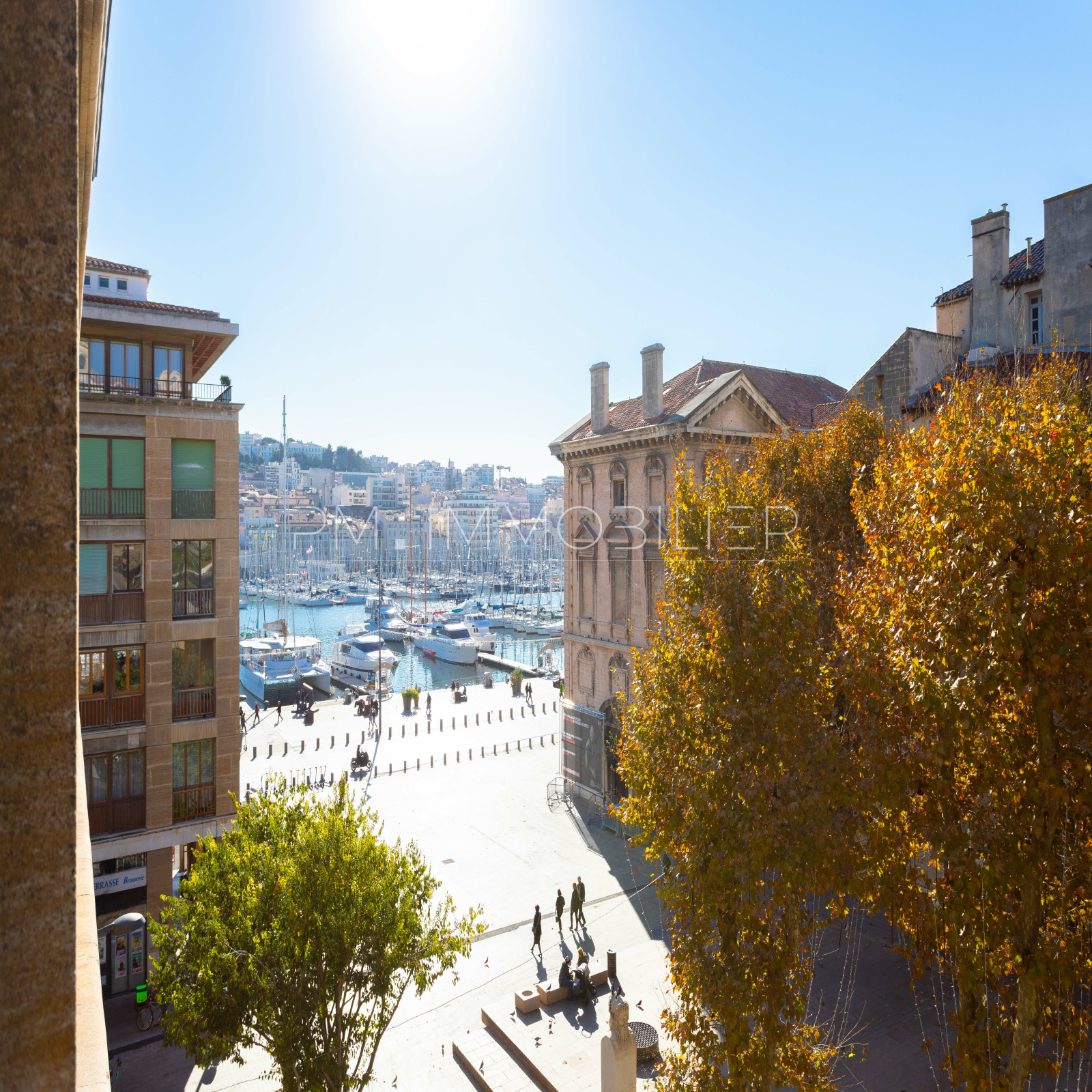 L'entrée s'ouvre le salon/salle à manger de 27 m2 laissant traverser la lumière par de grandes baies vitrées à galandage offrant une vue dégagée sur le Vieux-Port, la Mairie et l'Hôtel Dieu.