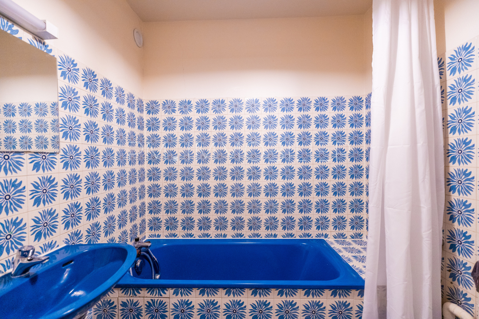 La salle de bain avec baignoire, aux couleurs pop très seventies, en ravira certains.