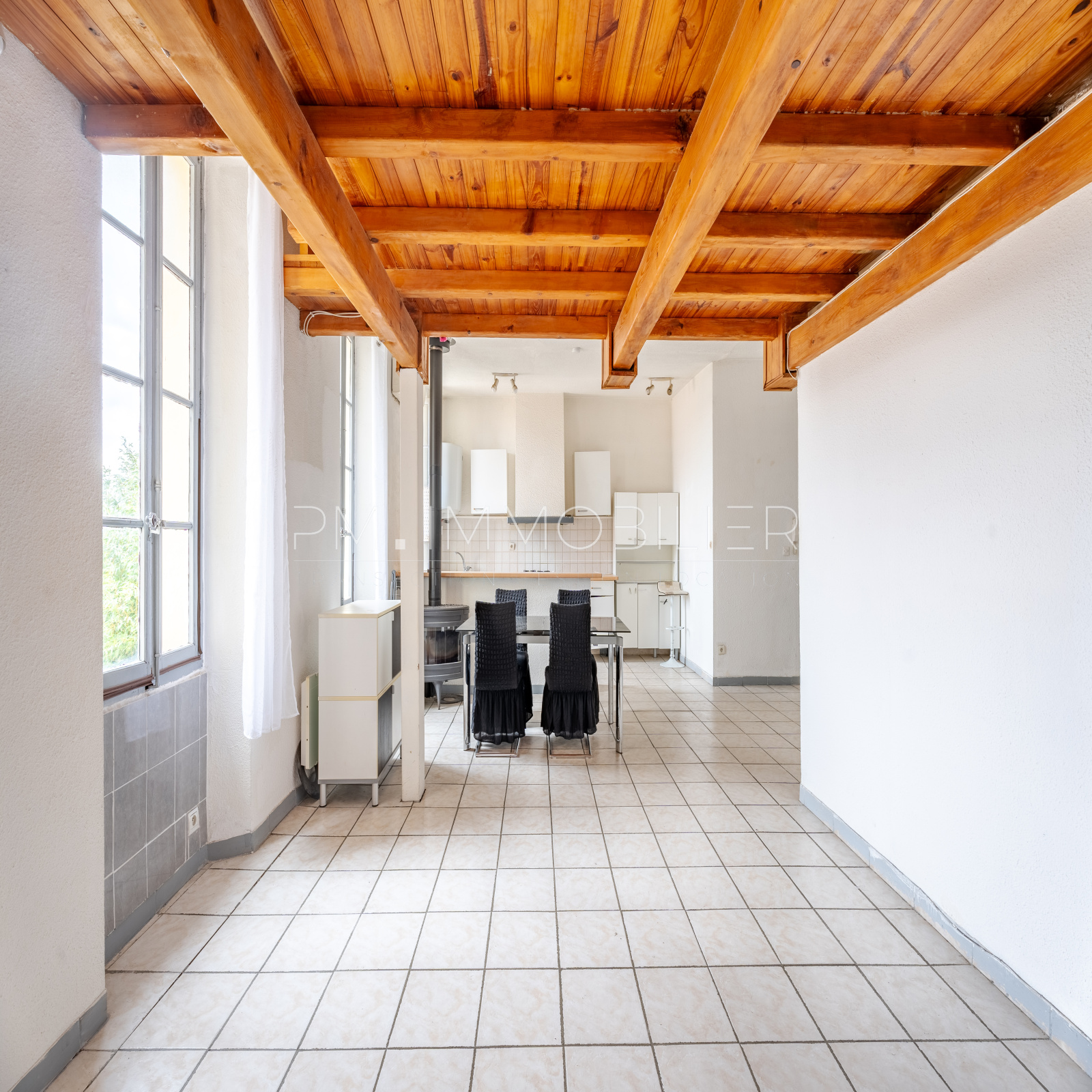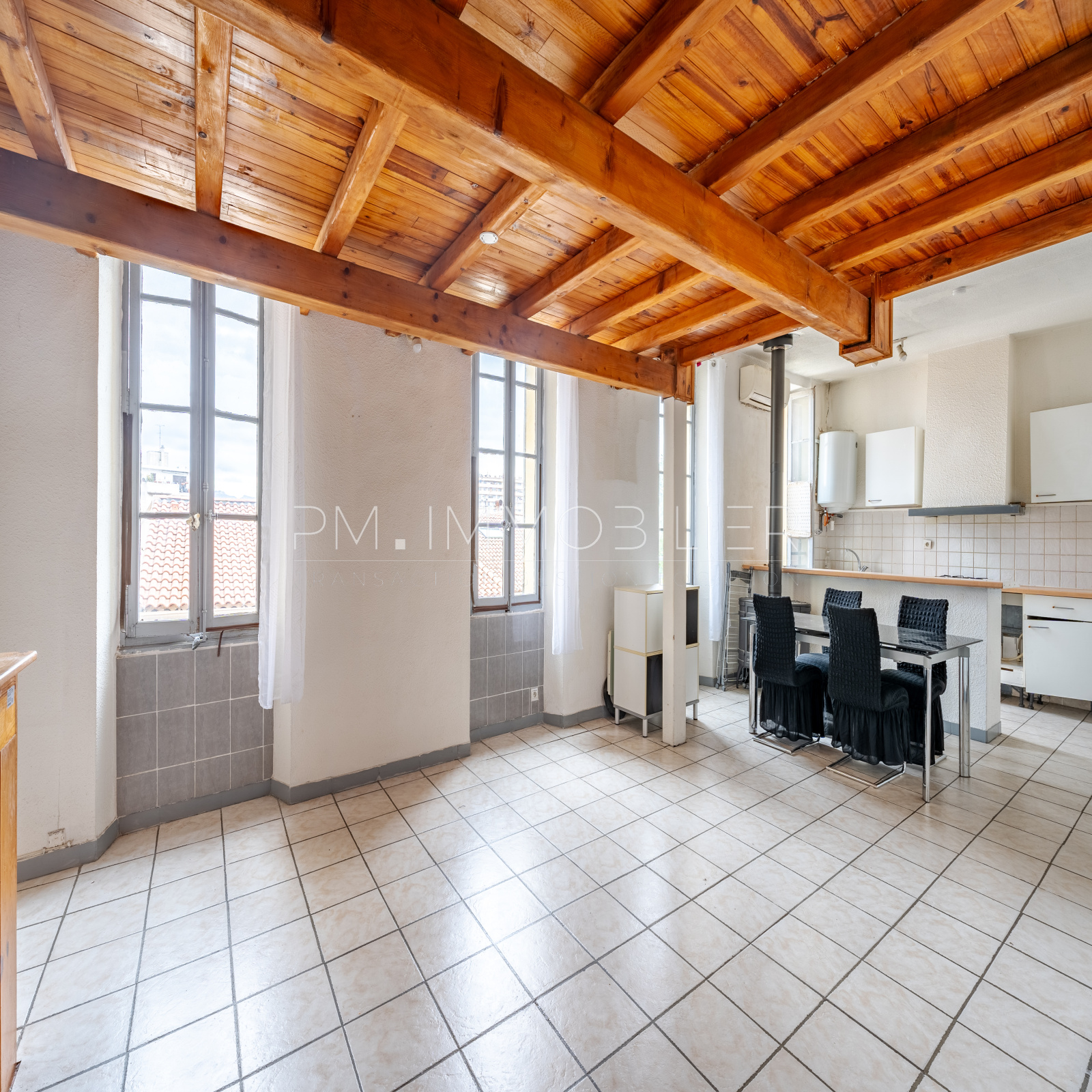 L'appartement se compose d'une grande pièce à vivre de 42m2, lumineuse avec ses quatre fenêtres en façade. Cet espace est doté d'une cuisine ouverte et offre une vue dégagée. Le tout est décoré par une belle cheminée, créant une ambiance chaleureuse et conviviale.