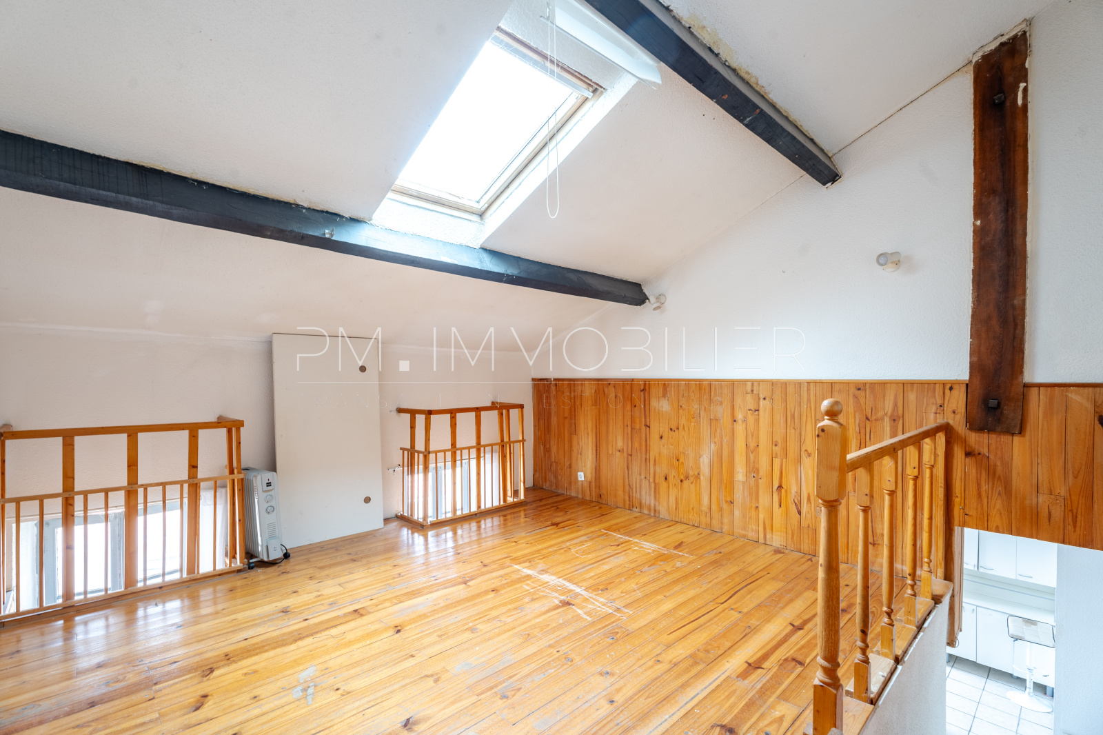 À l'étage, une mezzanine aménagée en coin nuit ajoute un caractère unique à ce bien, avec une belle hauteur sous plafond.
