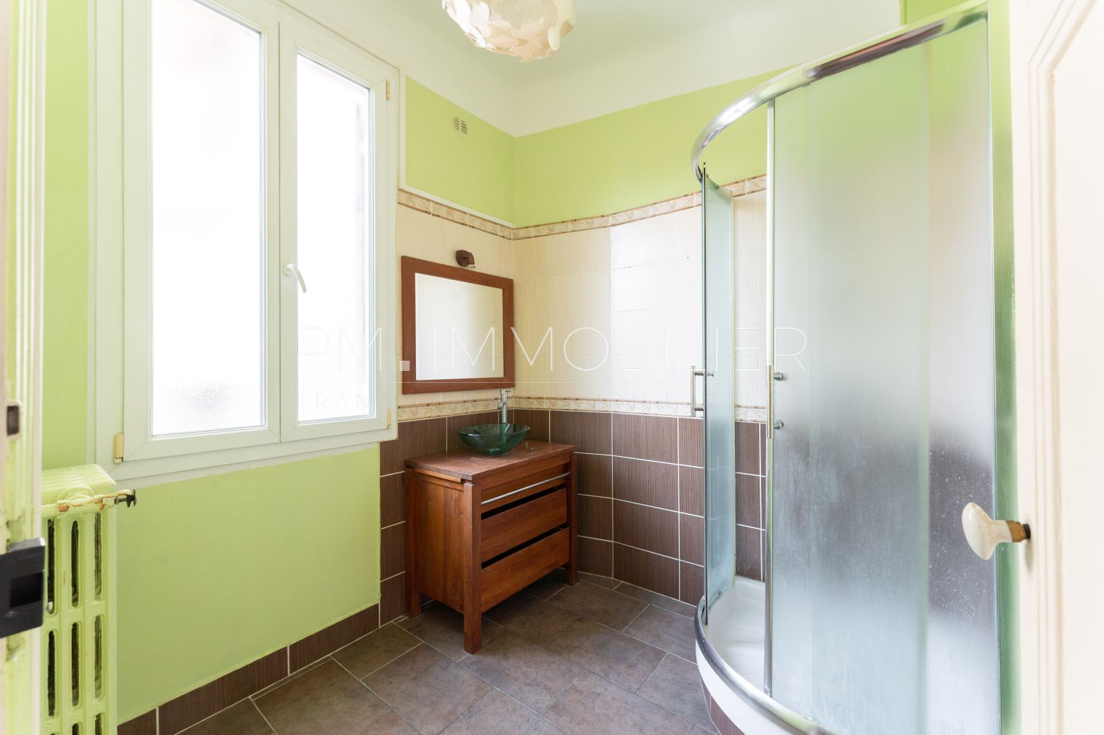 La grande salle d'eau avec meuble vasque et cabine de douche profite d'une ouverture naturelle.