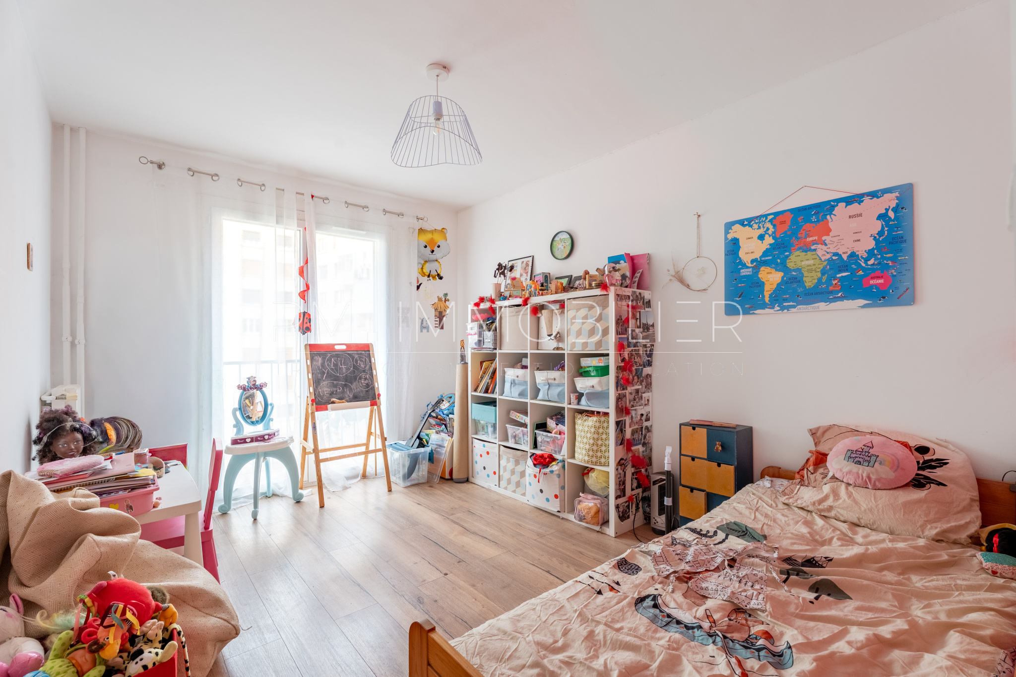 L’appartement se compose d’une entrée, d’un séjour lumineux ouvrant sur un balcon exposé Sud, d’une cuisine séparée donnant sur une loggia, d’un dressing, de toilettes indépendantes, d’un couloir avec rangements desservant trois belles chambres.