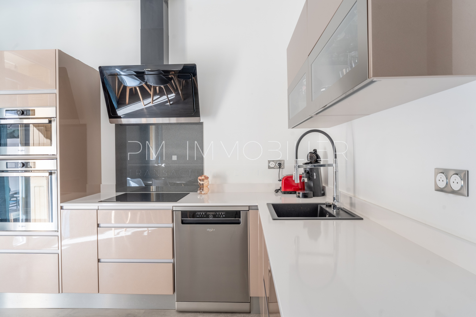 La cuisine ouverte, aménagée et équipée, est discrètement intégrée dans la pièce de vie, adossée à un mur.
