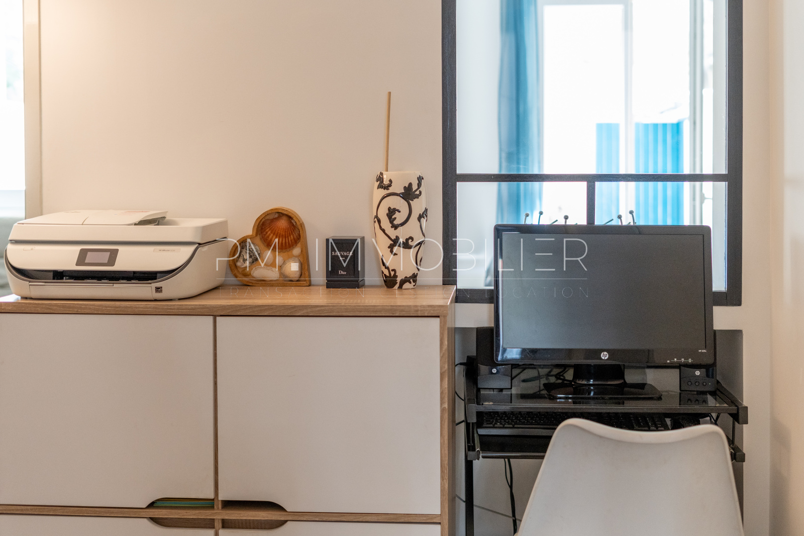 L'entrée se fait dans un hall spacieux, qui dessert toutes les pièces. Un petit coin bureau, situé en face d'une verrière, s'ouvre sur la pièce centrale de l'appartement.