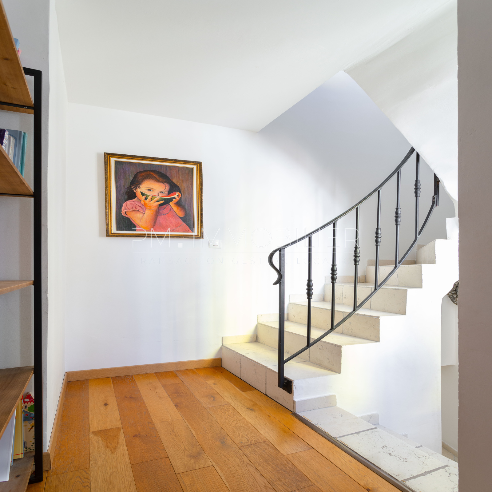 Un escalier avec garde corps en fer forgé noir dessert le premier étage qui dispose de deux chambres éclairées par une lumière chaude se partageant une salle d'eau avec wc et donnant sur un extérieur de 15 m2.