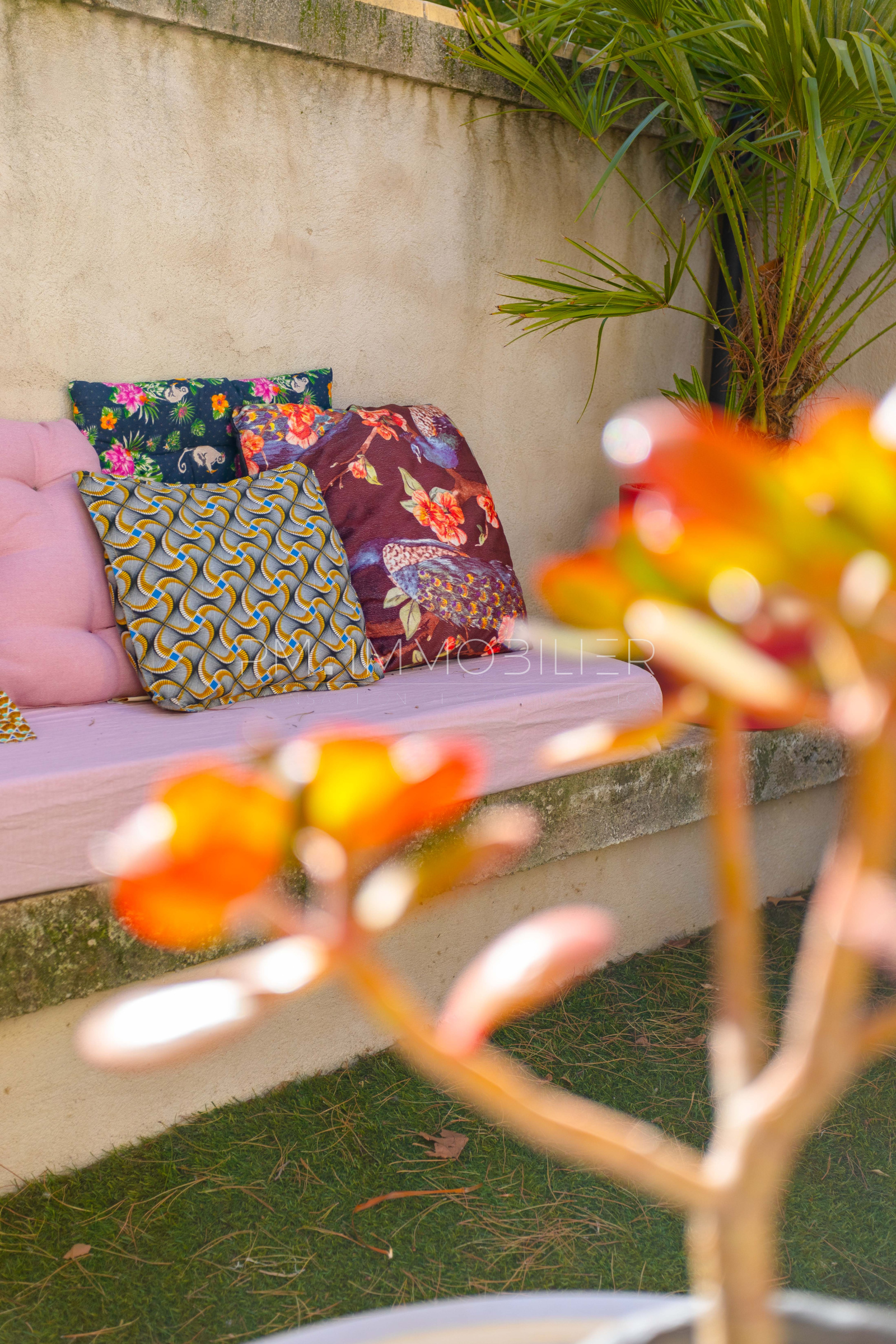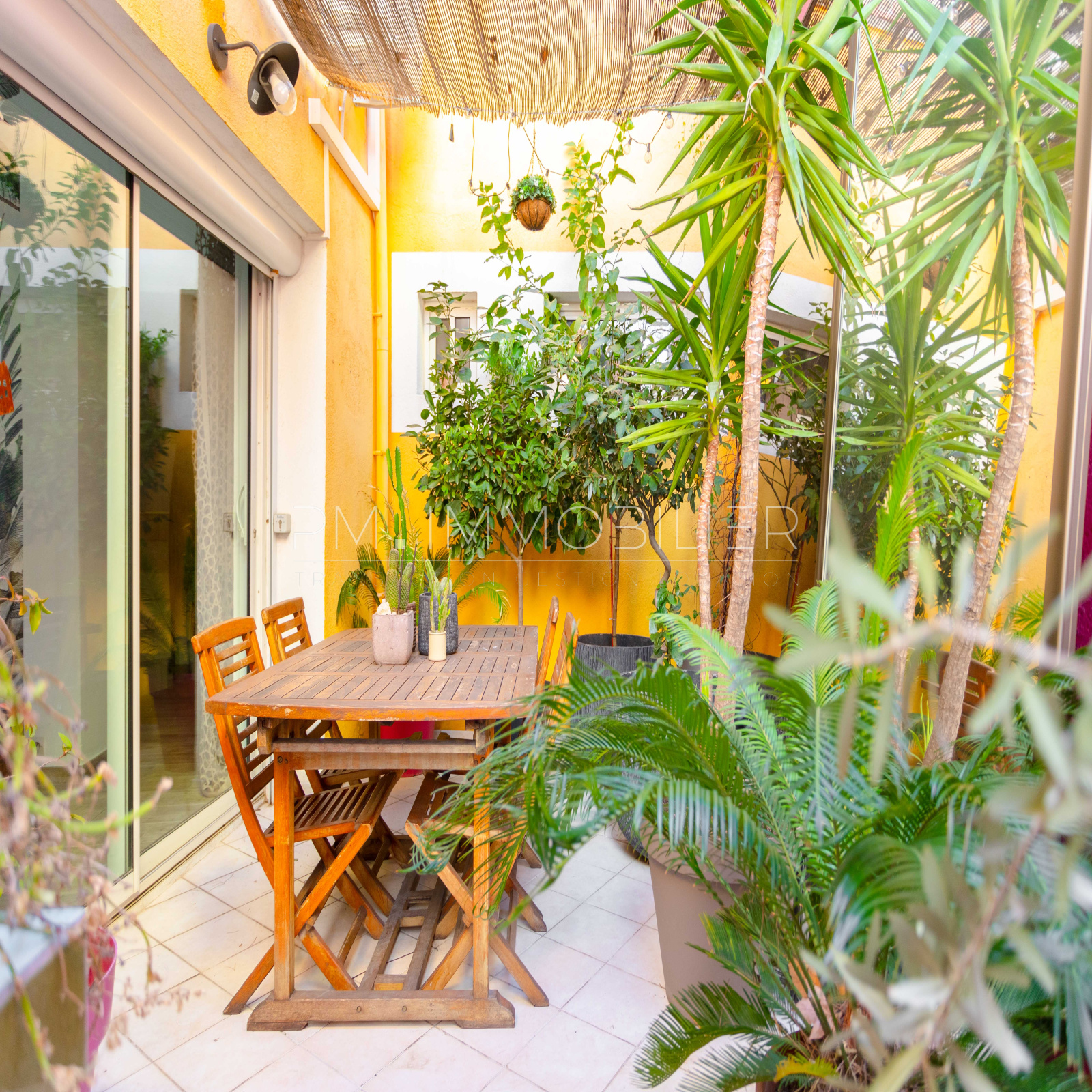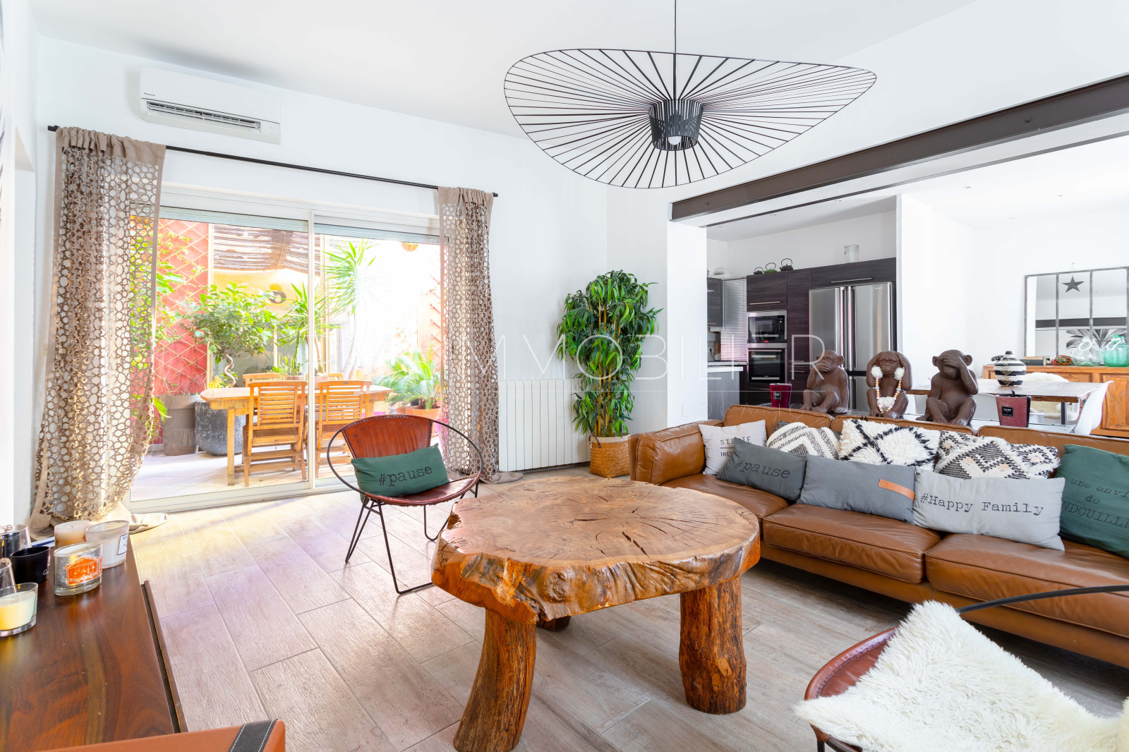 Une entrée intime dessert l'accès principal de la maison, abritant une chaleureuse pièce de vie de 40m² ornée d'un papier peint tropical sublimant le mobilier et donnant sur une cuisine américaine, le tout s'ouvrant sur une terrasse exposée ouest de 17m². Une chambre ainsi qu'une salle de bain et des wc composent le rez-de-chaussé.