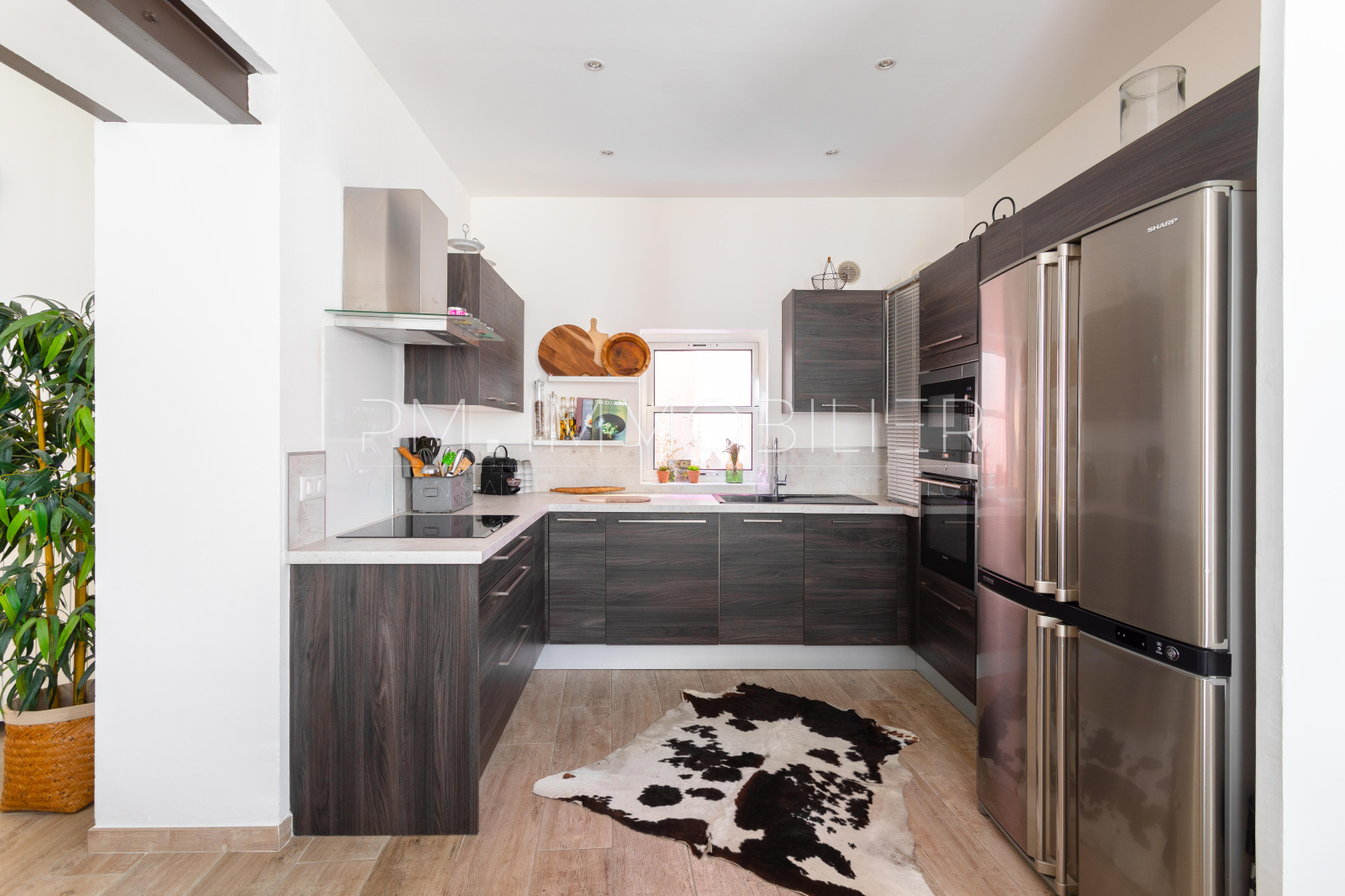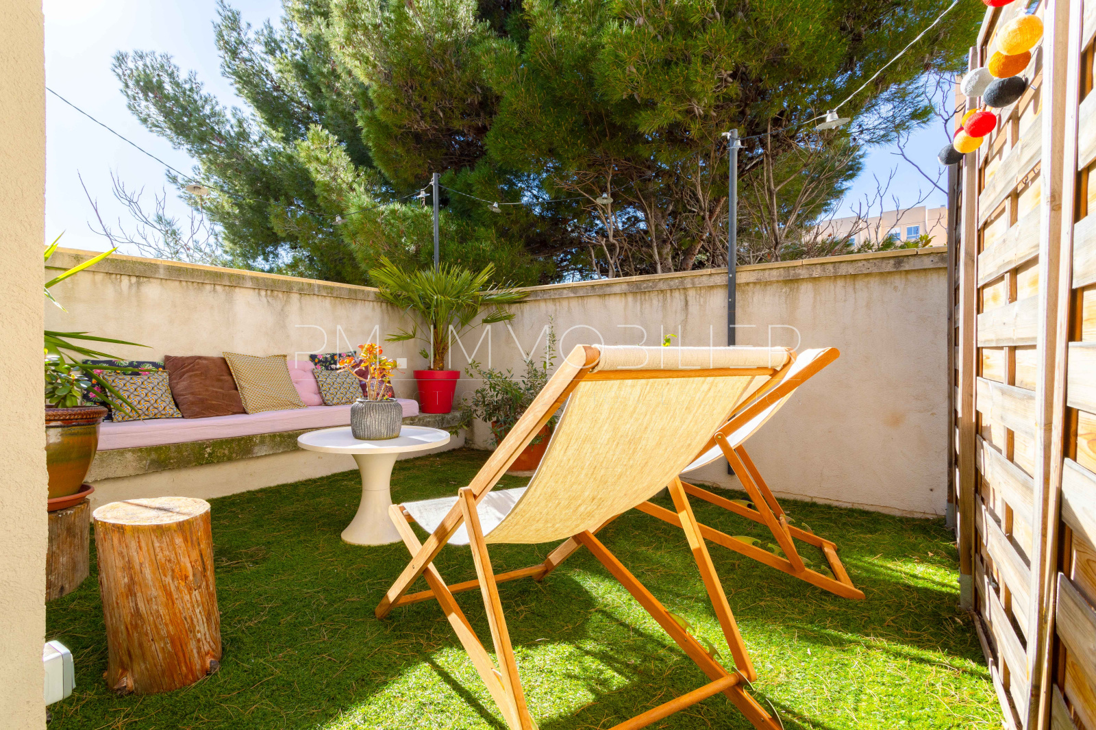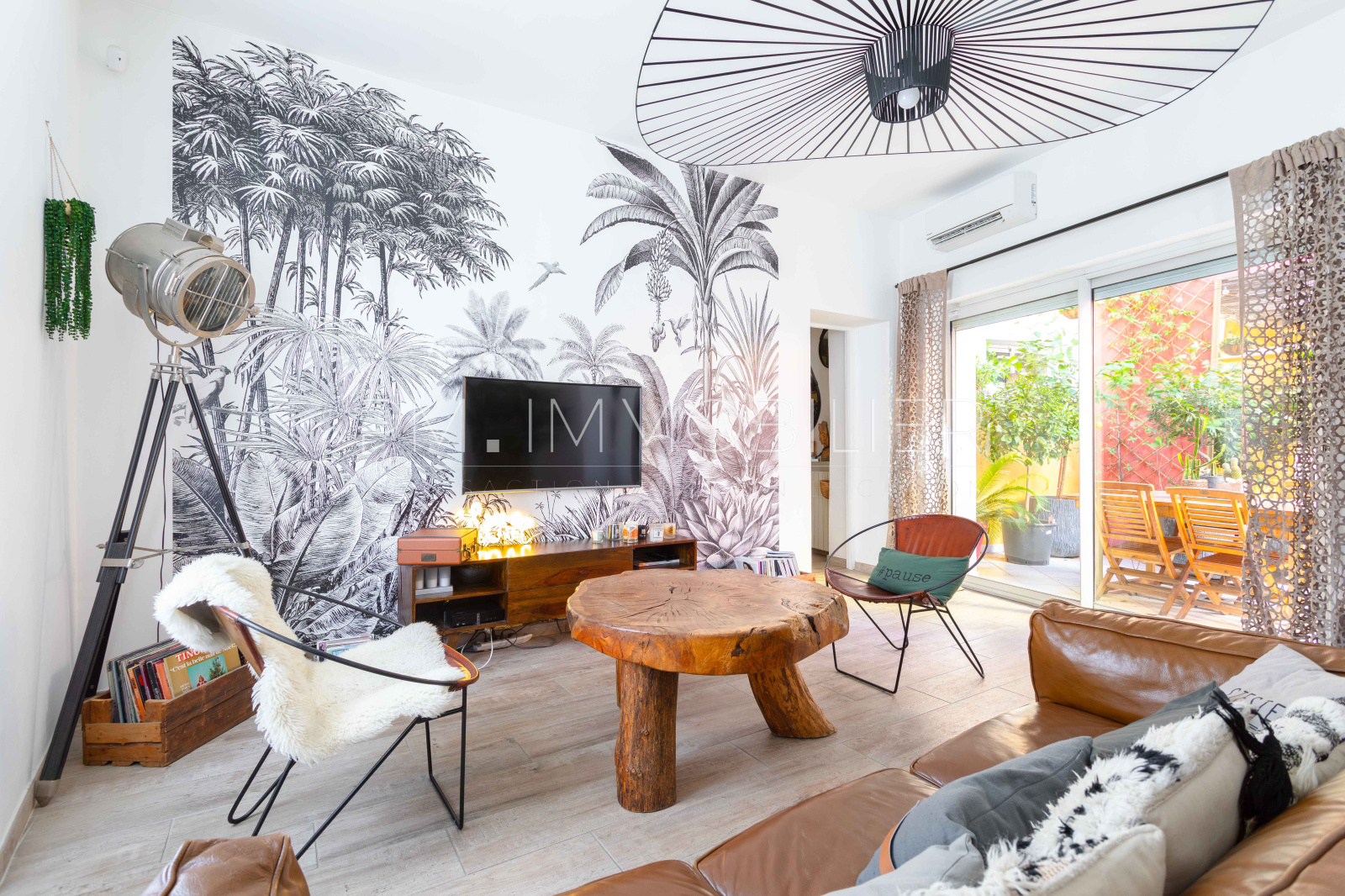 Une entrée intime dessert l'accès principal de la maison, abritant une chaleureuse pièce de vie de 40m² ornée d'un papier peint tropical sublimant le mobilier et donnant sur une cuisine américaine, le tout s'ouvrant sur une terrasse exposée ouest de 17m². Une chambre ainsi qu'une salle de bain et des wc composent le rez-de-chaussé.