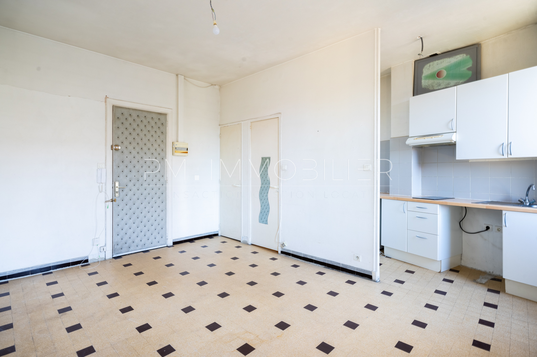 On arrive directement sur une pièce principale suffisamment spacieuse pour accueillir un salon et, pourquoi pas, un coin chambre. Une kitchenette aménagée et semi équipée se trouve habilement placée dans un coin quasiment caché dans le séjour et baigné de lumière.