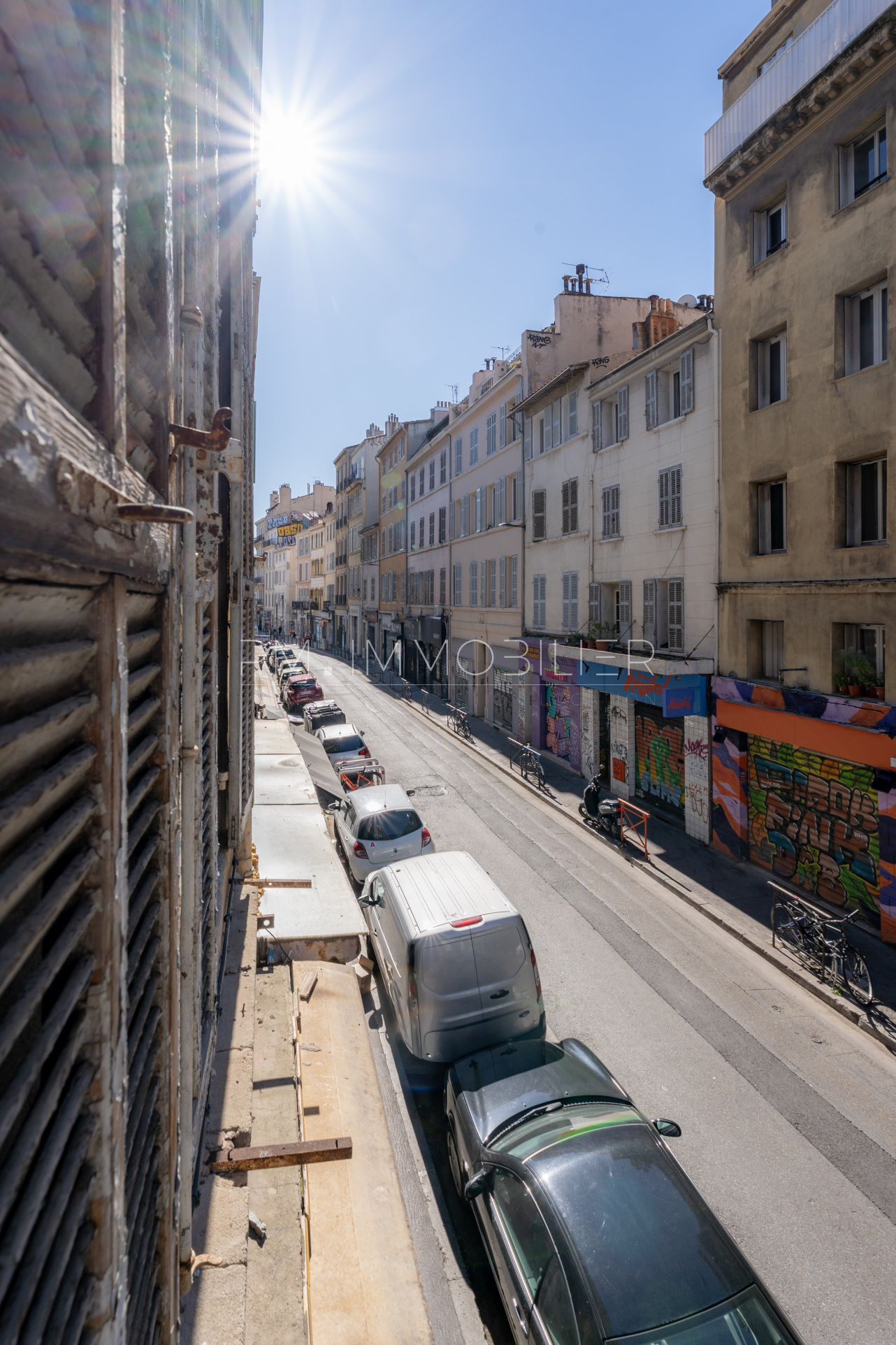Architecture marseillaise traditionnelle pour cet immeuble situé dans un quartier central prisé à deux pas de la place Jean Jaurès, qui accueille au 1er étage sur 4 un appartement de type 1 de 40 m², aujourd’hui configuré en grand studio aux volumes généreux.