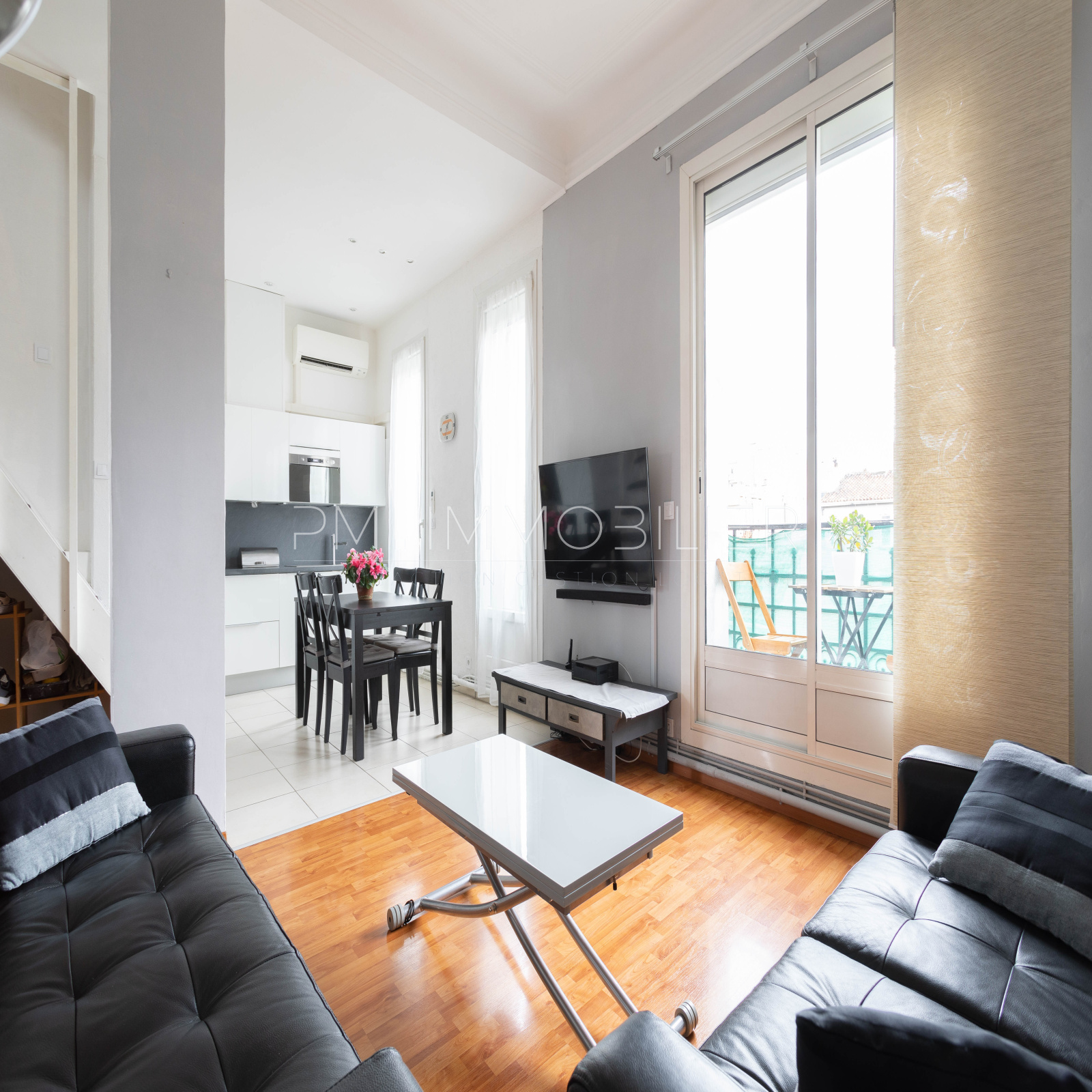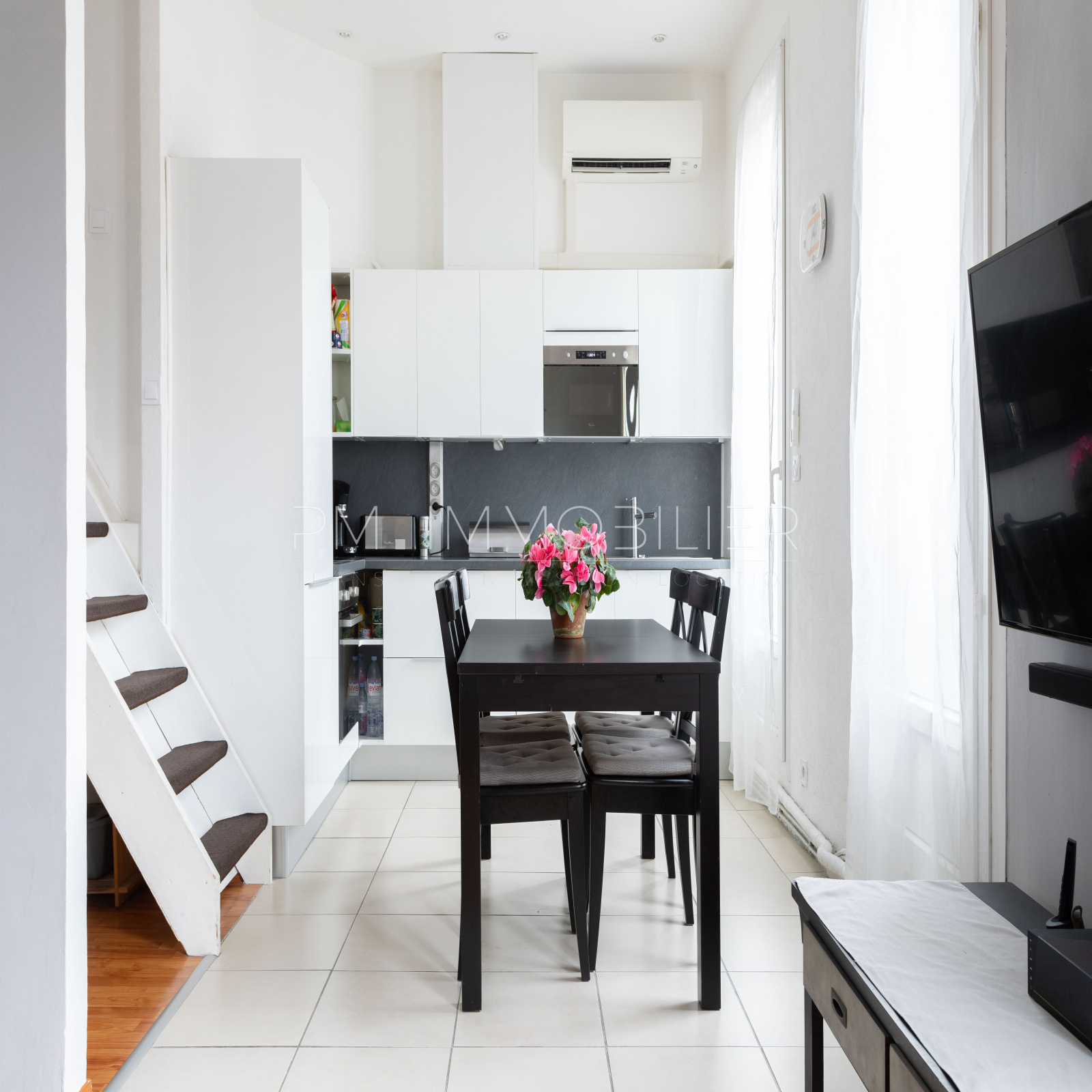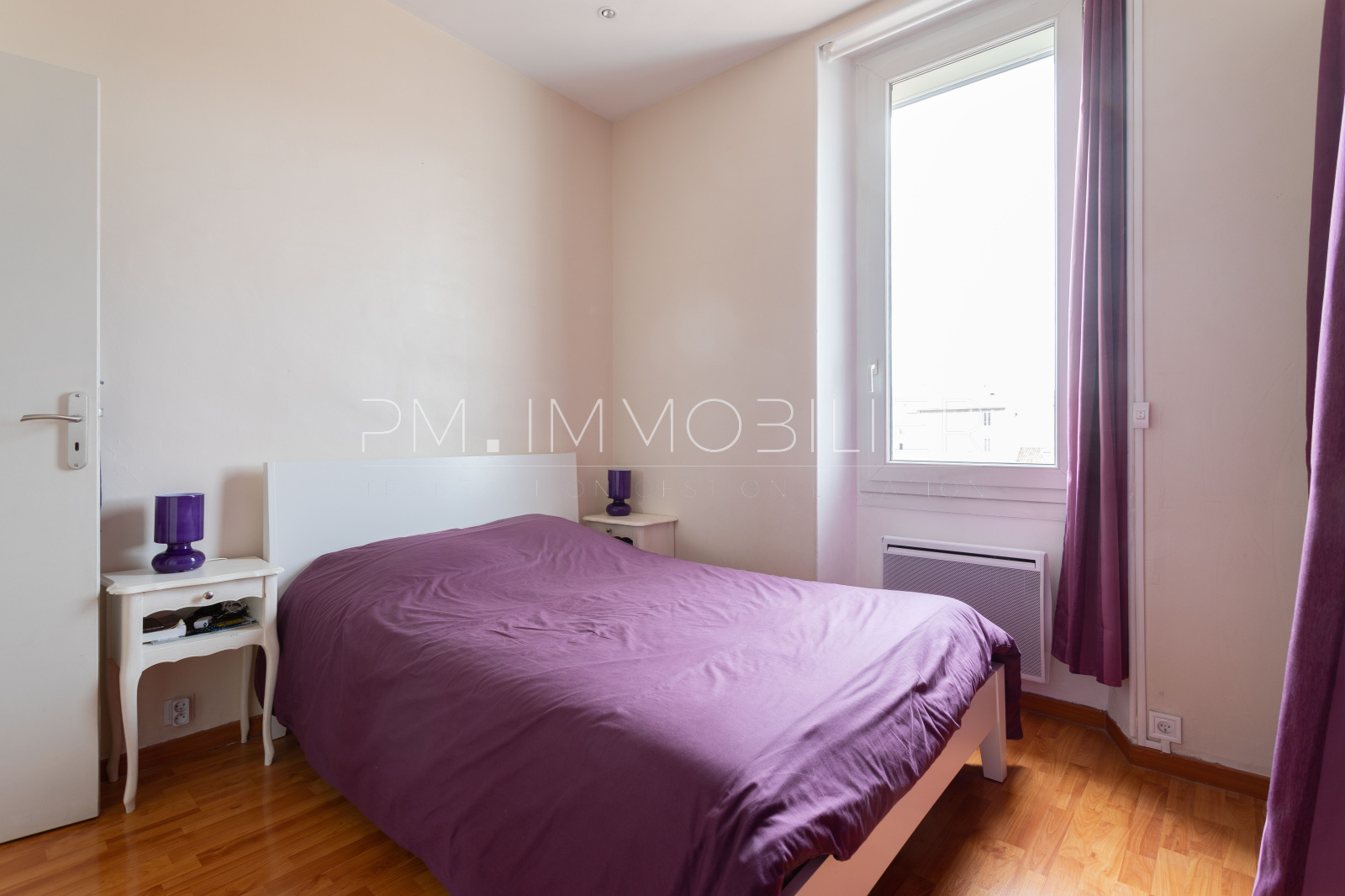 D'une surface de 65 m² il se compose coté cours de deux chambres de 10.57 et de 10.82m², côté rue d'un séjour cuisine de 25m² donnant sur agréable petit balcon et au centre d'une salle d'eau et de wc séparés.