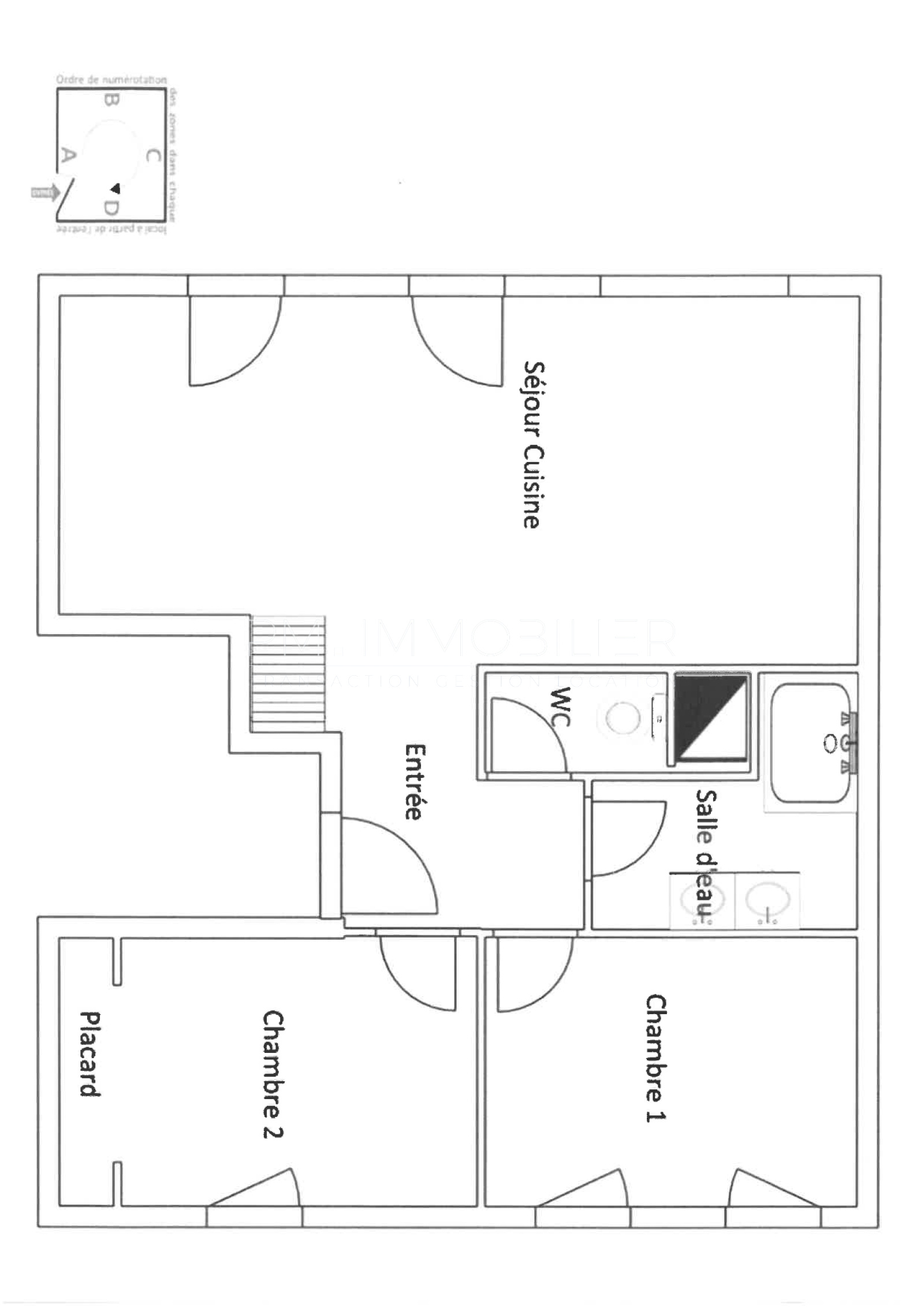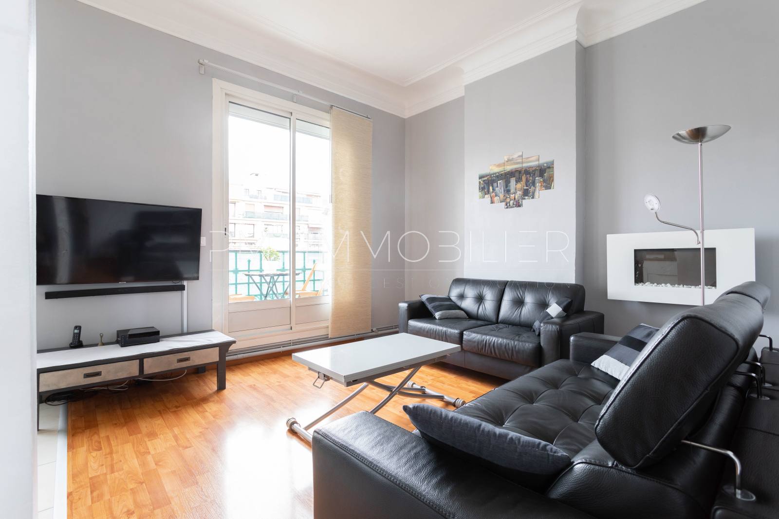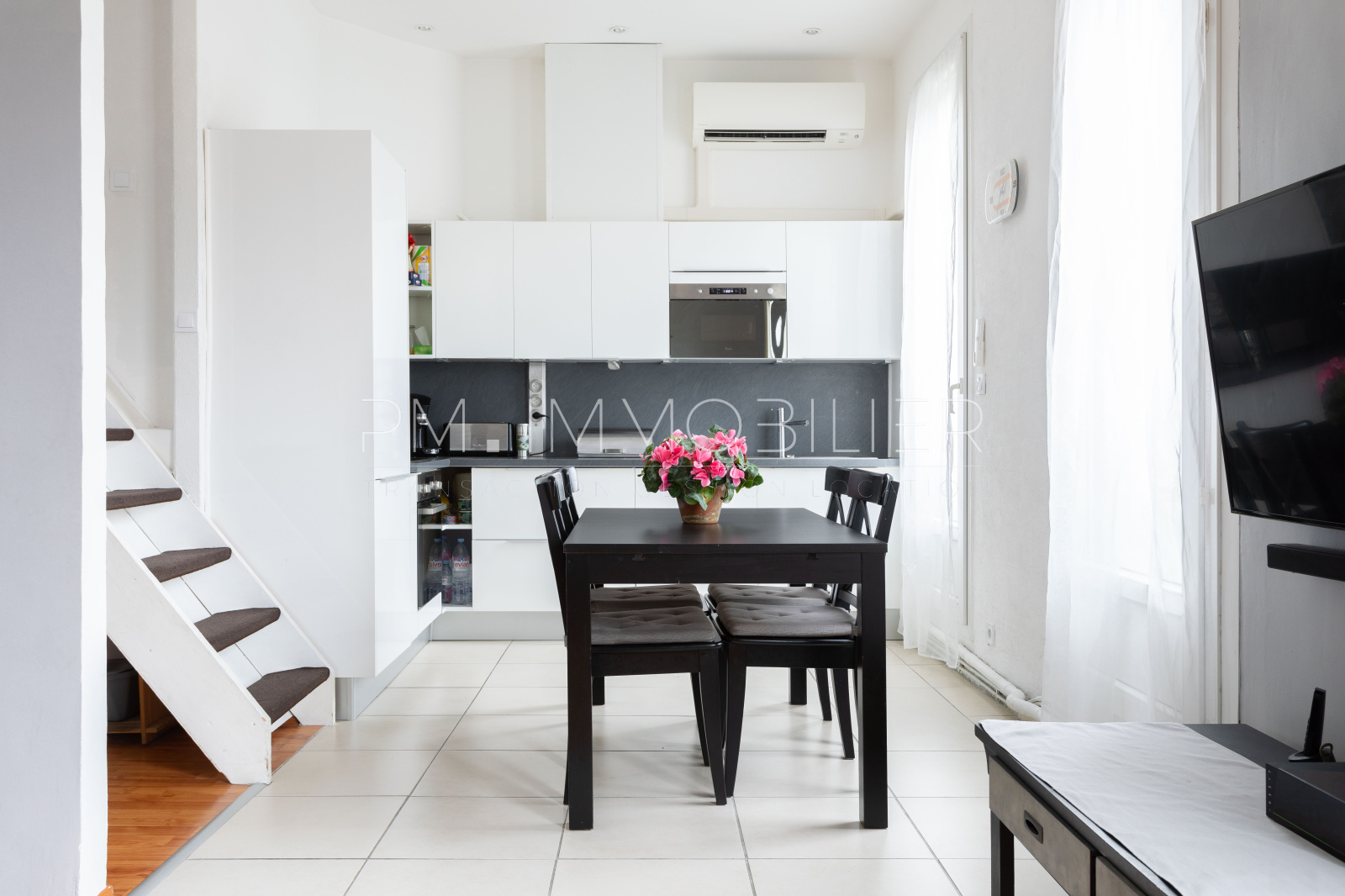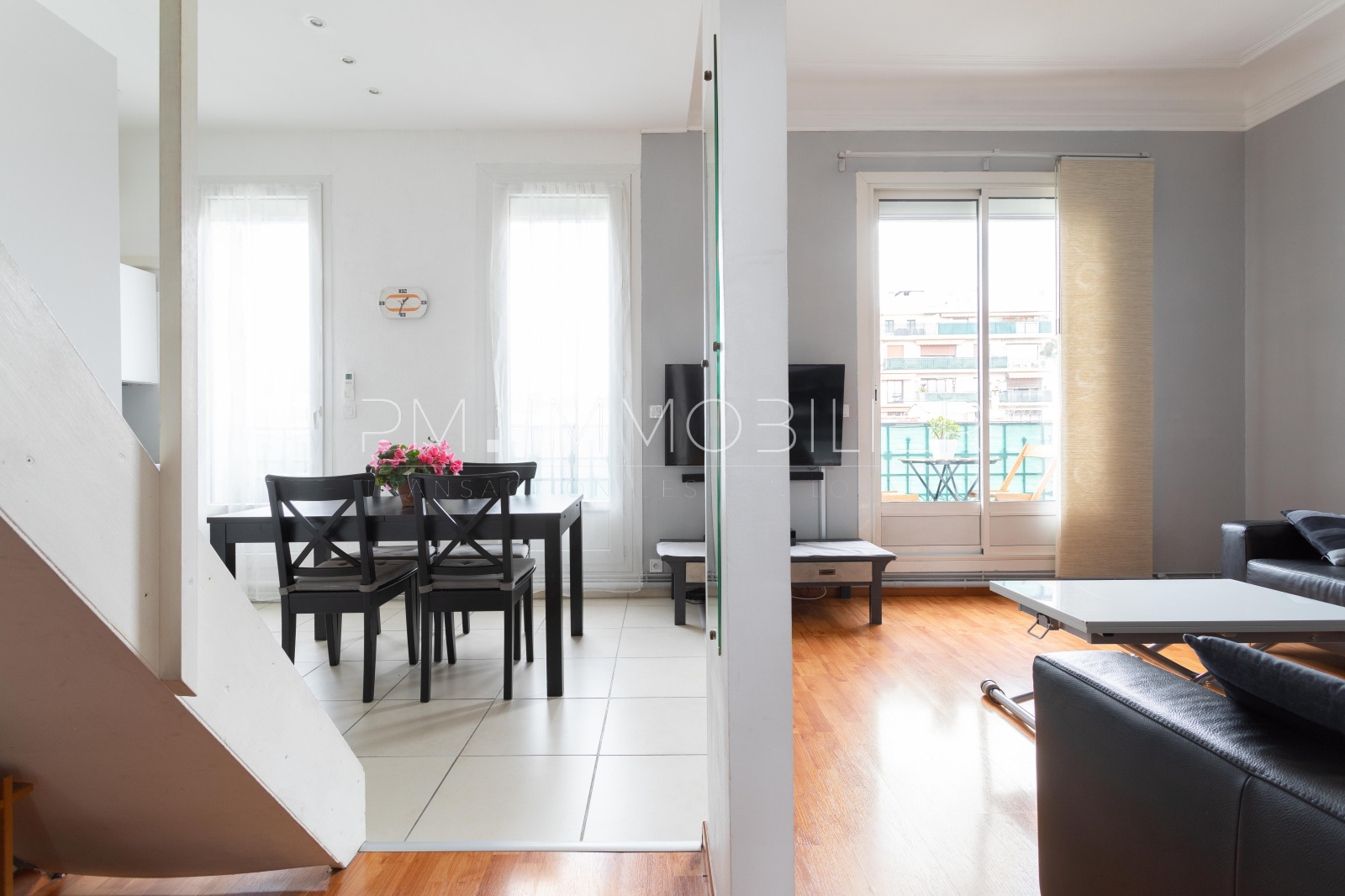 D'une surface de 65 m² il se compose coté cours de deux chambres de 10.57 et de 10.82m², côté rue d'un séjour cuisine de 25m² donnant sur agréable petit balcon et au centre d'une salle d'eau et de wc séparés.