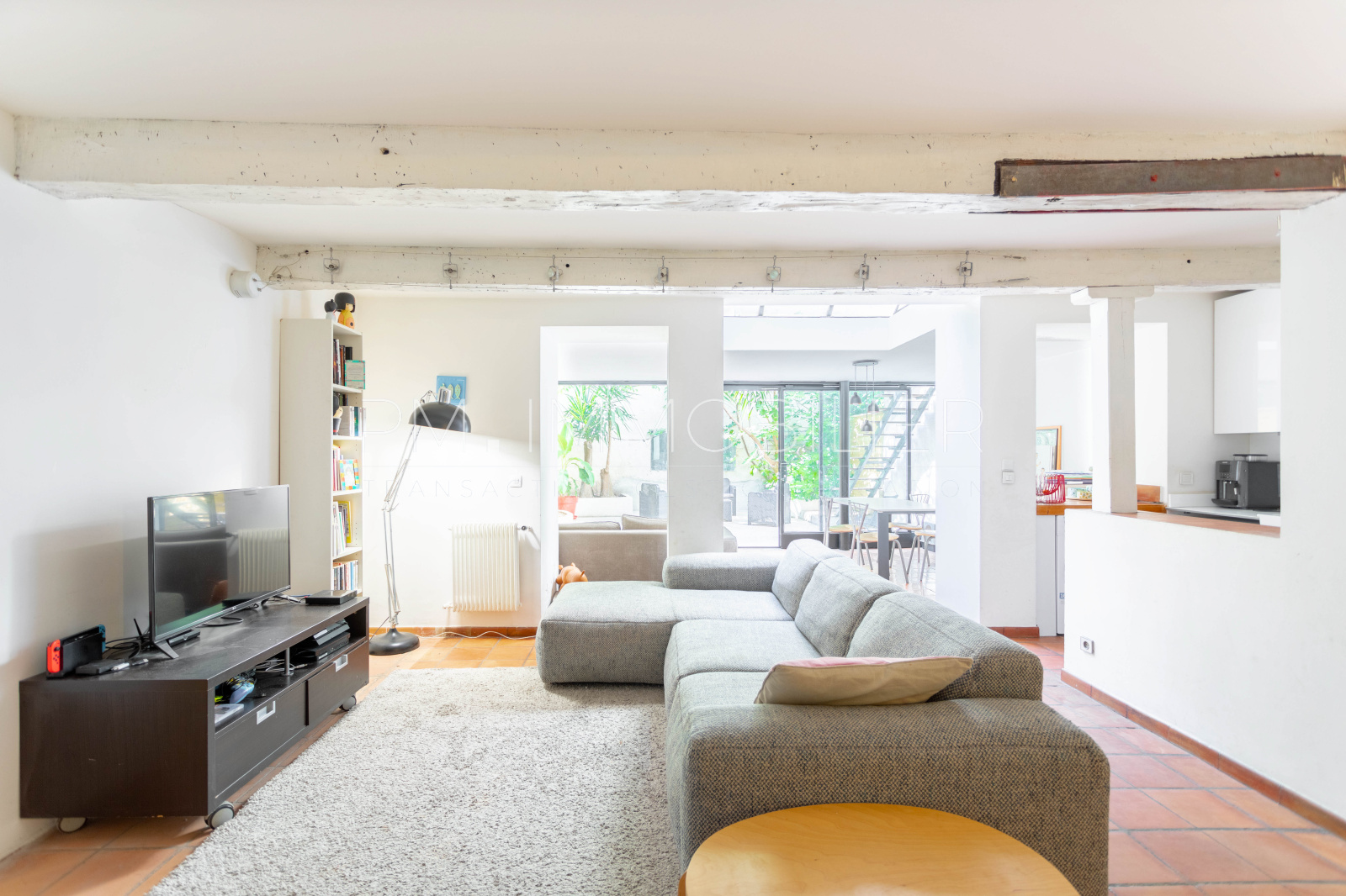 A l'étage en dessous, la pièce à vivre avec cuisine ouverte, magnifiquement baignée par la lumière de la verrière, nous projette directement vers le jardin. Celui-ci appelle à la détente grace à ses espaces arborés permettant des coins d'ombres quand le soleil est au zénith.