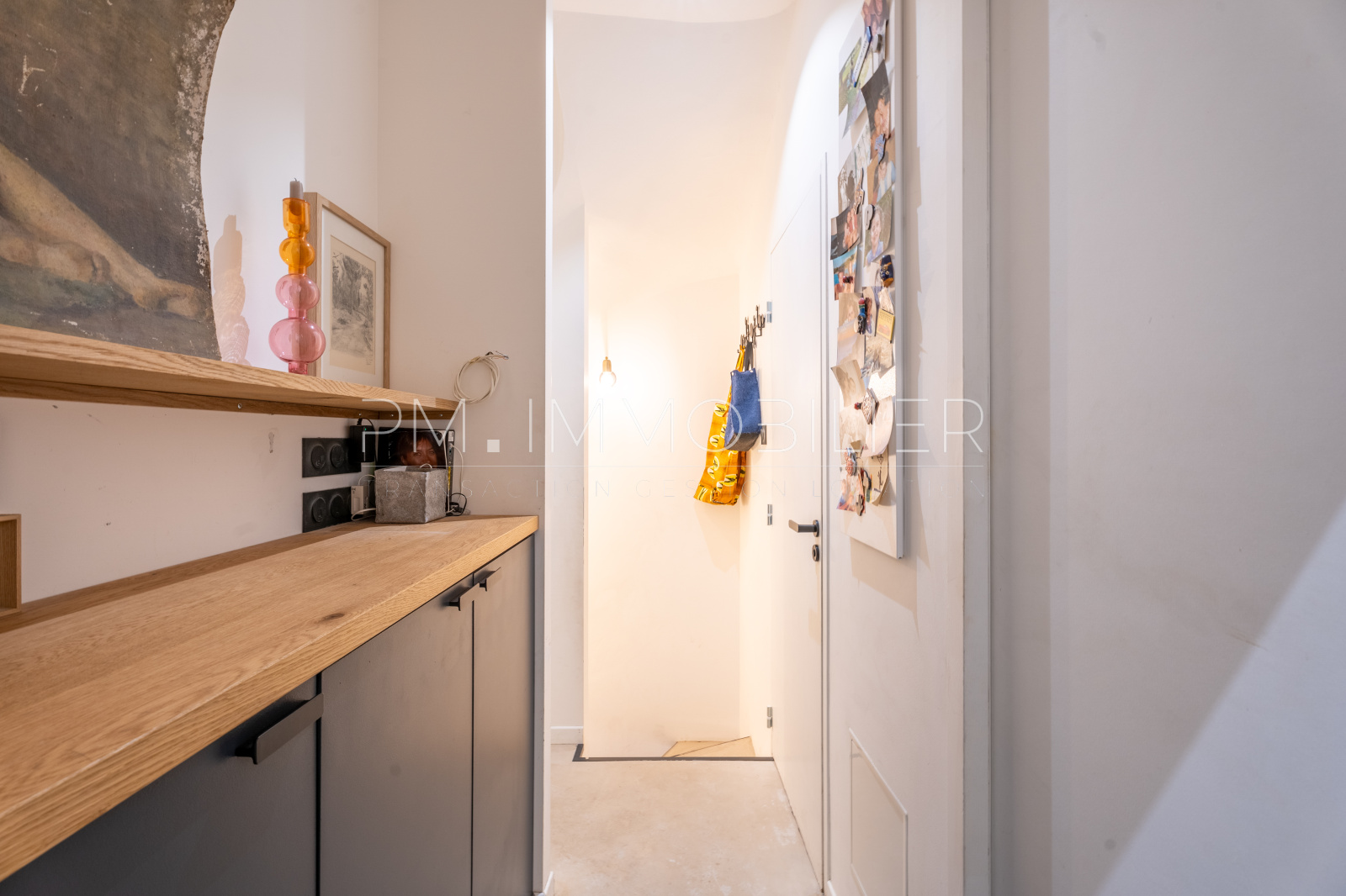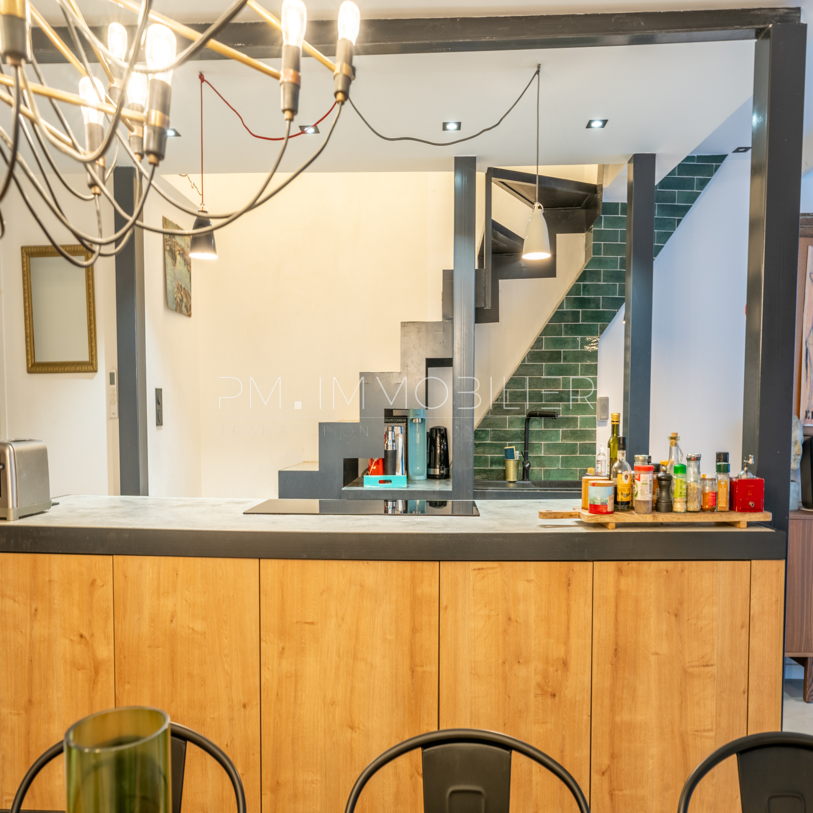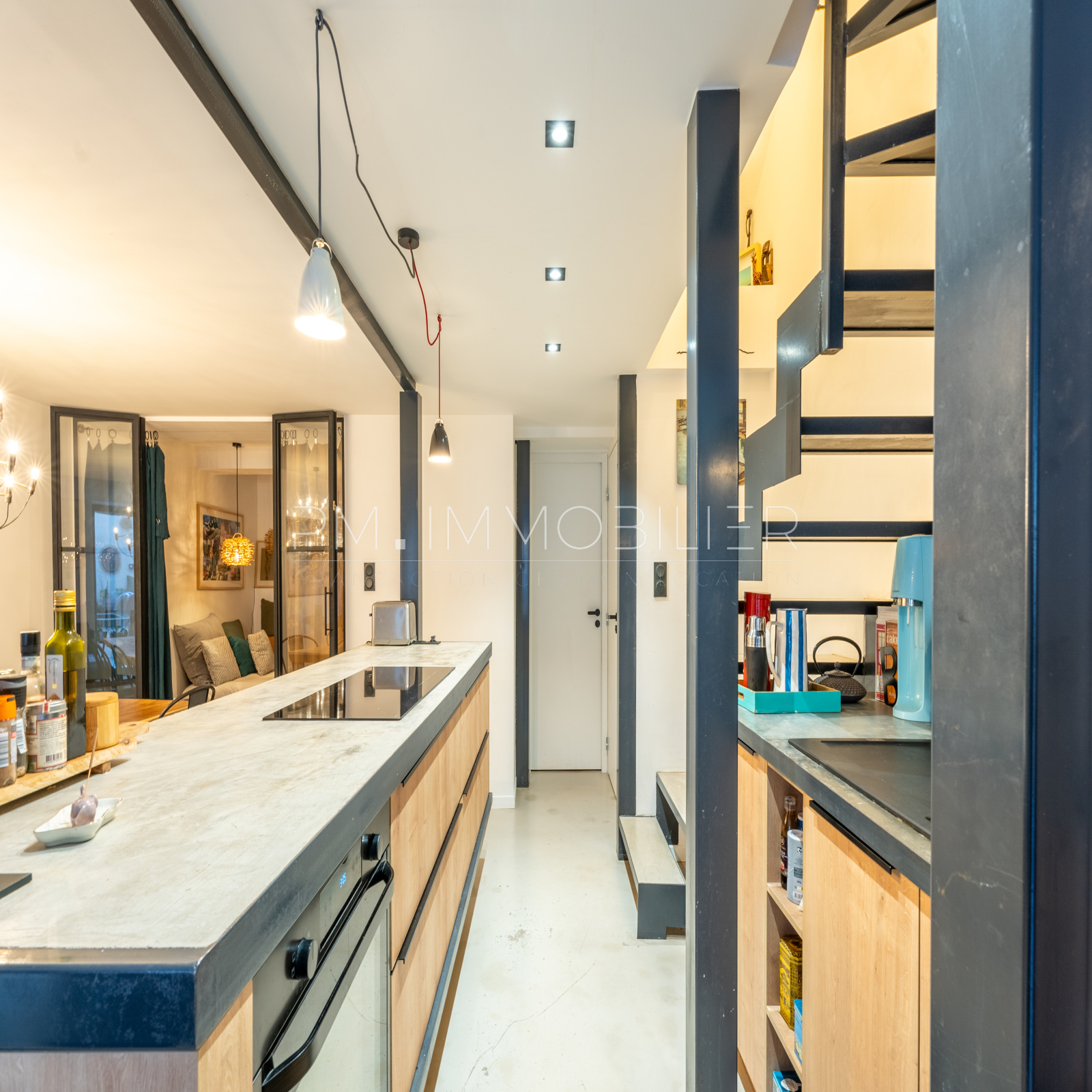 Totalement rénové en 2020 par un cabinet d'architecte, cet appartement dégage une ambiance très chaleureuse par les choix de sa décoration, qui mèlent divers matériaux comme le bois, le fer, le béton et le zellige et, par le choix également des coloris.