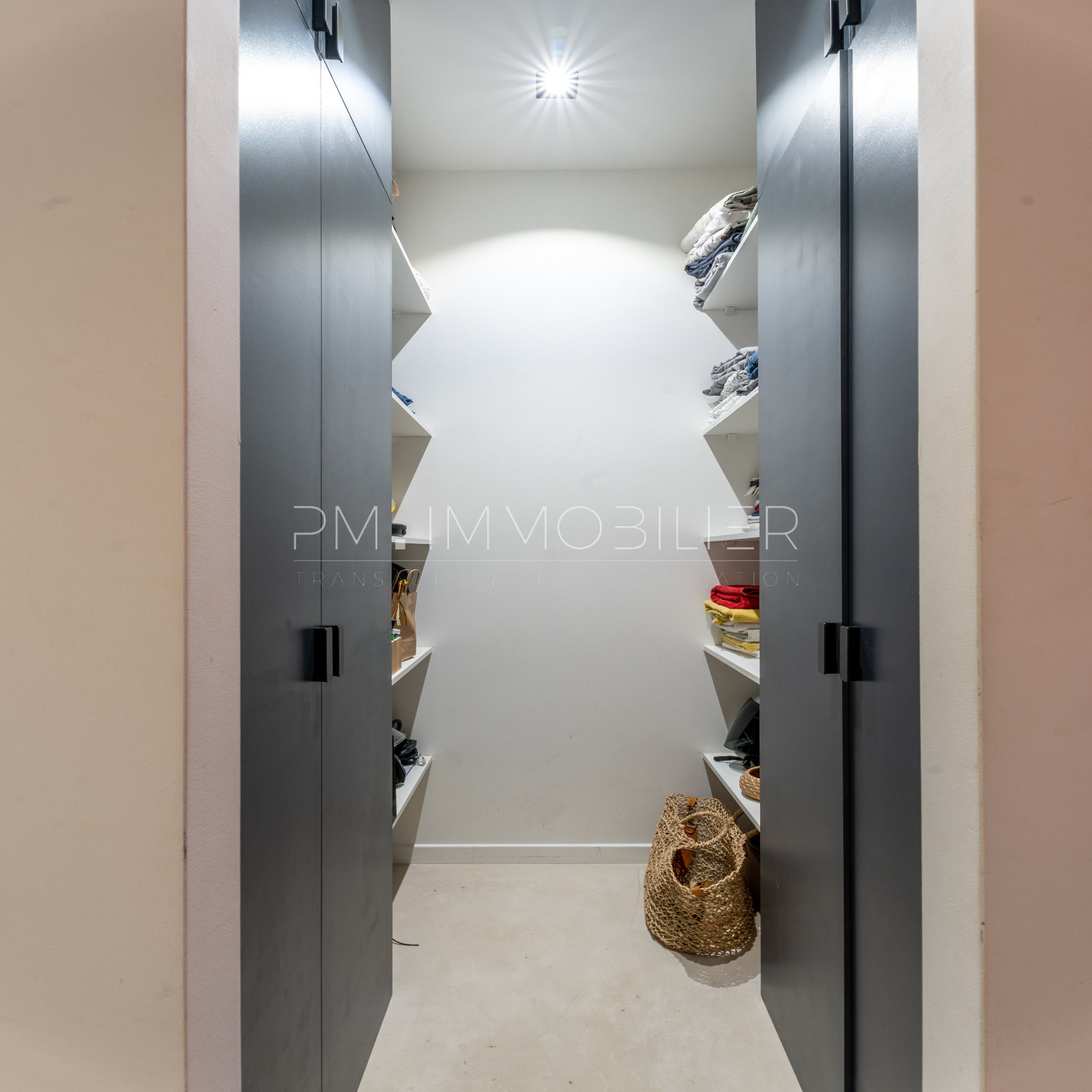 Une première suite parentale, d'une superficie de 16m2, avec sa salle de bain ouverte, habillée de bois et de zelliges bleus, donne un air de vacances. Un dressing caché de 3m2 complète cette chambre. Cette pièce est lumineuse et donne côté jardin, au calme, au dessus de sa propre terrasse et avec une vue dégagée sur les toits.