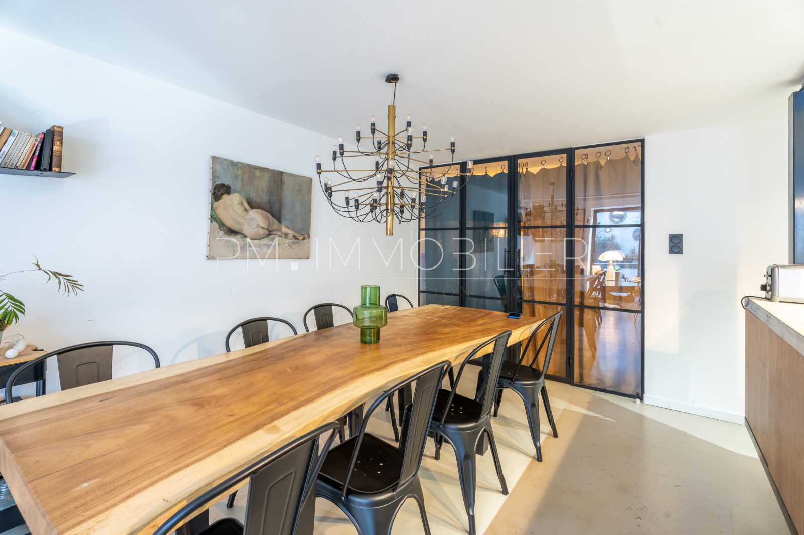 La cuisine ouverte est revêtue de bois, de fer et de béton et se pare d'un ilôt central suspendu dans les mêmes matériaux et constitue un véritable objet d'art dans cette pièce.