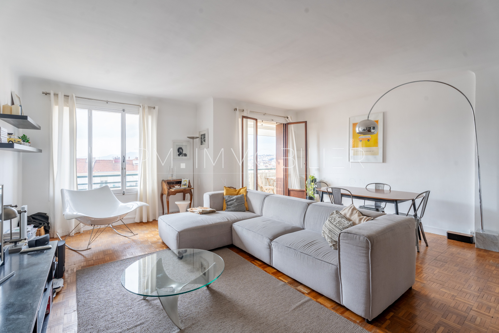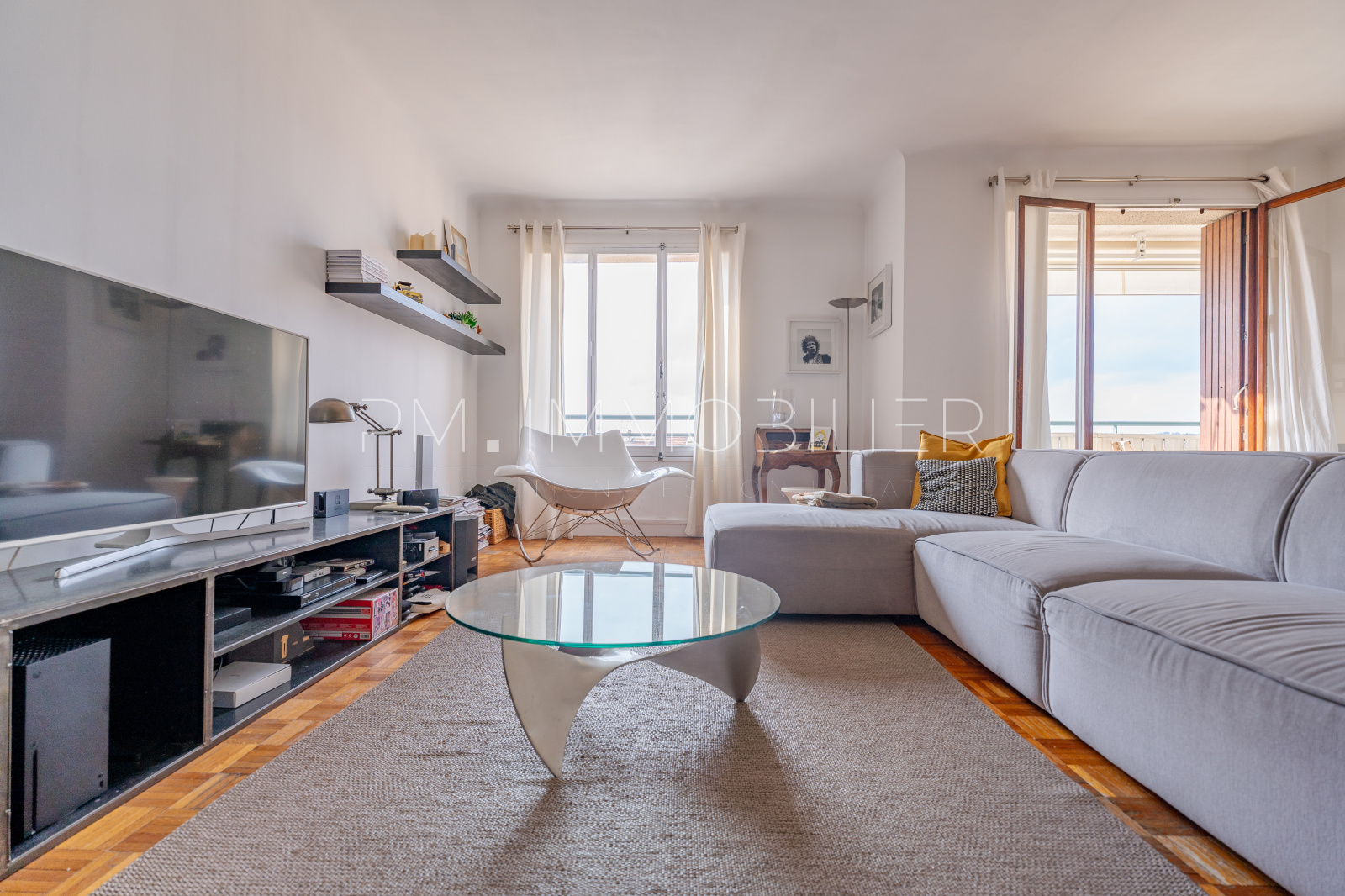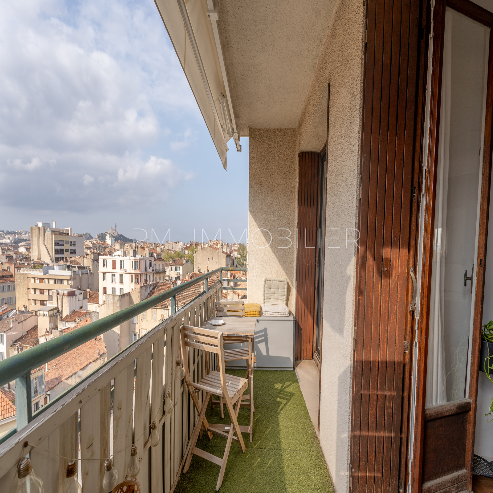 Architecture des années 60 pour cet immeuble avec ascenseur situé au cœur du quartier du Camas qui accueille au 6ème étage sur huit, un appartement traversant de 105 m² qui offre une vue imprenable sur les collines et la ville, avec en toile de fond la célèbre Notre-Dame de la Garde.