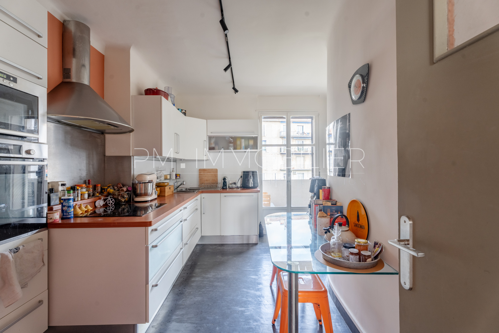 La cuisine moderne de 11,40 m² est fermée mais bénéficie d'une porte-fenêtre donnant sur une loggia, créant un bel espace convivial.