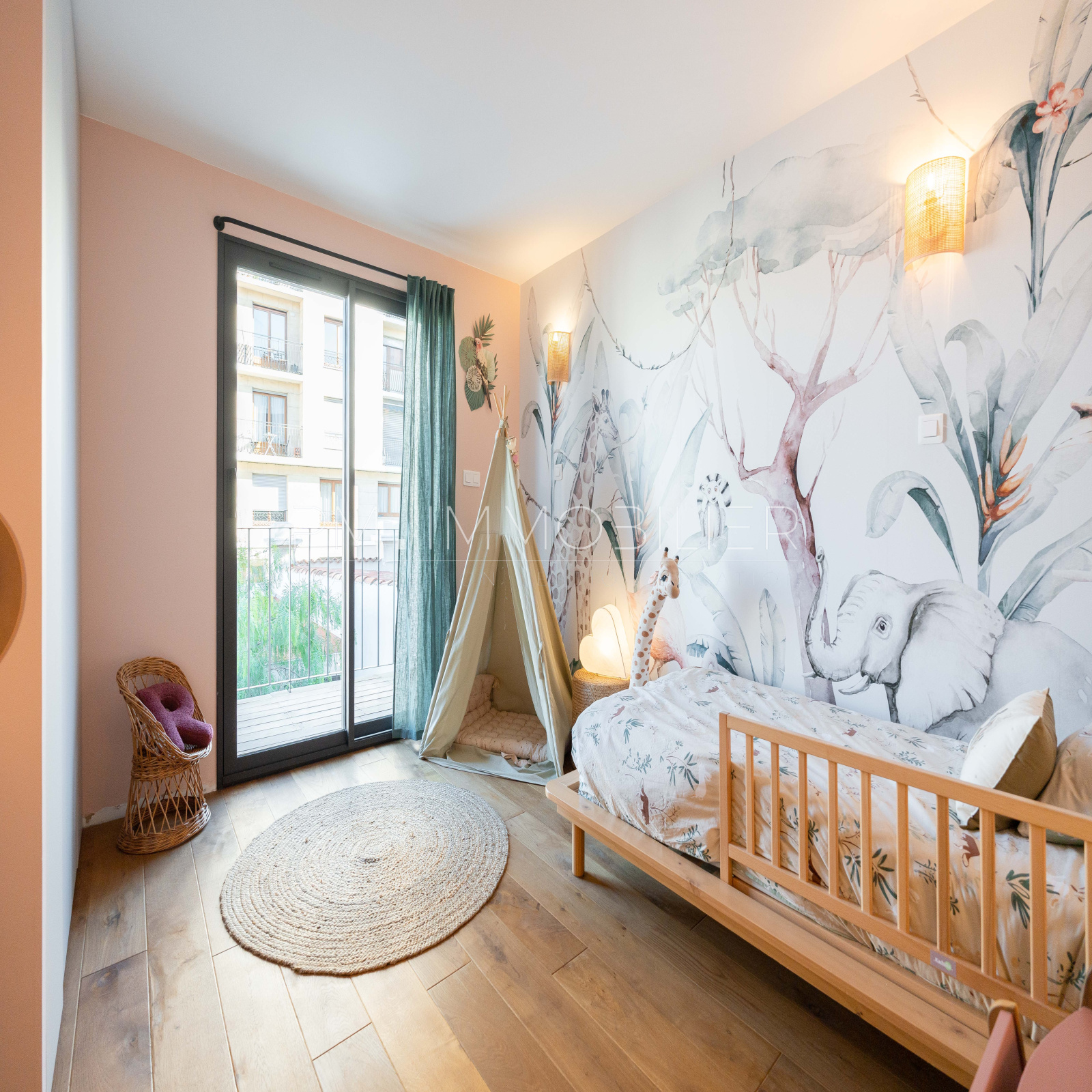 Au premier, un espace dédié aux enfants avec trois belles chambres de 12 m2 chacune, se partageant une salle de bain aux matériaux bruts et s'articulant autour d'une terrasse lumineuse de 7 m2.