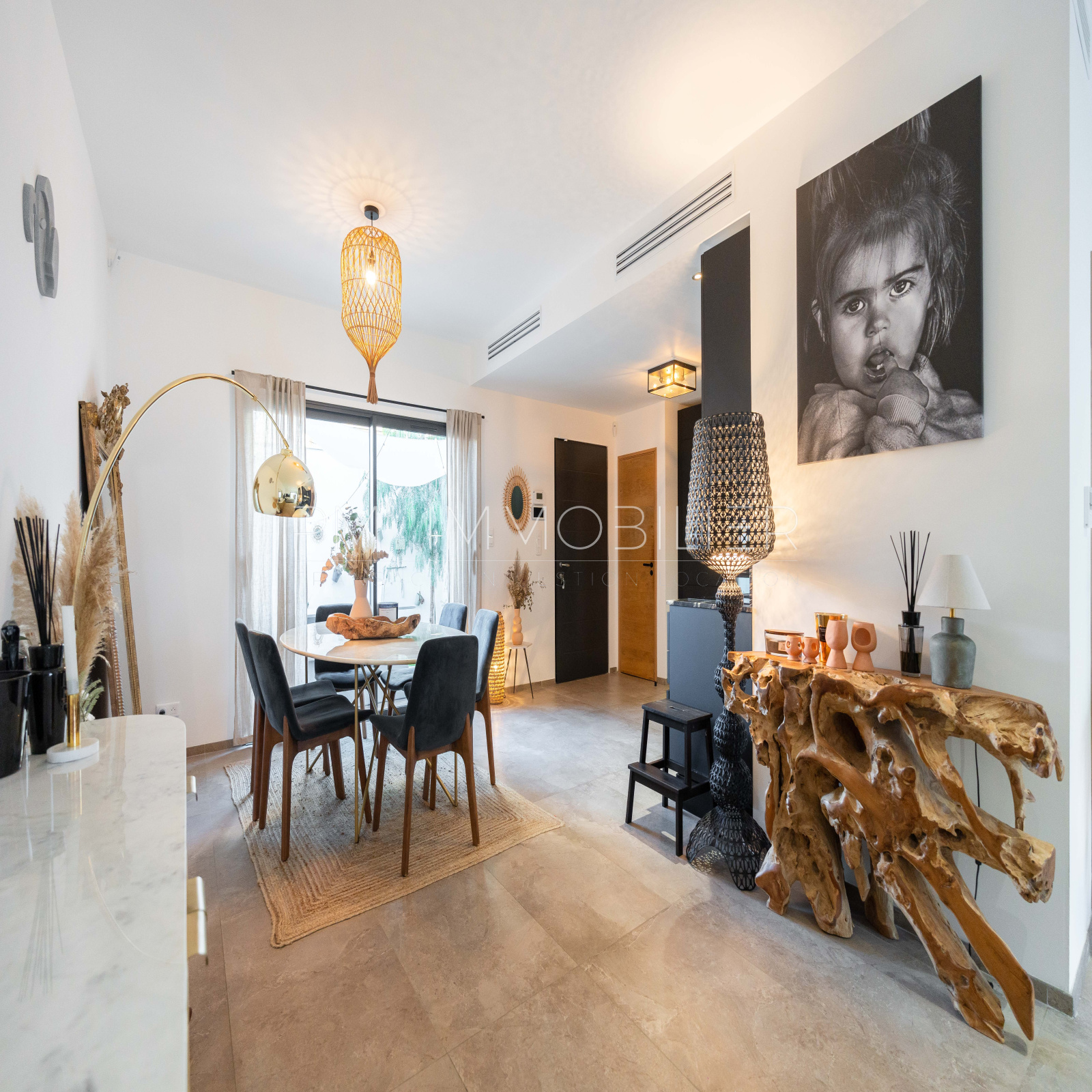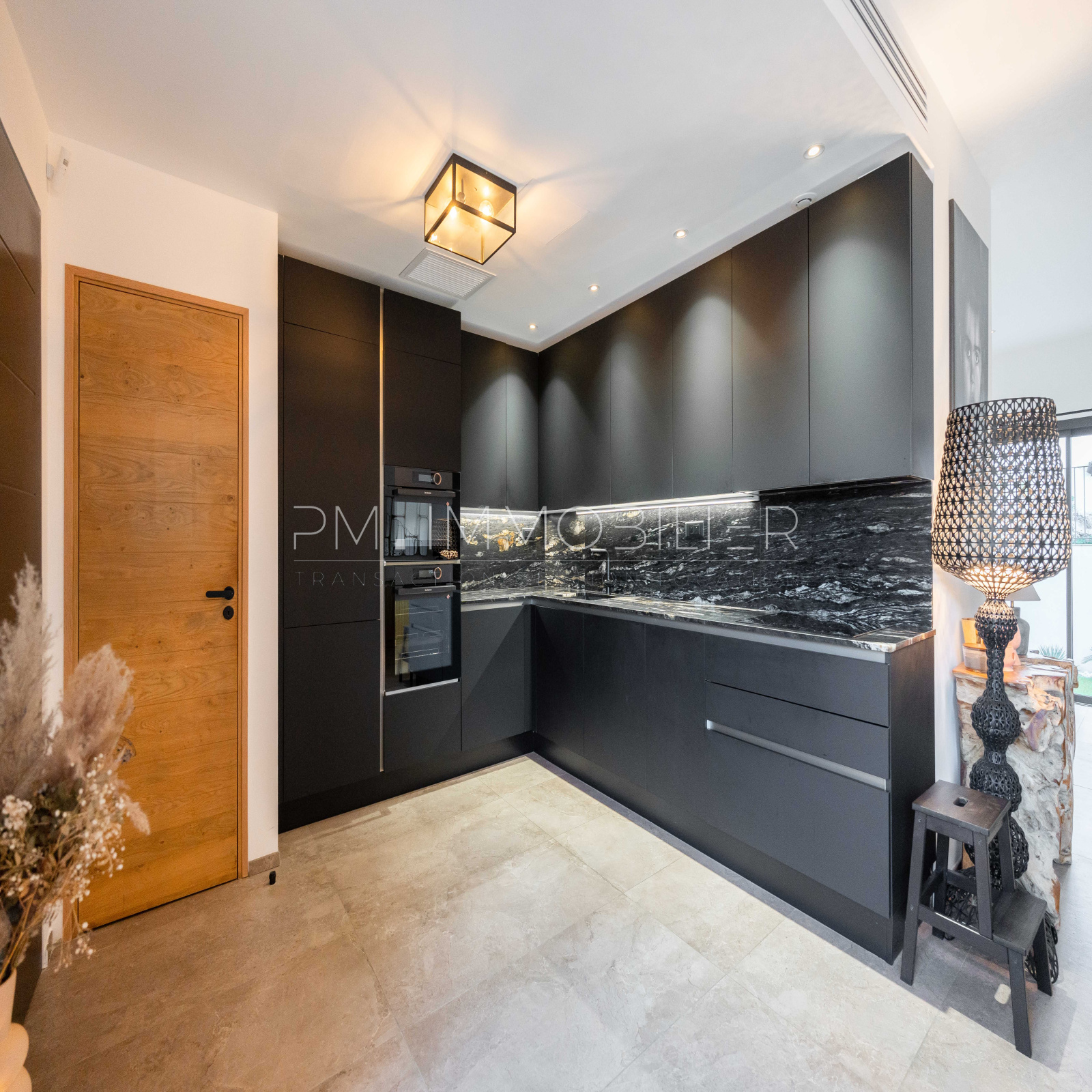 Passée la porte, l'on découvre une cuisine épurée noire matte, aux matières délicates avec plan de travail en quartz noir et électroménagé dernière génération. Dans la continuité, la salle à manger avec accès au premier jardin, puis le séjour spacieux et lumineux s'ouvrant sur un des jardin au calme absolu piscine chauffée en pierres de Bali avec filtration au sel ou au chlore.