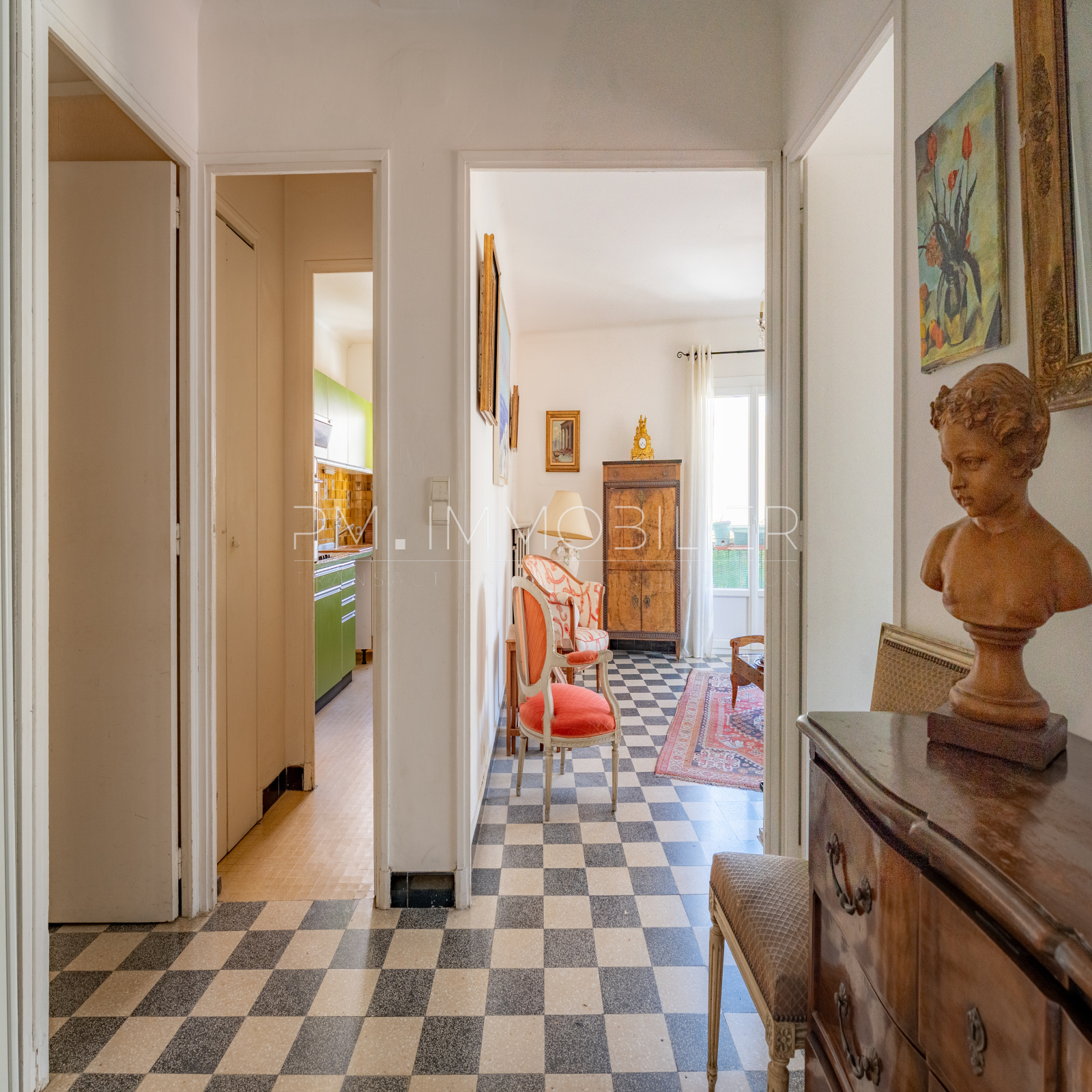 Dès l’entrée, le charme opère avec ses sols graphiques en damier, ses volumes généreux et sa luminosité omniprésente. Le séjour, spacieux et baigné de lumière, s’ouvre sur un agréable balcon exposé plein sud, offrant une vue dégagée et une atmosphère chaleureuse tout au long de la journée. La cuisine indépendante et fonctionnelle, au style délicieusement rétro, pourra facilement être repensée selon vos envies.