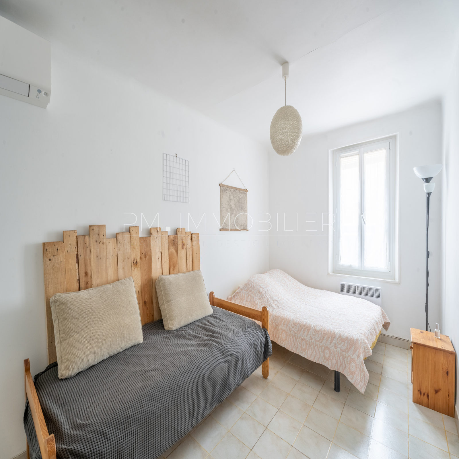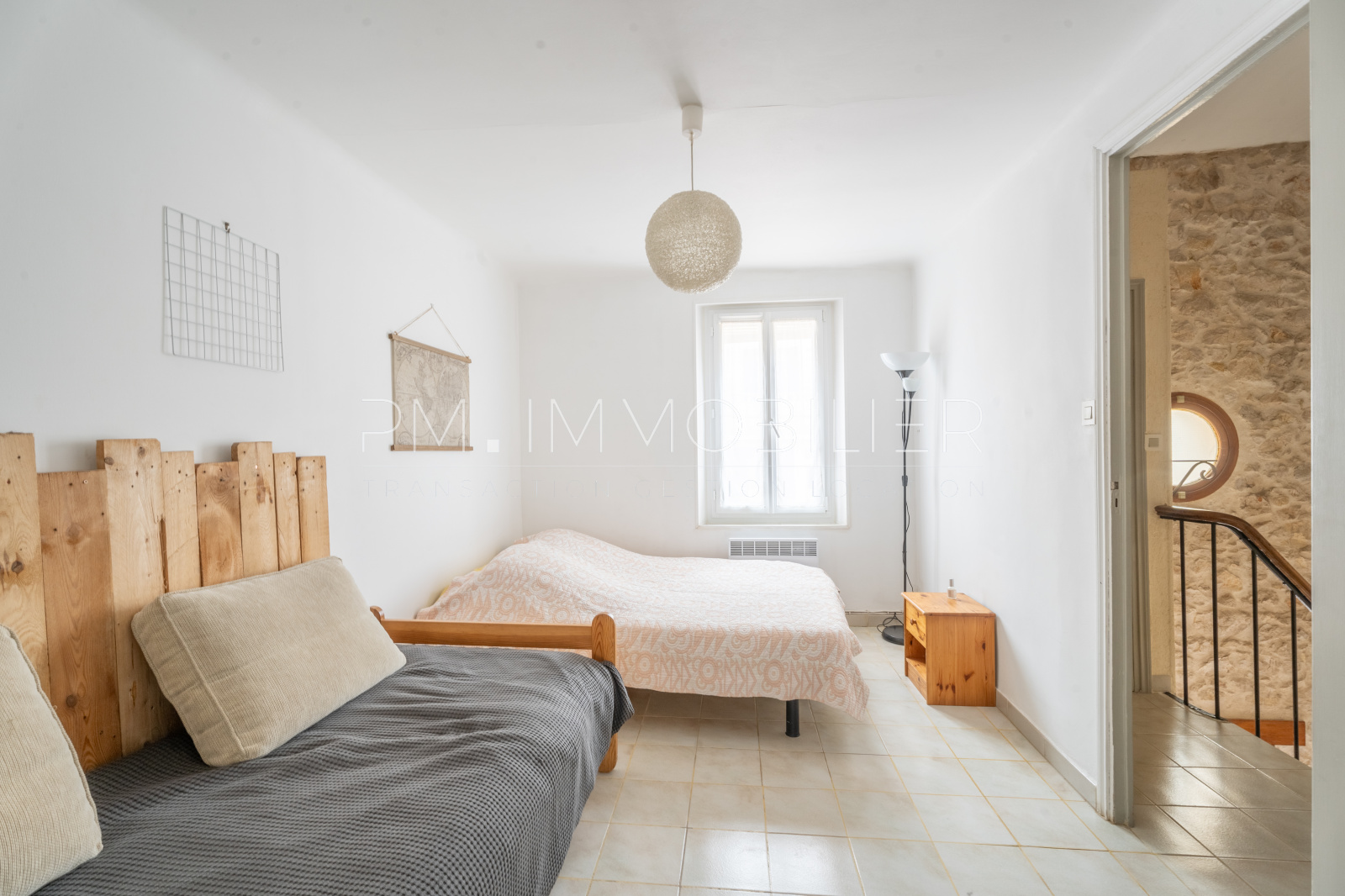 À l'étage, un bel escalier avec une rampe en fer et bois mène à un hall spacieux qui peut accueillir un coin salon supplémentaire. L’espace nuit comprend deux chambres de belle taille et une salle d’eau avec double vasque et WC.
