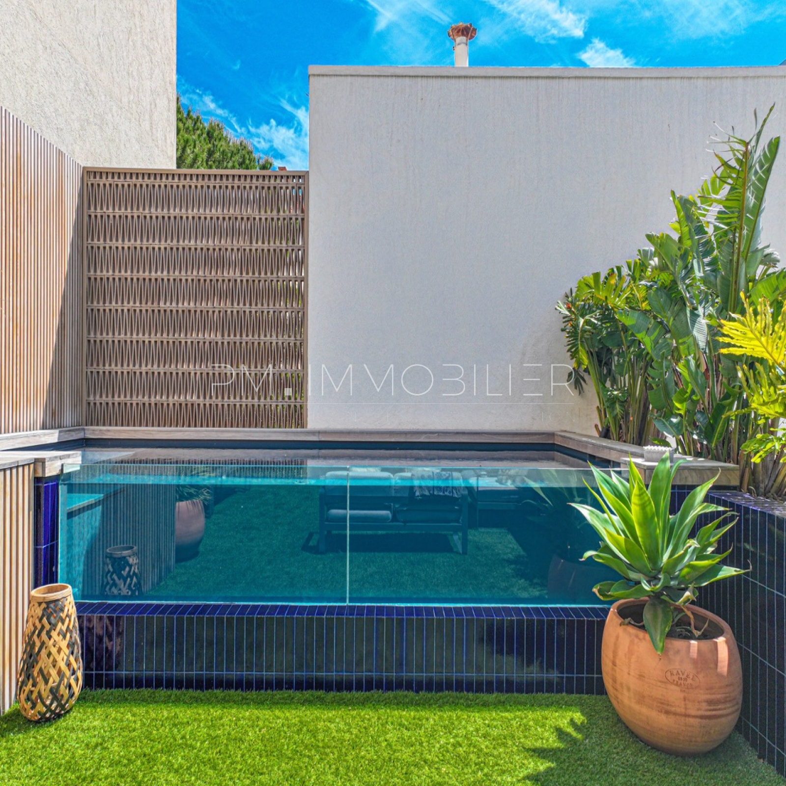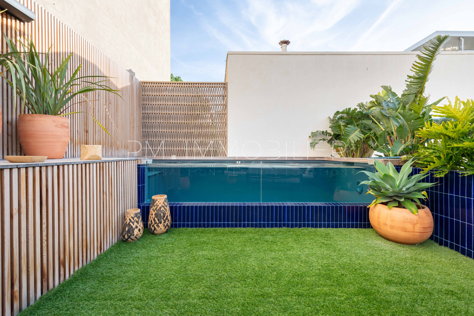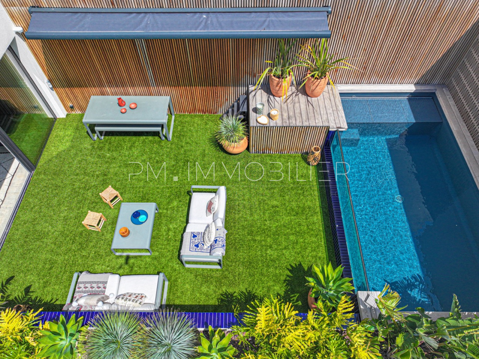 Ce magnifique espace de vie s'ouvre sur une terrasse de 60 m², exposée plein sud, joliment arborée et décorée avec un mur en Red Cedar d'un côté et un mur en zellige bleu de l'autre. Une piscine hors-sol contemporaine est parfaitement intégrée dans cet espace extérieur.
