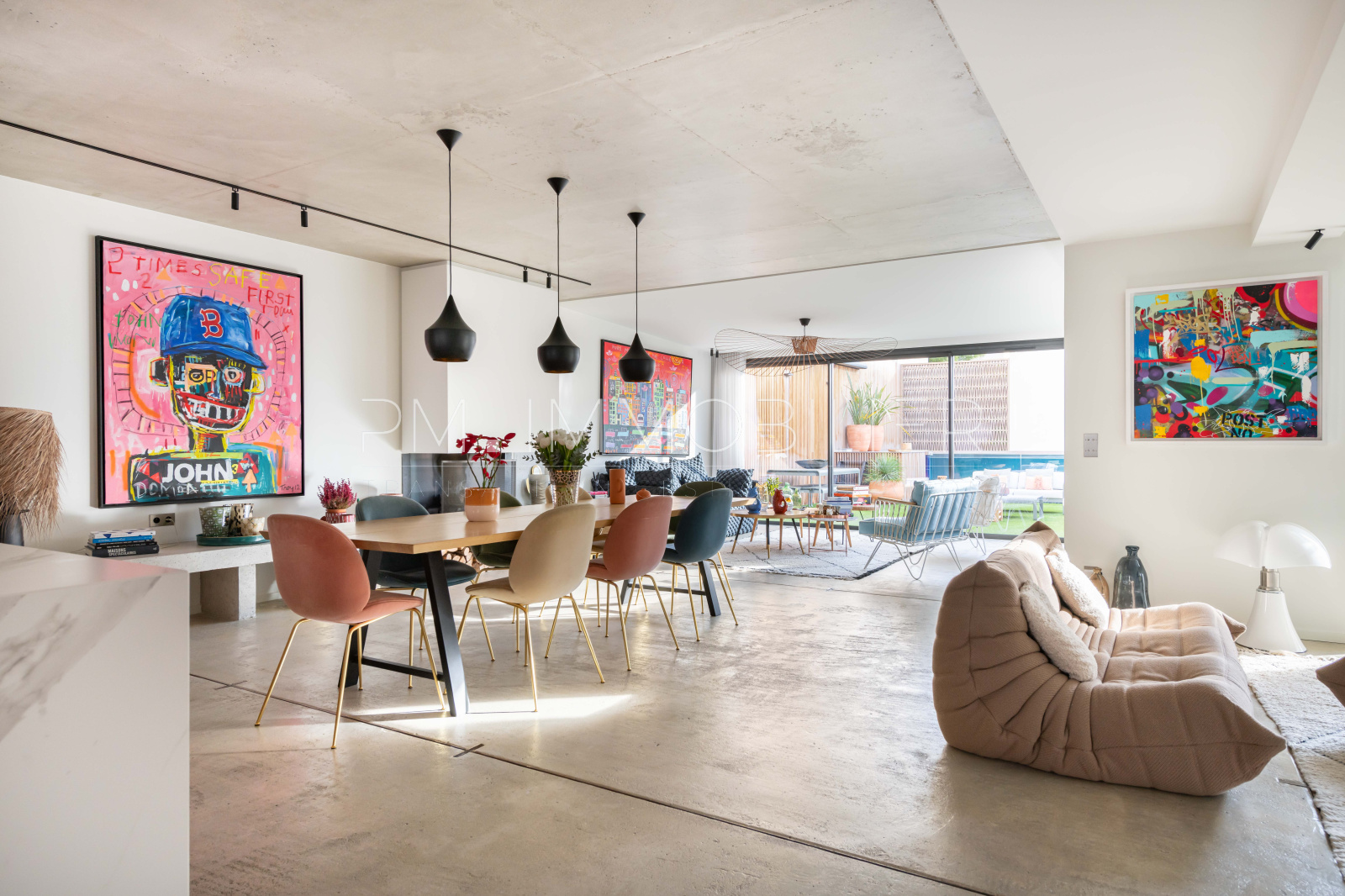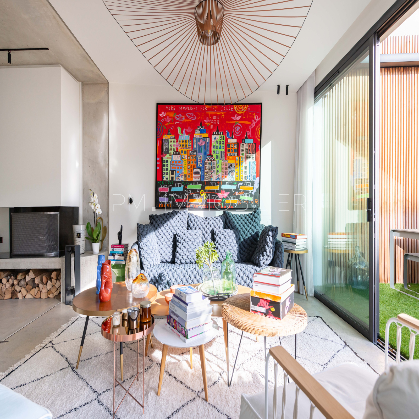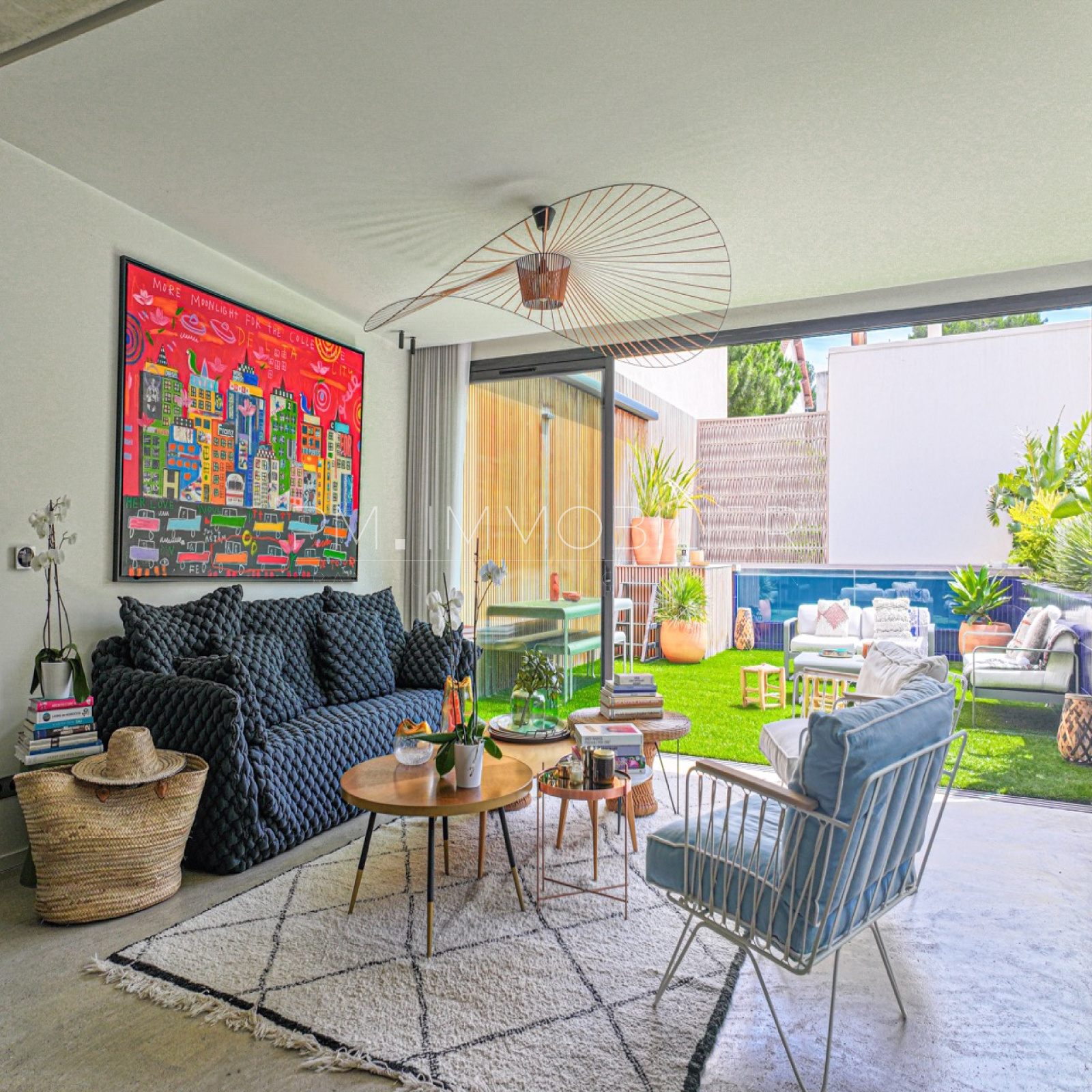 Ce magnifique espace de vie s'ouvre sur une terrasse de 60 m², exposée plein sud, joliment arborée et décorée avec un mur en Red Cedar d'un côté et un mur en zellige bleu de l'autre. Une piscine hors-sol contemporaine est parfaitement intégrée dans cet espace extérieur.