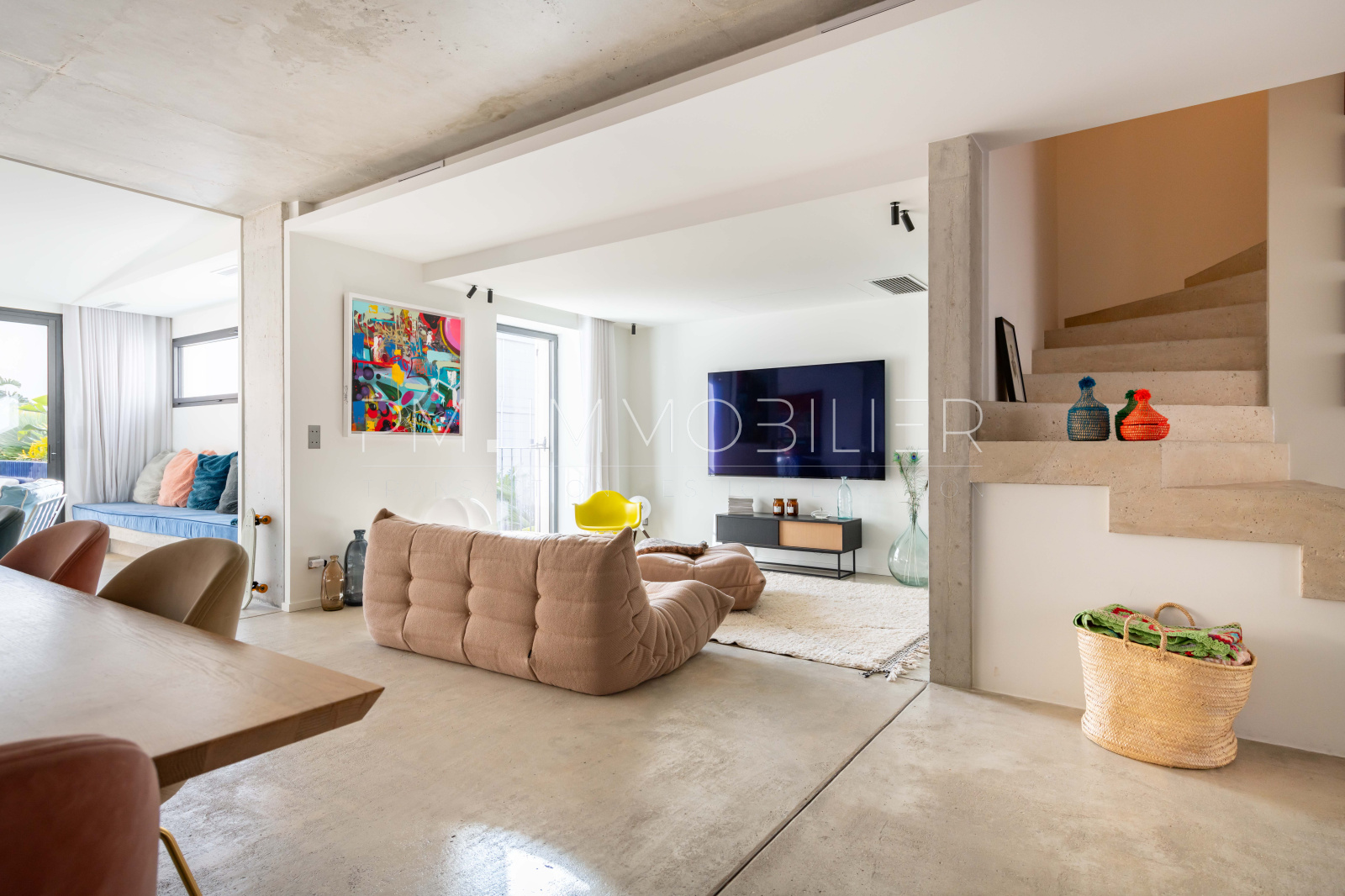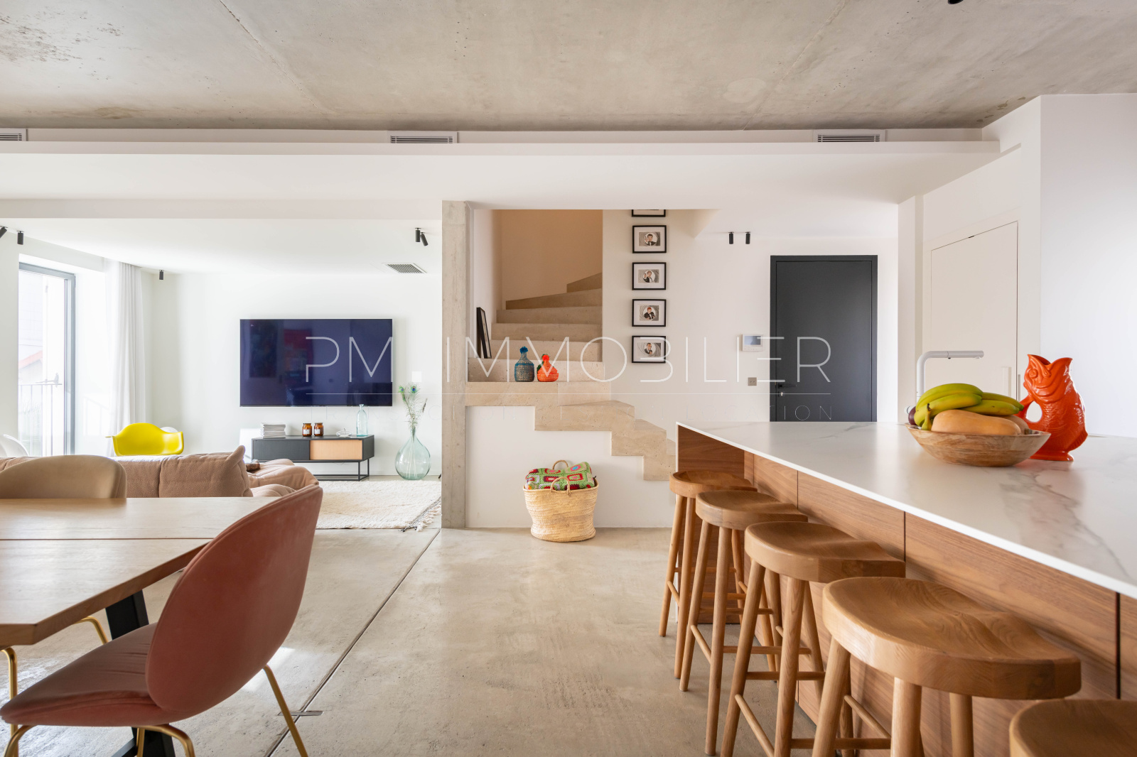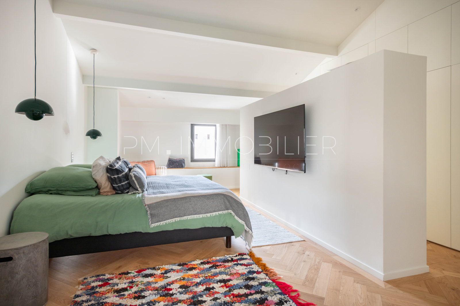 Tous les matériaux de cet appartement ont été soigneusement sélectionnés et sont de grande qualité : béton brut ou parquet en chevrons au sol, béton banché sur les murs, bois, carrelages Zellige et interrupteurs de la marque Meljac.