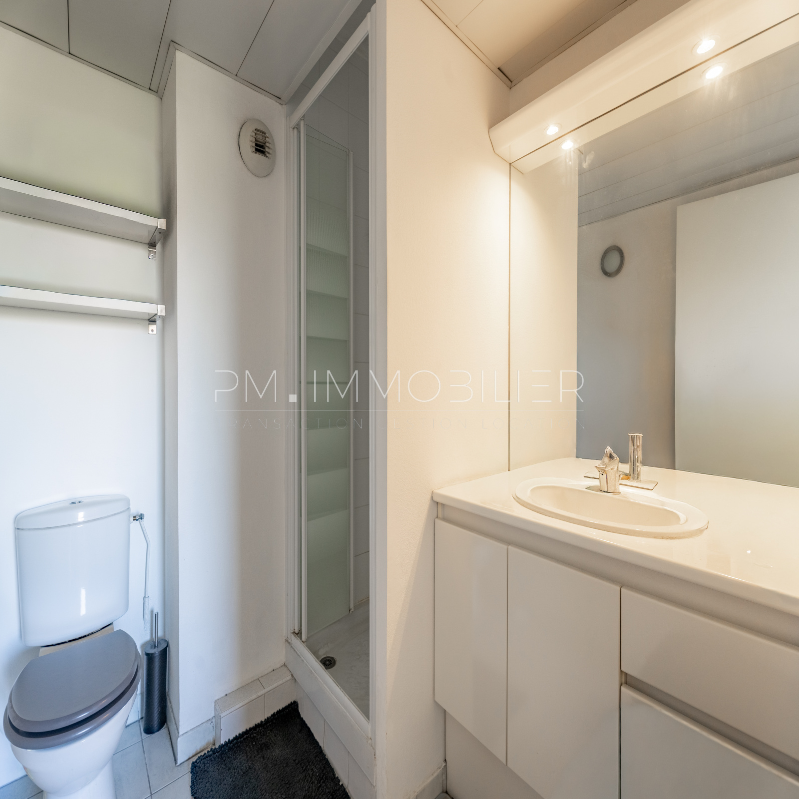 La chambre, au calme, dispose de rangements intégrés et d’un espace suffisant pour un coin bureau, tandis que la salle d’eau avec WC complète l’ensemble de manière pratique.