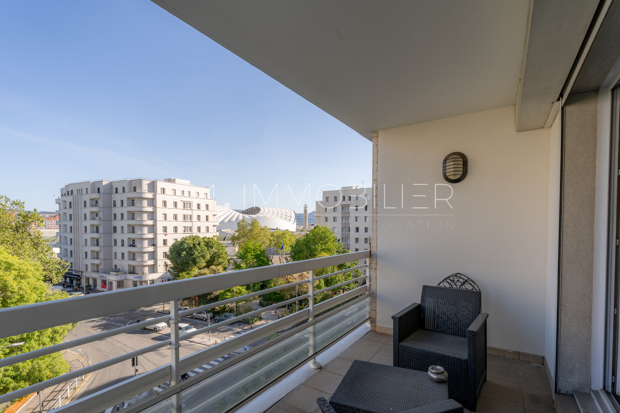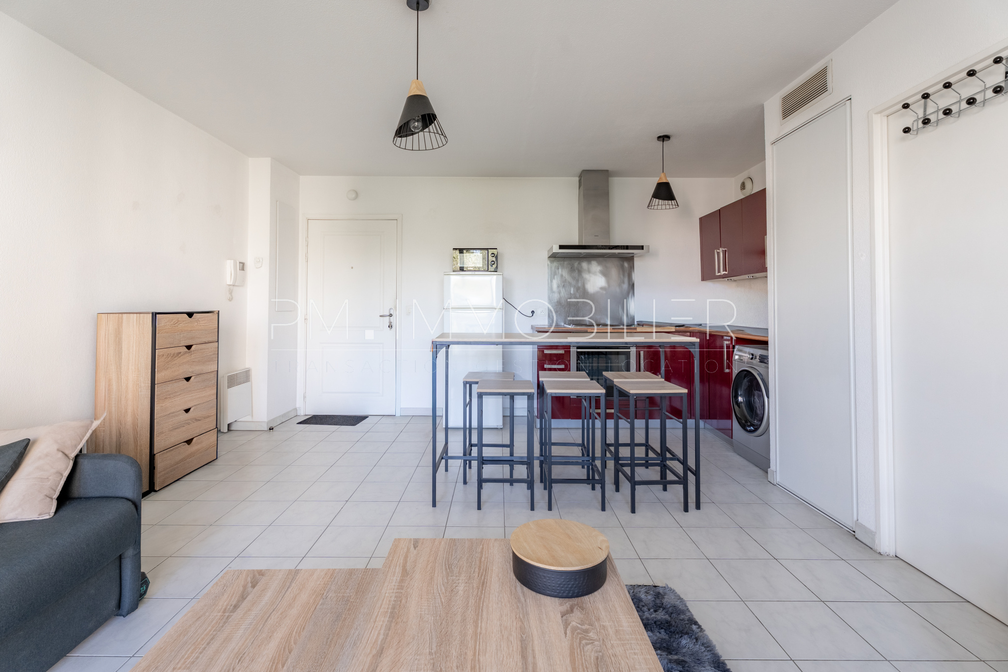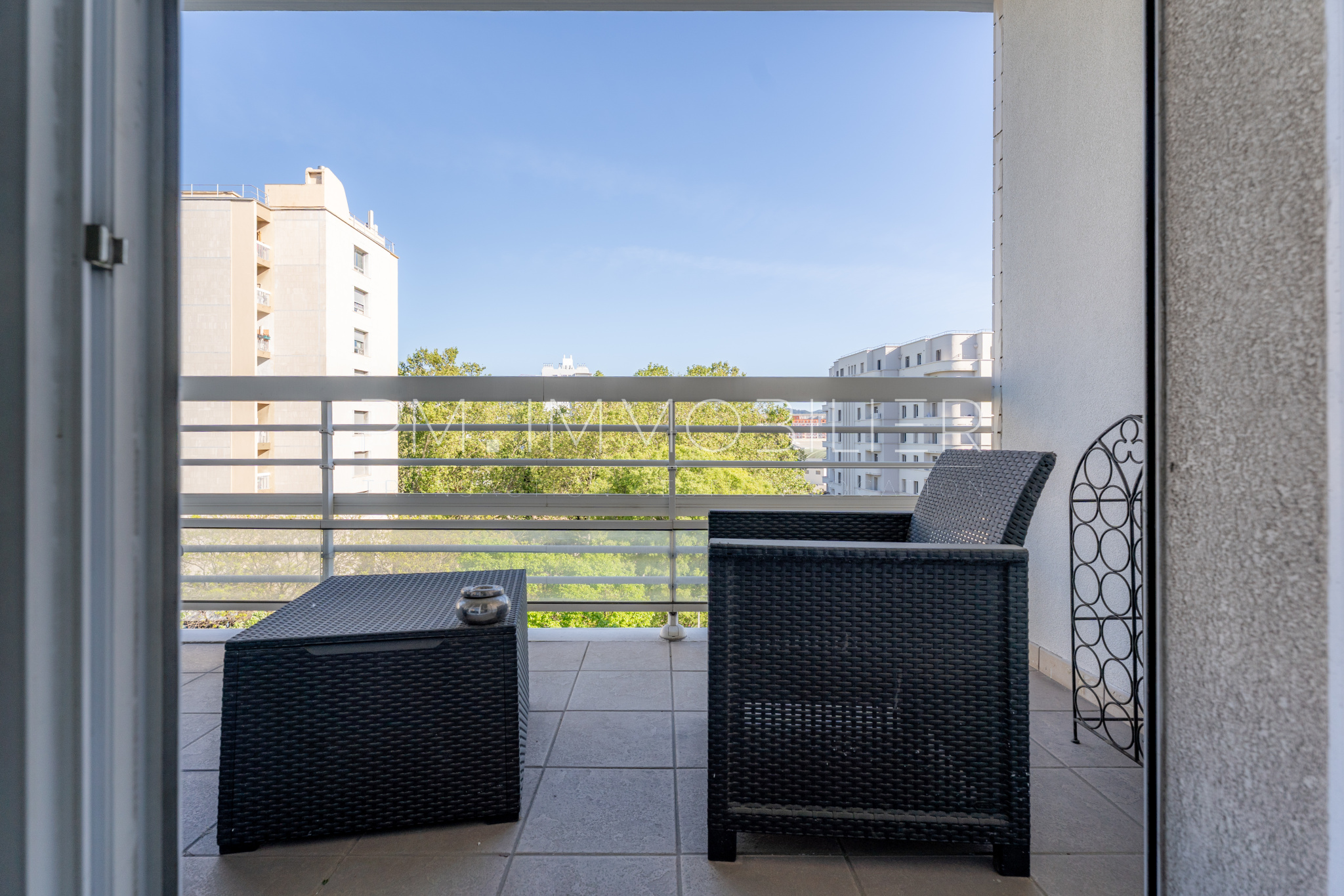 Architecture contemporaine de 2008 pour cet immeuble situé dans le secteur Rabatau, qui accueille au 4ᵉ étage sur 8 avec ascenseur un appartement de type 2 de 38 m², prolongé par une belle terrasse avec vue dégagée sur la ville et ses espaces arborés.