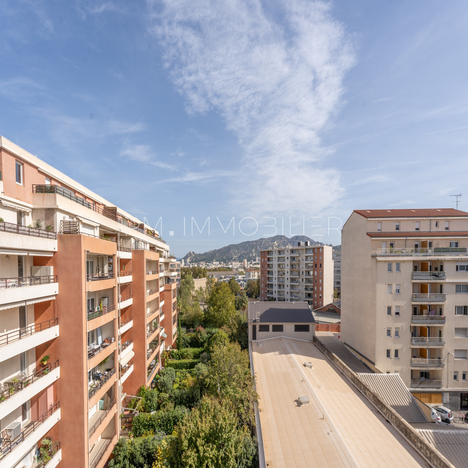 Architecture de 2008 pour cet immeuble situé dans le quartier du Rouet, entre l'hôpital Saint-Joseph et le parc du 26e Centenaire. Il abrite, au 6e étage sur 8, un appartement de type 3 de 63 m² avec une vue dégagée.
