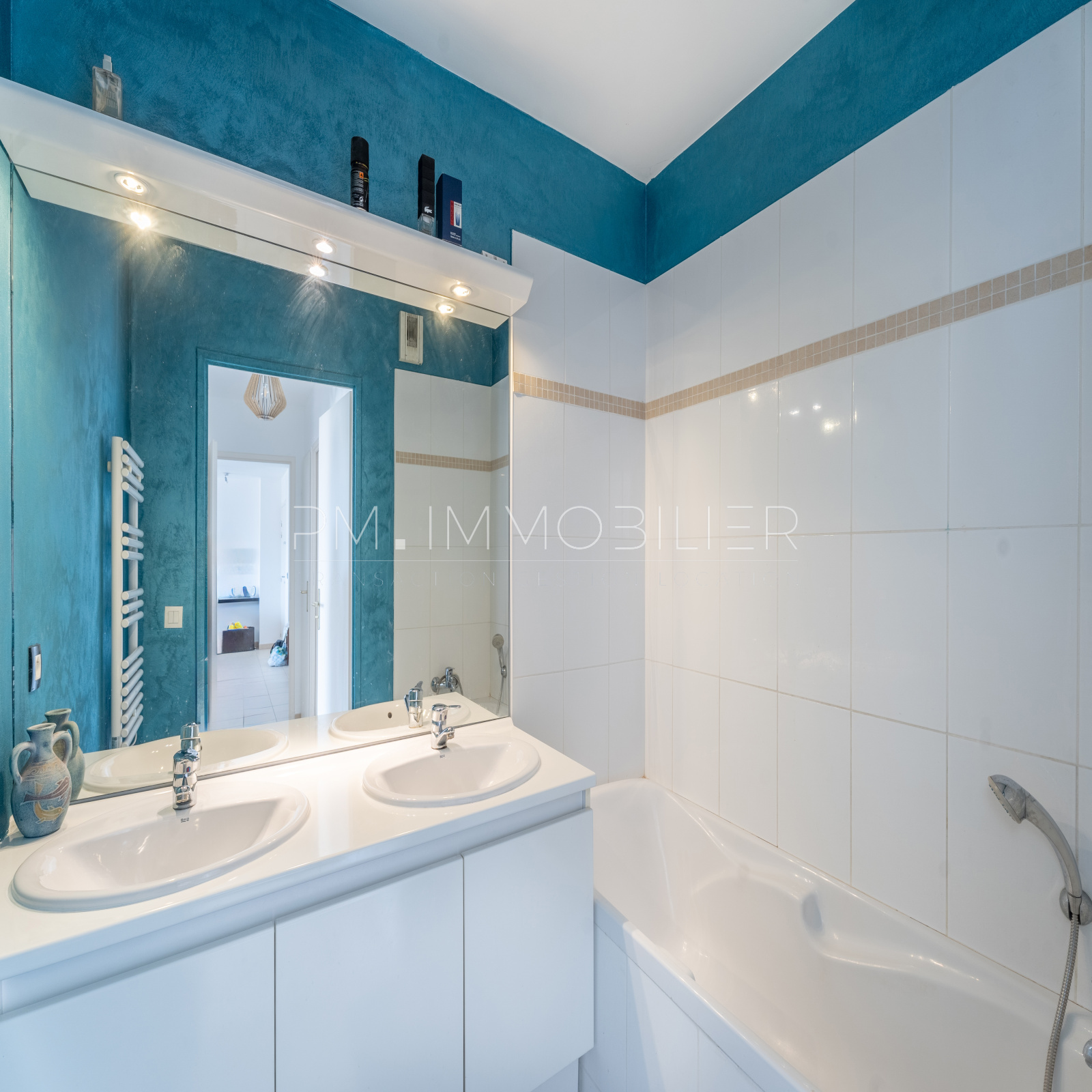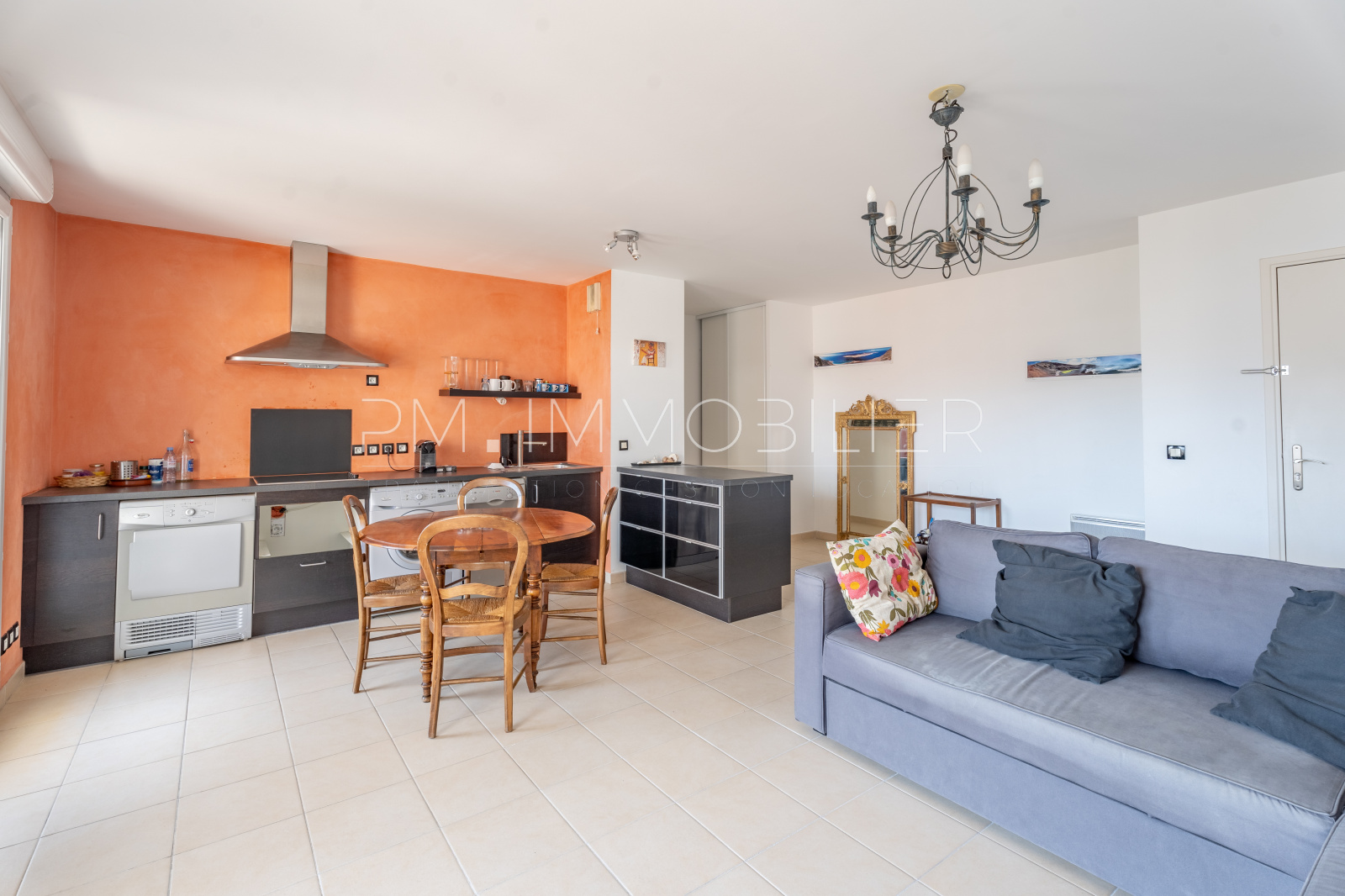 L'entrée de l'appartement s'ouvre directement sur la pièce de vie, qui comprend une cuisine américaine aménagée. La pièce, de plus de 30 m², est équipée de baies vitrées avec volets roulants électriques, et donne sur une terrasse de 11 m² orientée Sud-Est. Cet espace est climatisé pour plus de confort. La vue est très agréable, offrant une perspective dégagée sur les collines du 9e arrondissement, avec peu de vis-à-vis sur les immeubles voisins.
