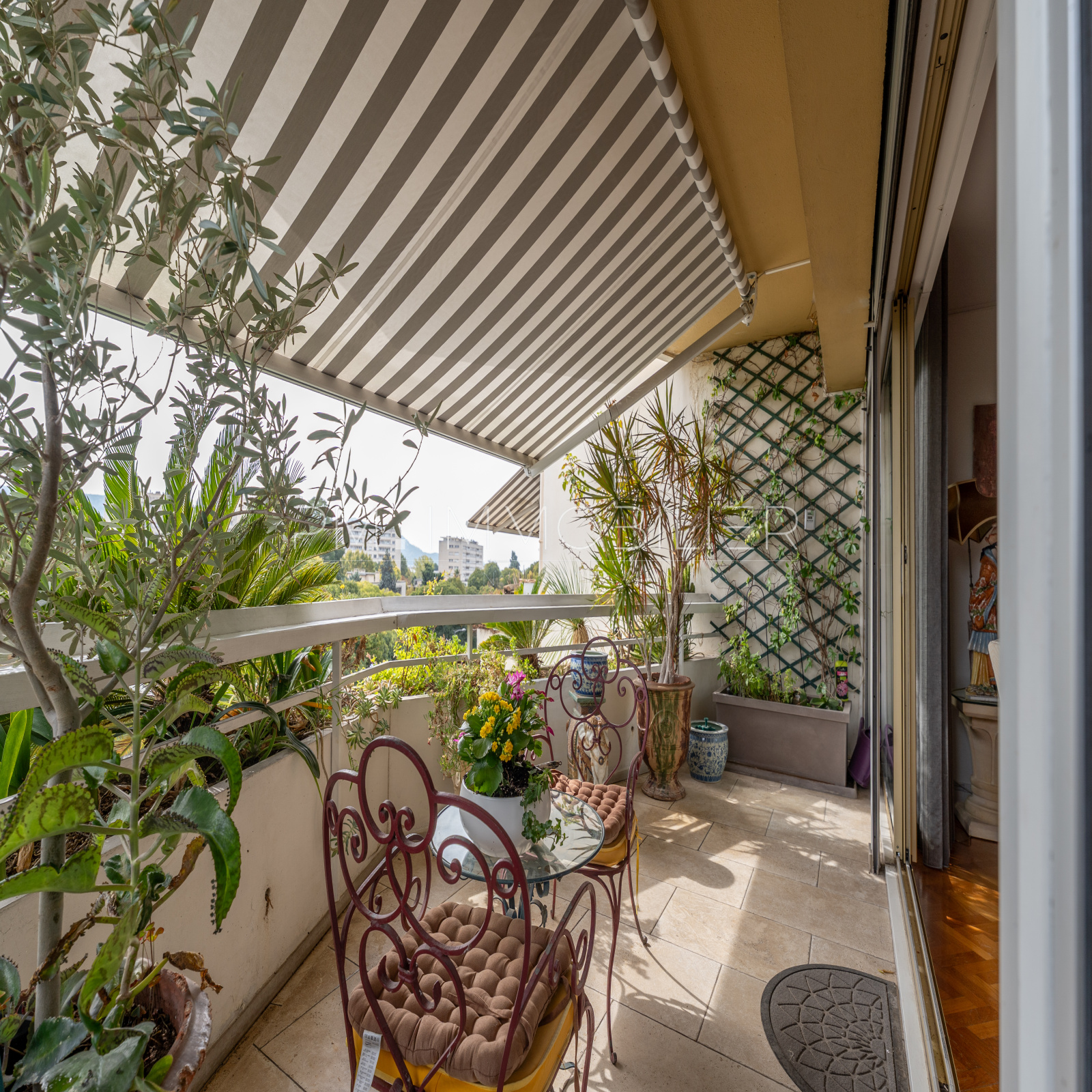 Les deux terrasses sont végétalisées, ombragées par stores bannes et suffisamment profondes pour accueillir table, chaises et plantes.