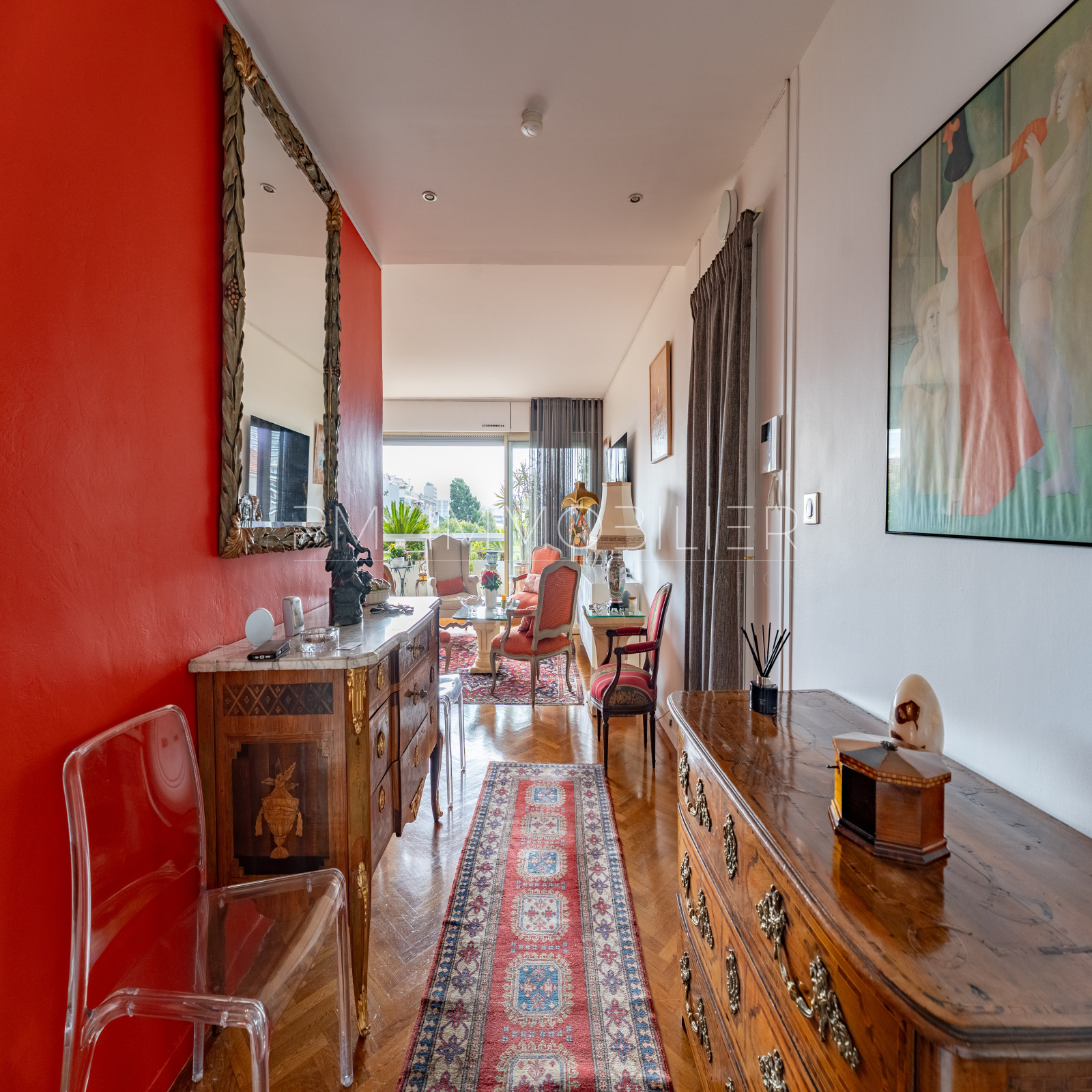 L’entrée abrite un séjour aux volumes généreux, baigné de lumière grâce à sa double ouverture sur la terrasse principale.
