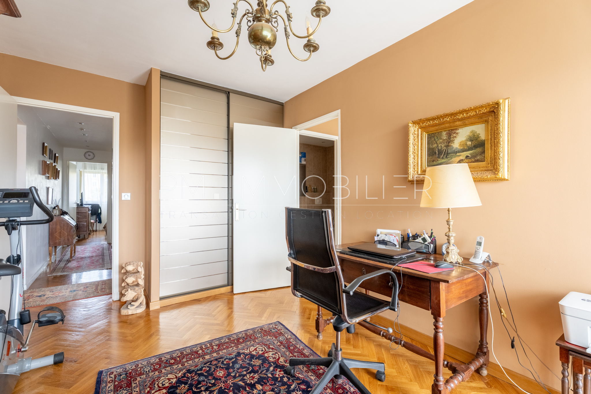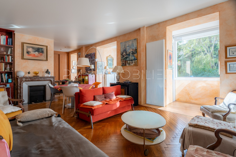 Les sols en parquet massif en point de Hongrie, omniprésents dans l’appartement, renforcent le caractère chaleureux et élégant des pièces.