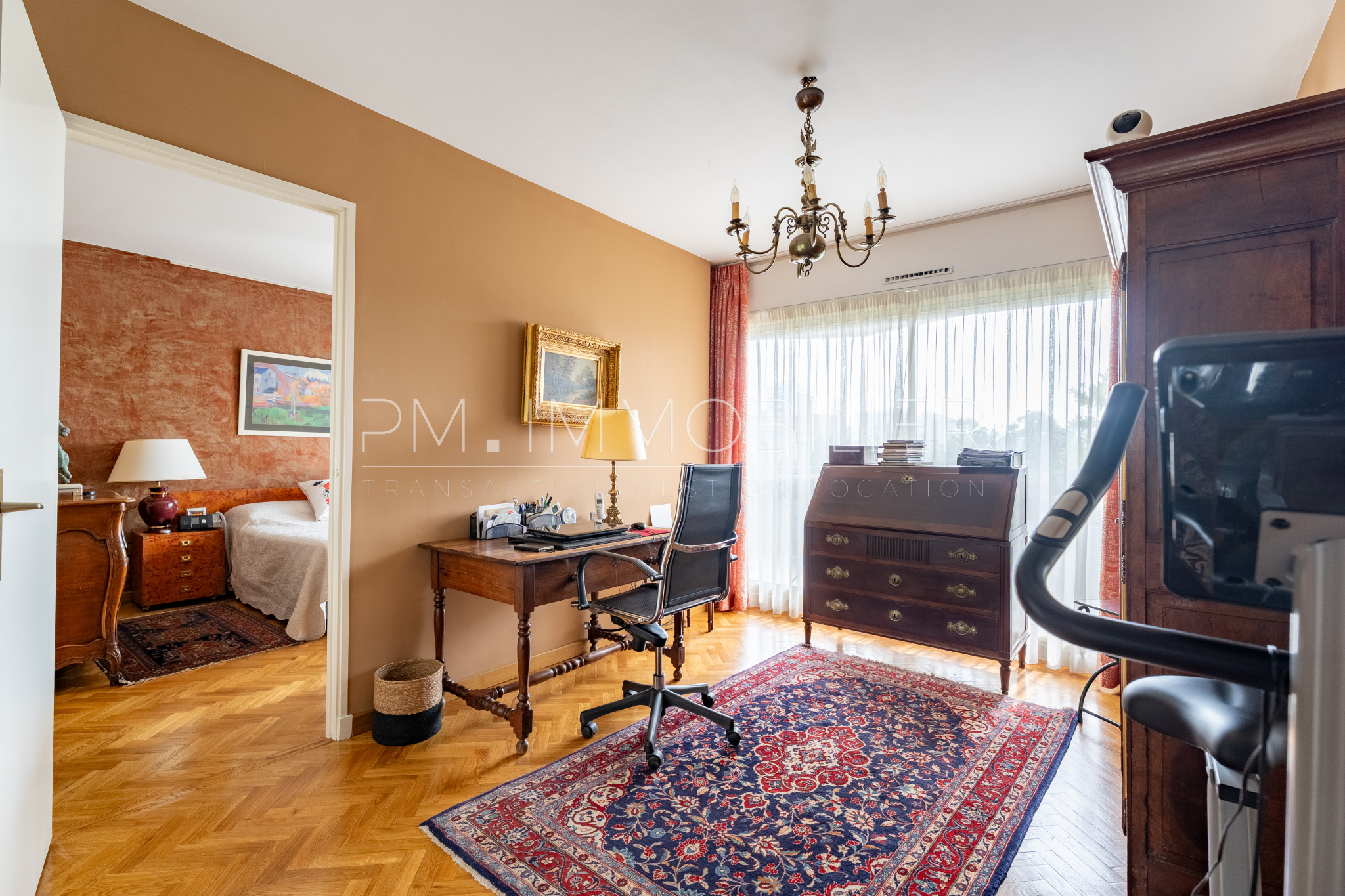 La partie nuit propose trois chambres et un bureau, chacune avec parquet, grandes fenêtres et rangements, une atmosphère chaleureuse grâce aux teintes douces et aux rideaux sur mesure, une suite parentale avec salle d’eau attenante et un dressing de 2,81 m², une seconde salle d’eau aux finitions modernes (grande douche à l’italienne, meuble vasque contemporain) et deux WC complètent l’ensemble.