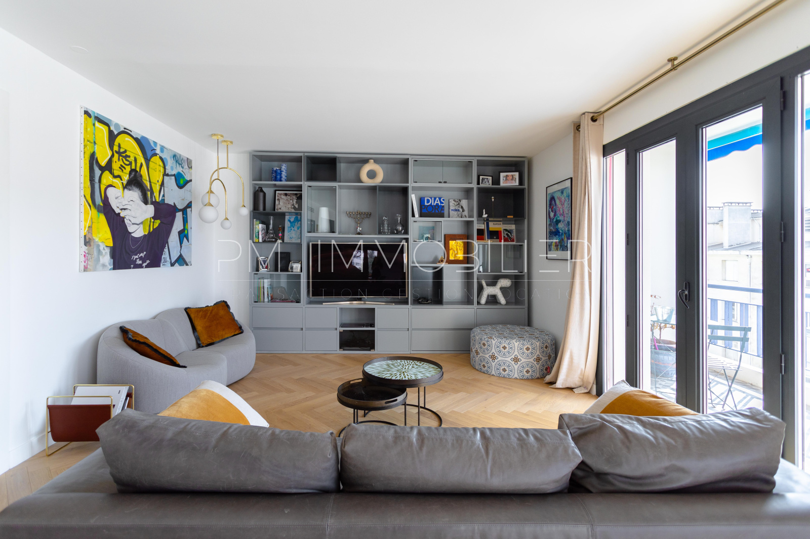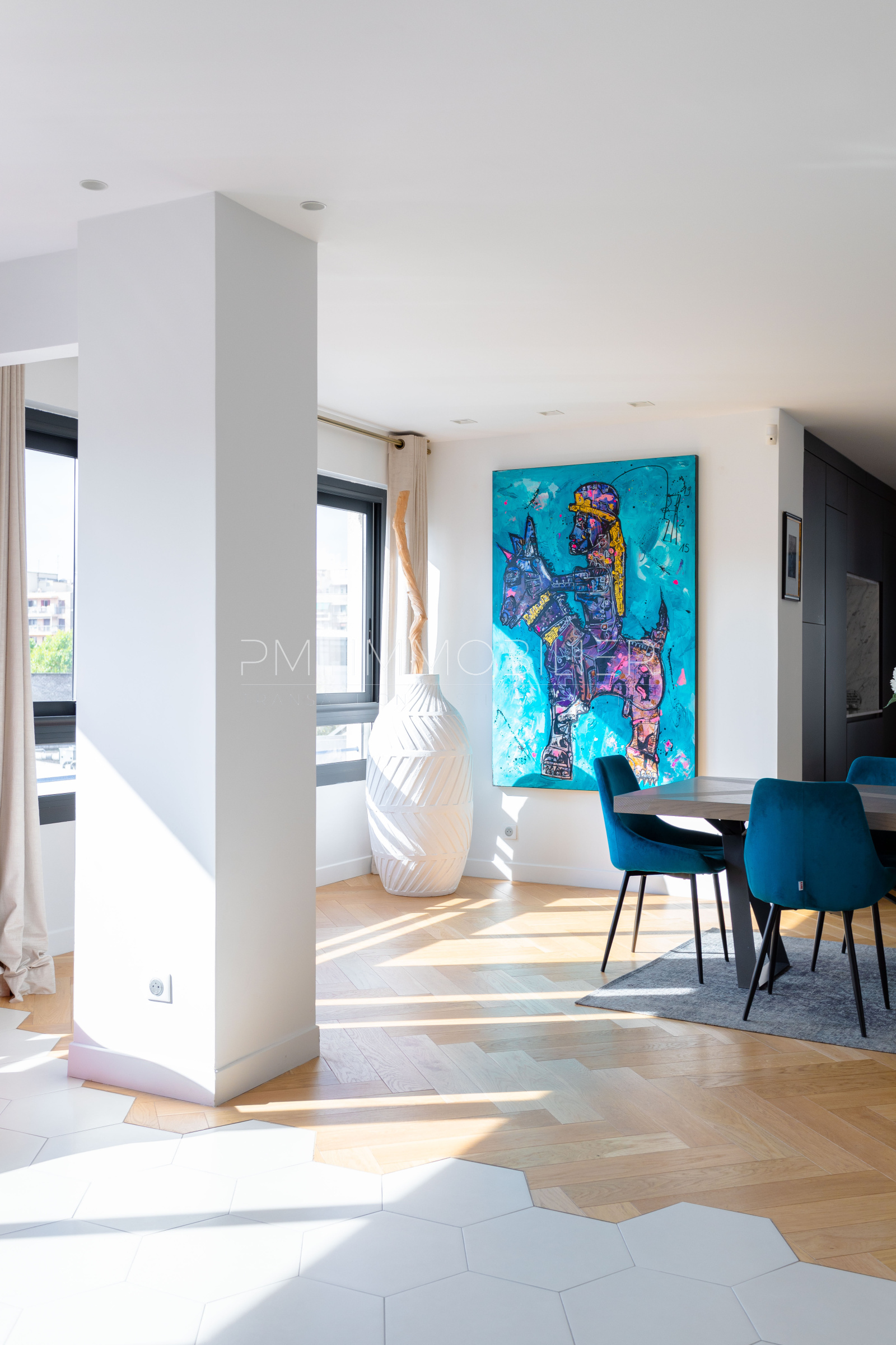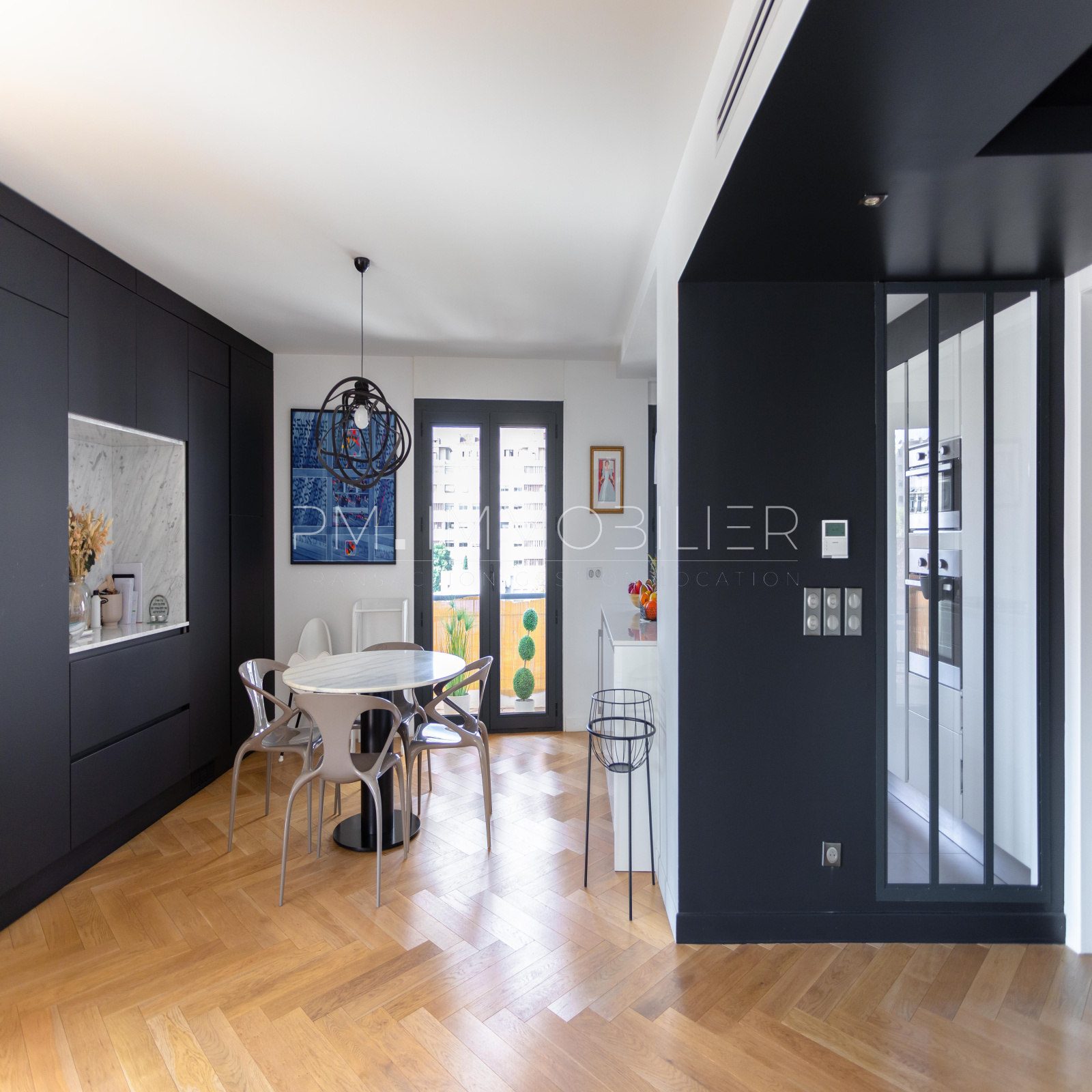 VENDU - Entièrement rénové en 2019, cet appartement de 200 m2 est sublimé par une magnifique lumière. Situé au 5ème étage avec ascenseur d'un immeuble des années 70. Justesse des tons, des volumes et du parquet en chêne clair dialoguent à la perfection avec la verrière métallique et les grandes fenêtres en aluminium noir qui structure l'espace.