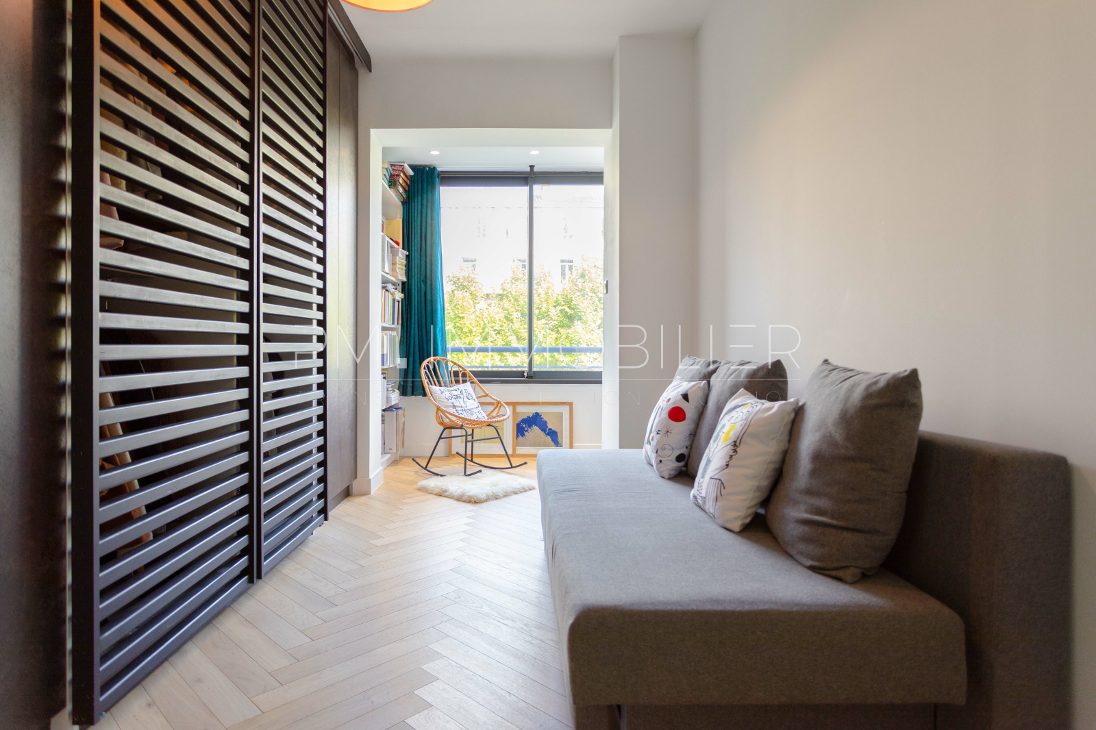 Dans sa continuité un premier espace nuit avec sa suite parentale précédée d'un vaste dressing et d'une salle d'eau au ton ardoise. Deux chambres pourront accueillir des chambres d'enfants. On retrouve également dans cette partie une salle de bain aux carreaux gris clairs.