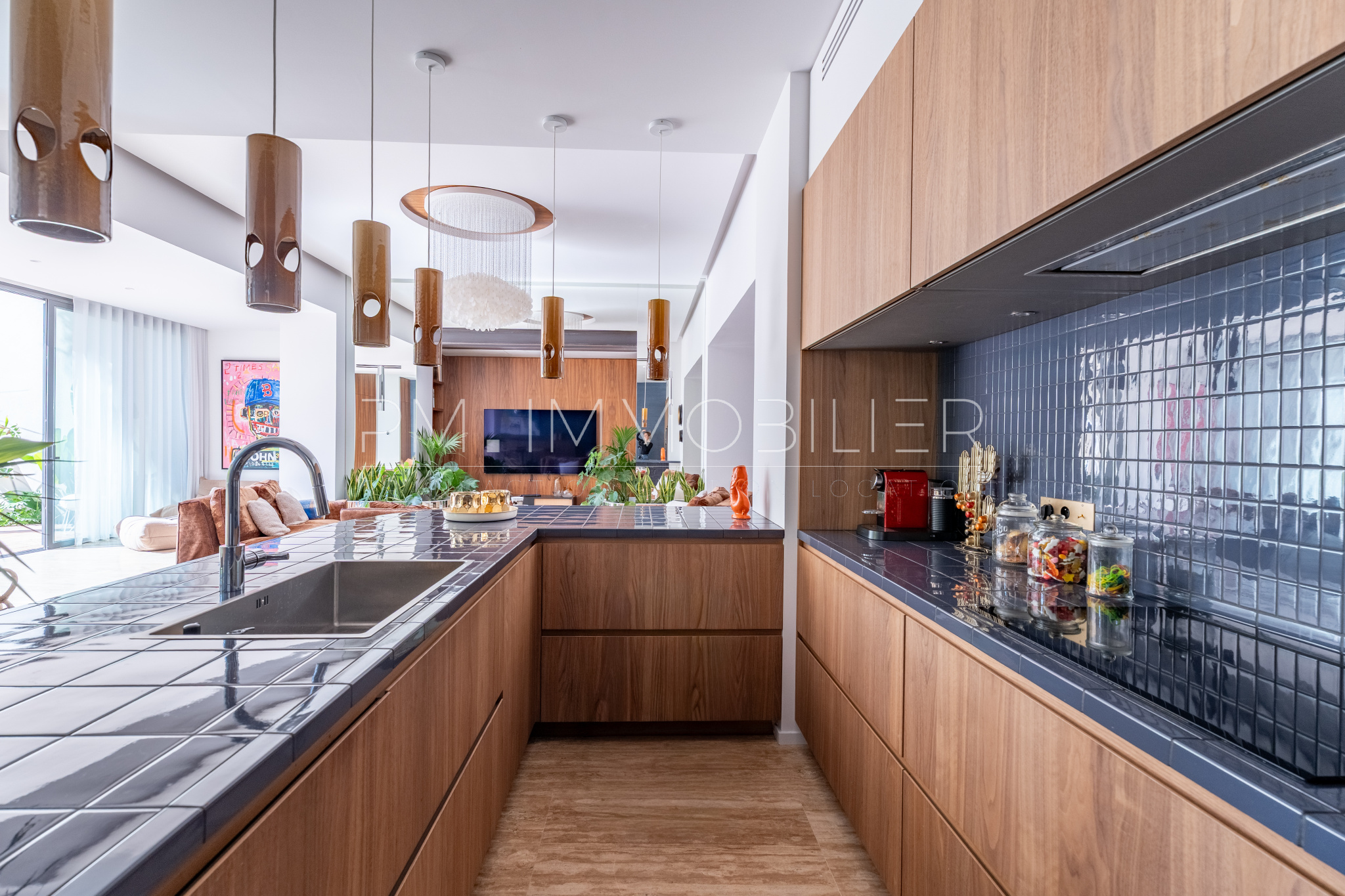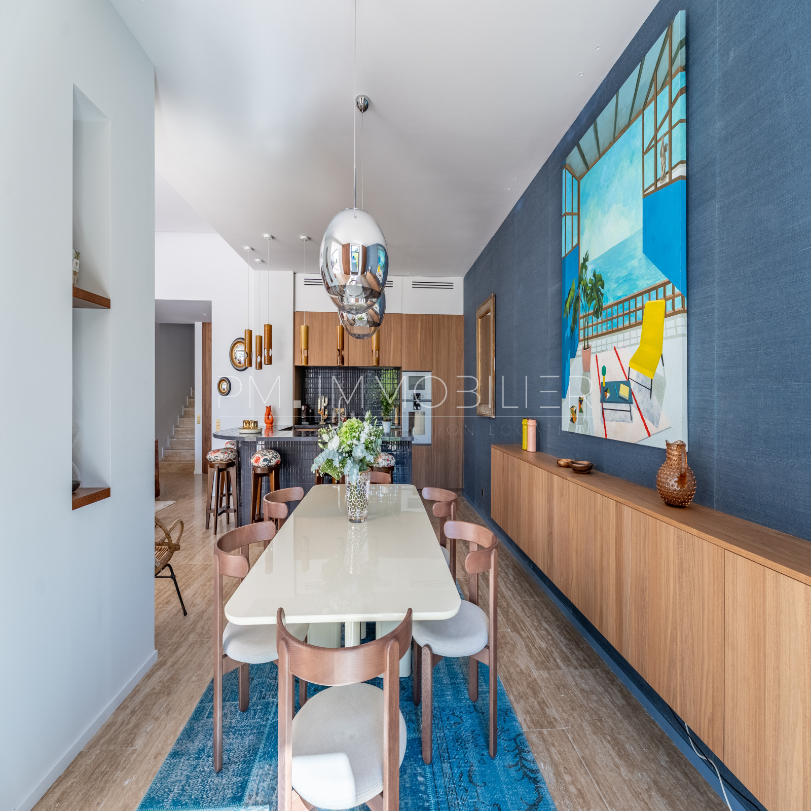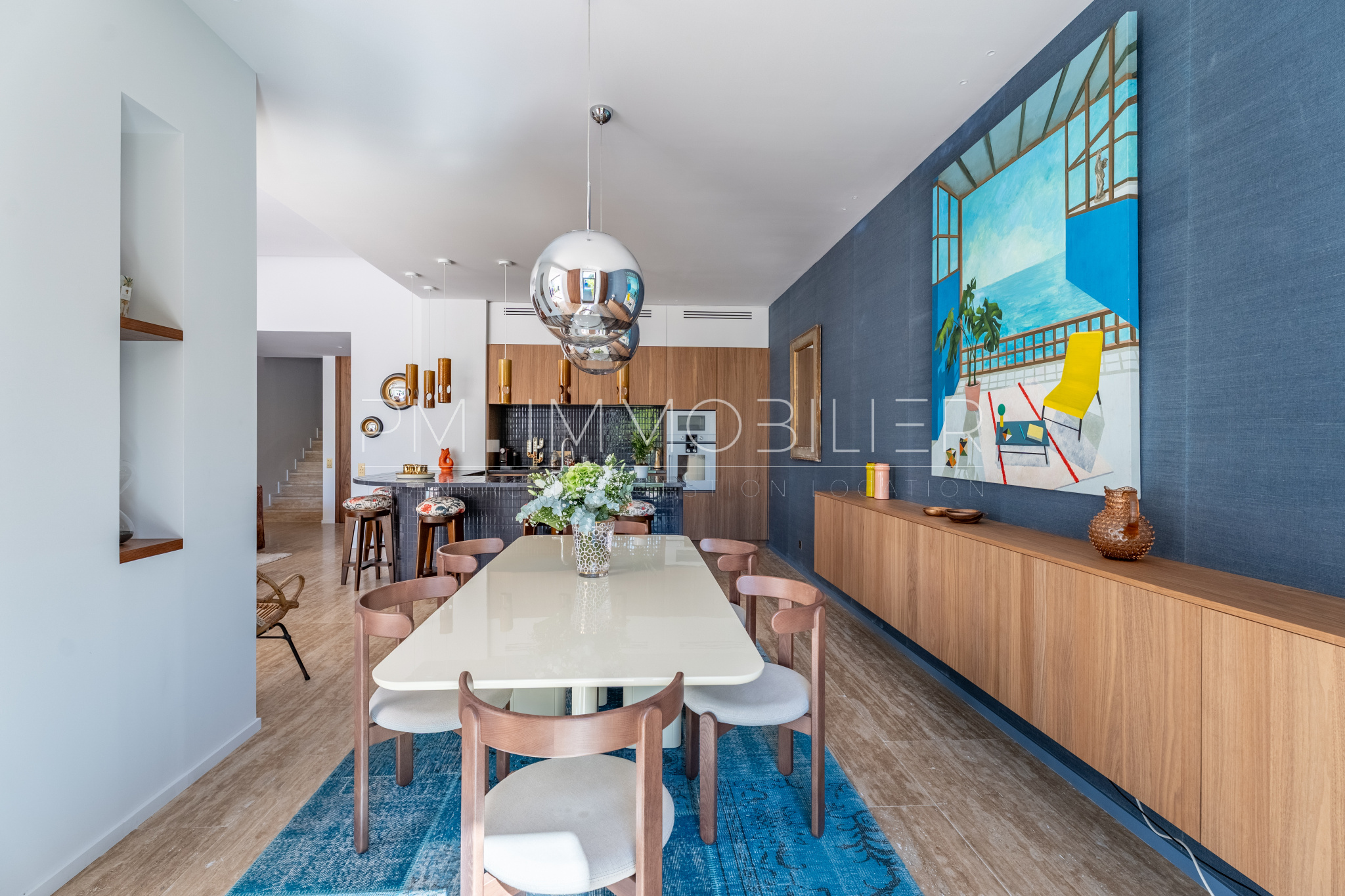 Baignée de lumière grâce à son orientation plein sud, la pièce de vie de plus de 80 m² déploie de superbes volumes et une belle hauteur sous plafond. Elle réunit un séjour raffiné, sublimé par des miroirs et des boiseries sur mesure, une salle à manger conviviale et une cuisine ouverte au design audacieux, habillée de carreaux bleu nuit.
