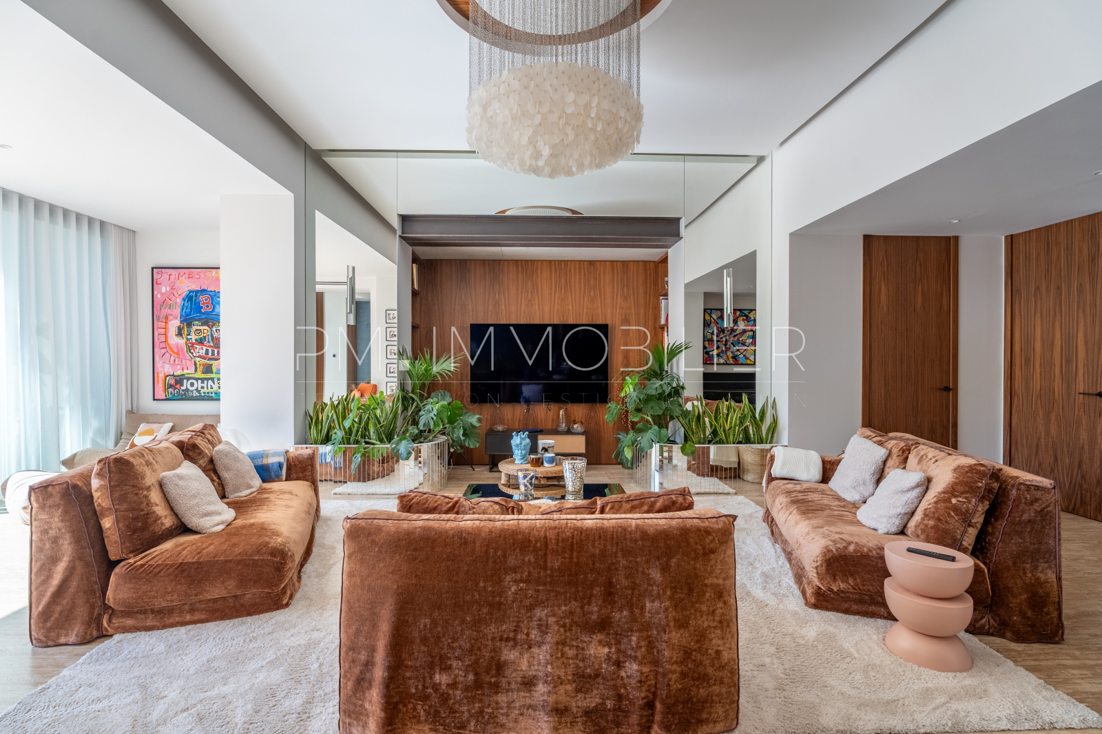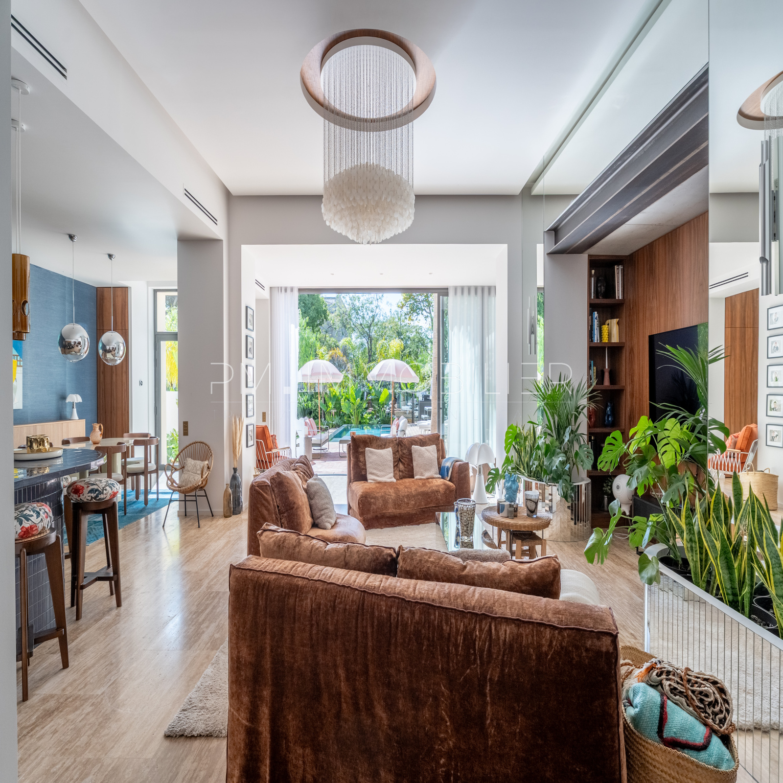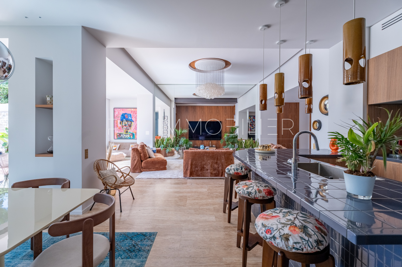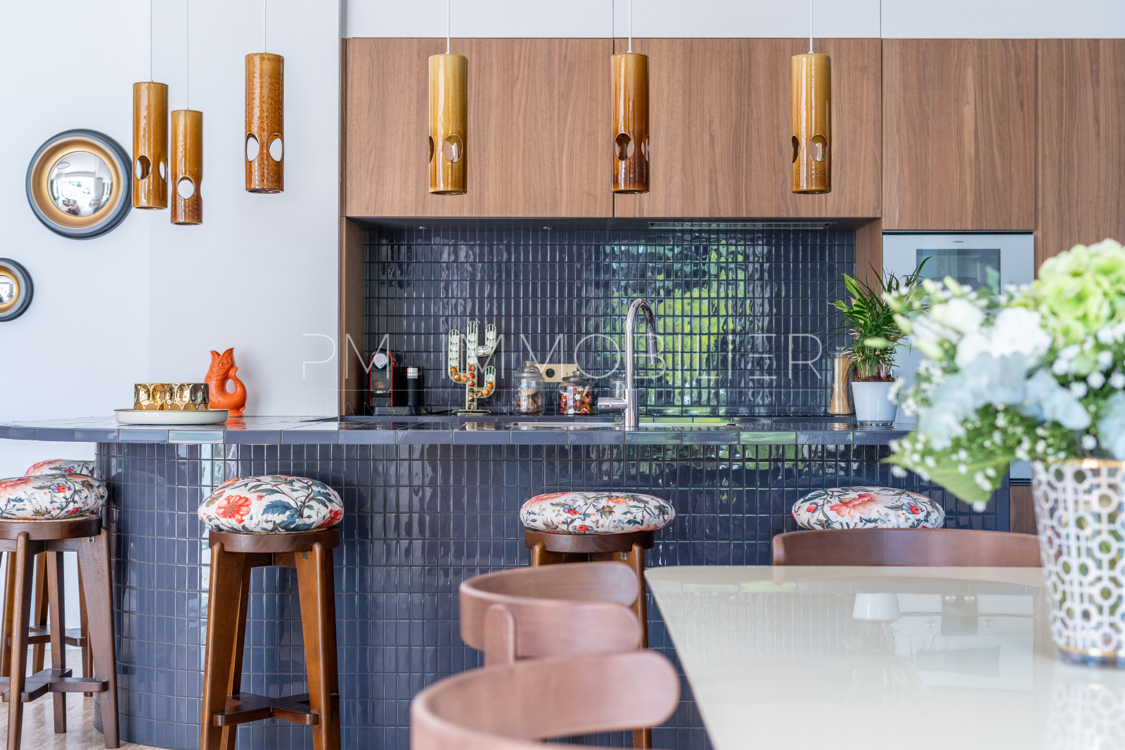 Baignée de lumière grâce à son orientation plein sud, la pièce de vie de plus de 80 m² déploie de superbes volumes et une belle hauteur sous plafond. Elle réunit un séjour raffiné, sublimé par des miroirs et des boiseries sur mesure, une salle à manger conviviale et une cuisine ouverte au design audacieux, habillée de carreaux bleu nuit.