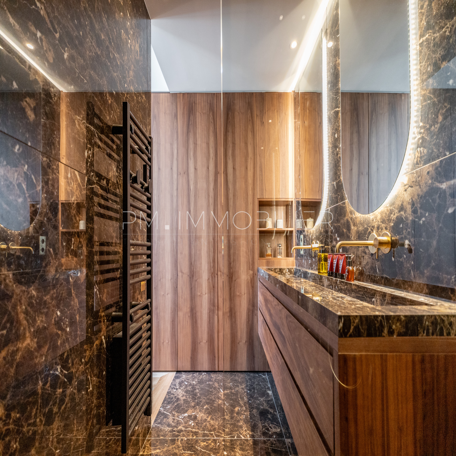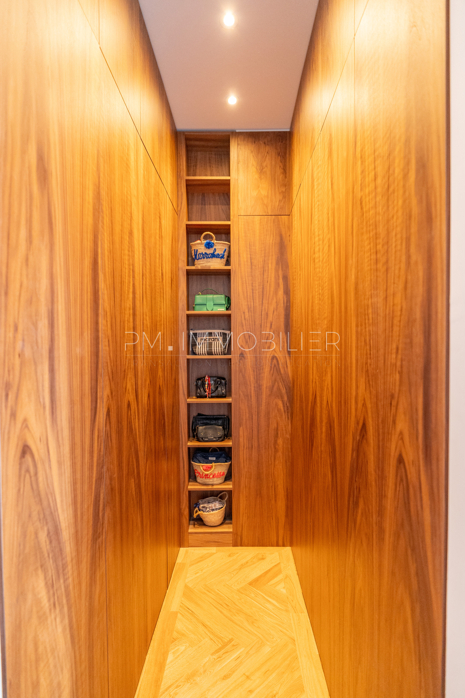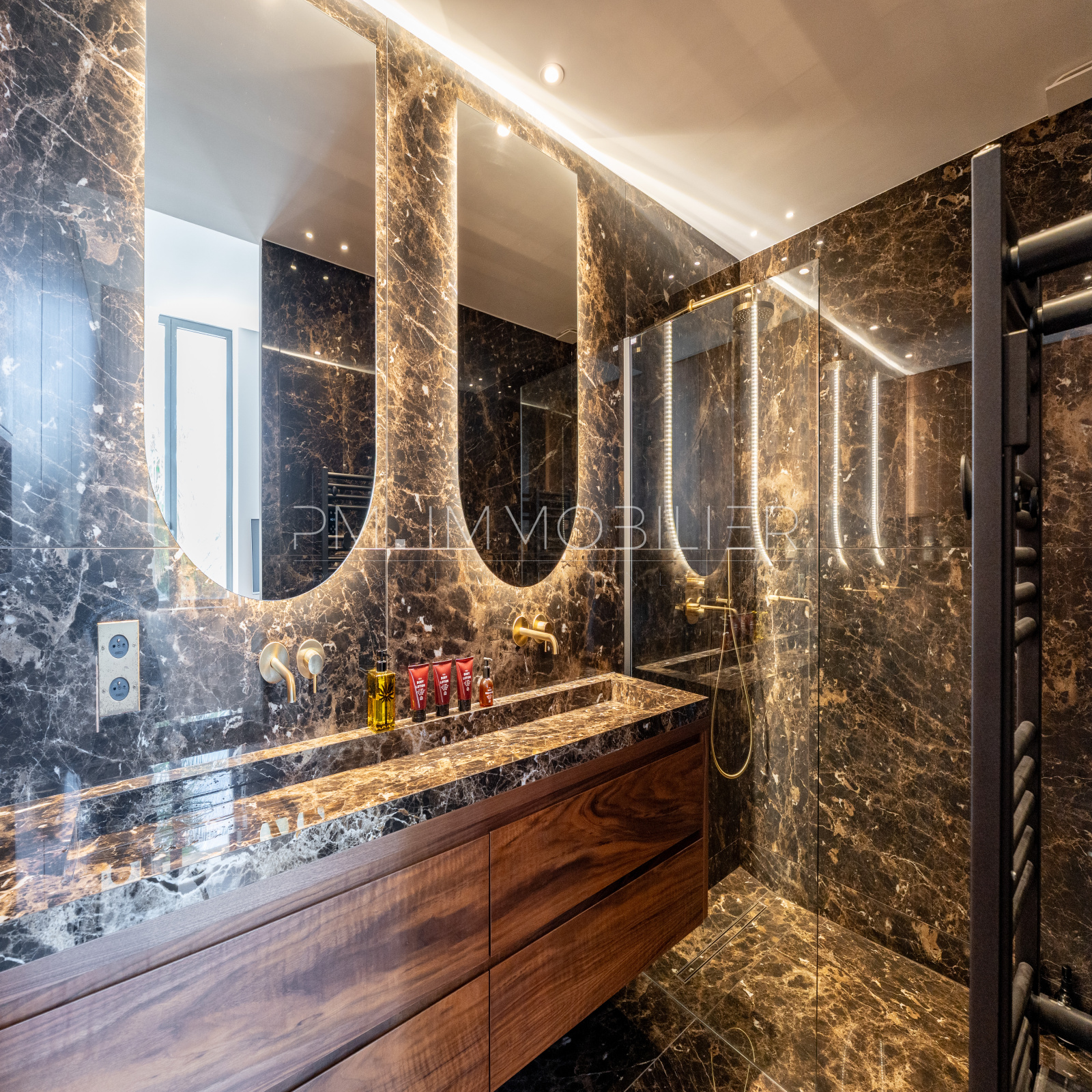 Les matériaux choisis – travertin au sol dans la pièce de vie, parquet chevron dans les chambres, dressing, portes toute hauteur et bibliothèque en noyer, carreaux graphiques, robinetterie dorée, traduisent une exigence de finition digne des plus belles demeures. Une buanderie indépendante et deux WC séparés complètent le confort intérieur.