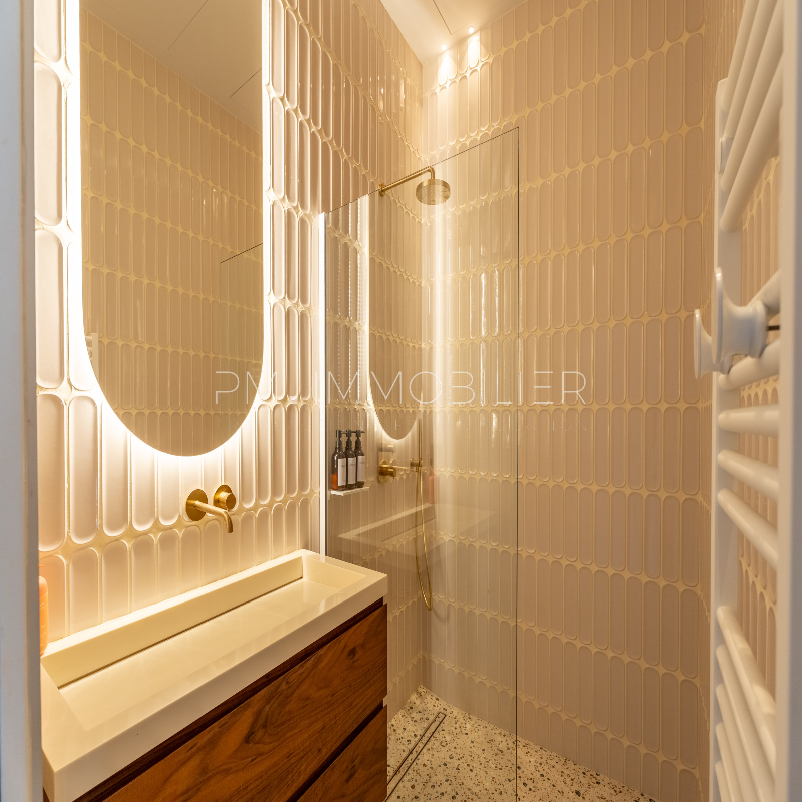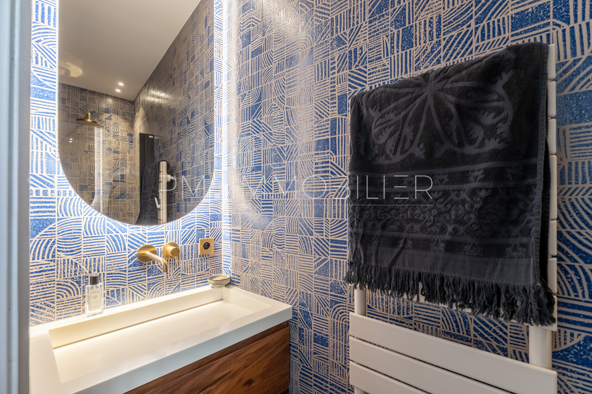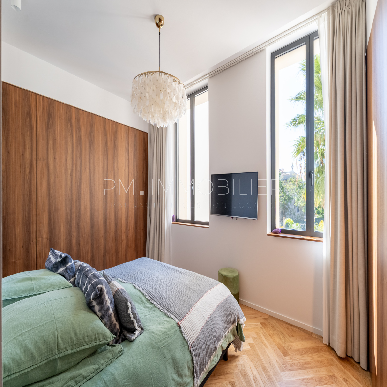 Les matériaux choisis – travertin au sol dans la pièce de vie, parquet chevron dans les chambres, dressing, portes toute hauteur et bibliothèque en noyer, carreaux graphiques, robinetterie dorée, traduisent une exigence de finition digne des plus belles demeures. Une buanderie indépendante et deux WC séparés complètent le confort intérieur.