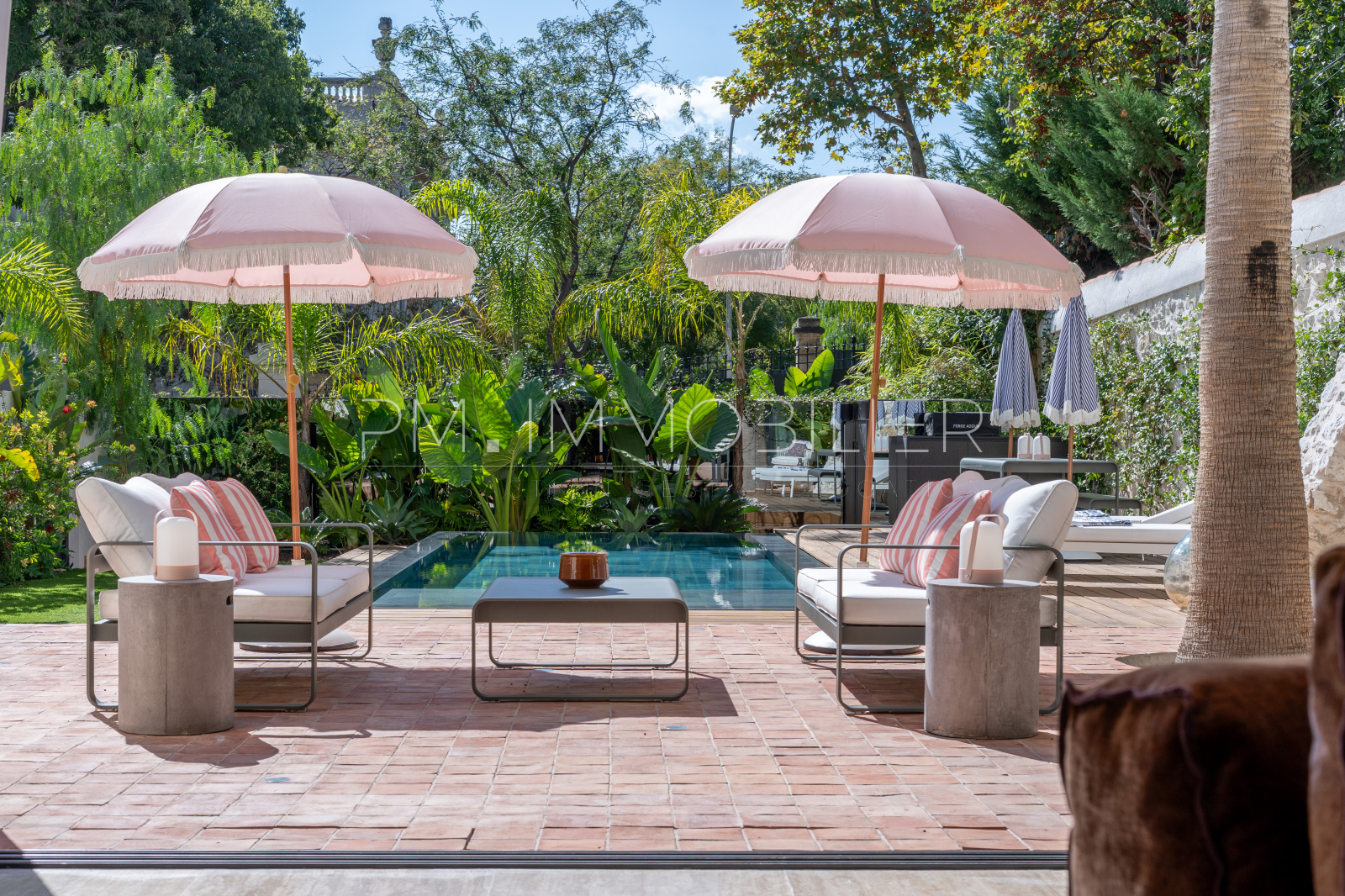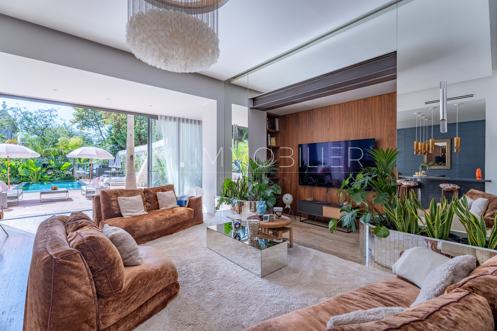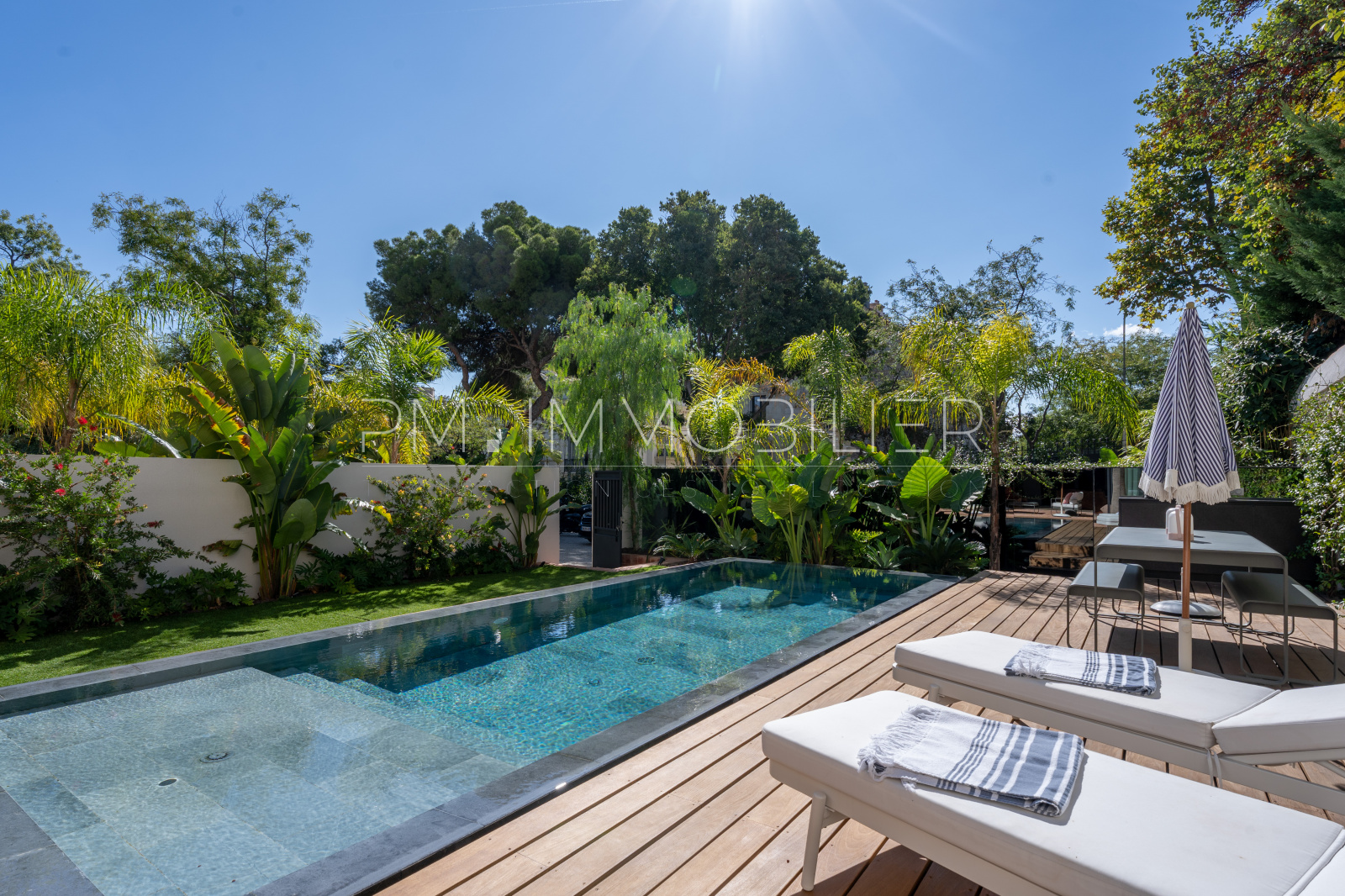 De larges baies vitrées prolongent naturellement cet espace vers un jardin privé d’environ 200 m², conçu comme un écrin végétal luxuriant où chaque essence a été choisie avec soin. Au cœur de cet extérieur unique, une superbe piscine miroir vient sublimer l’ensemble, apportant calme, élégance et modernité.