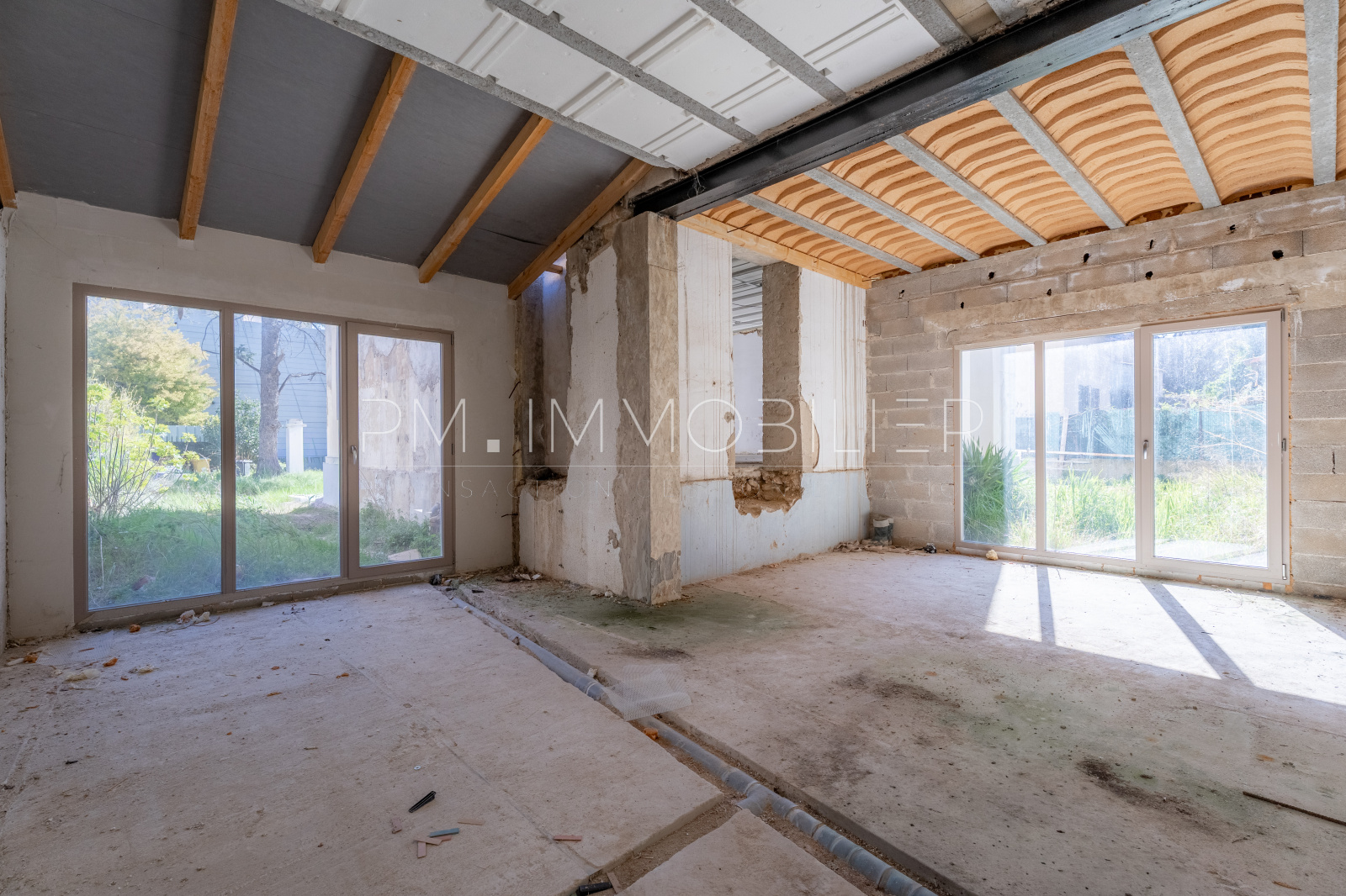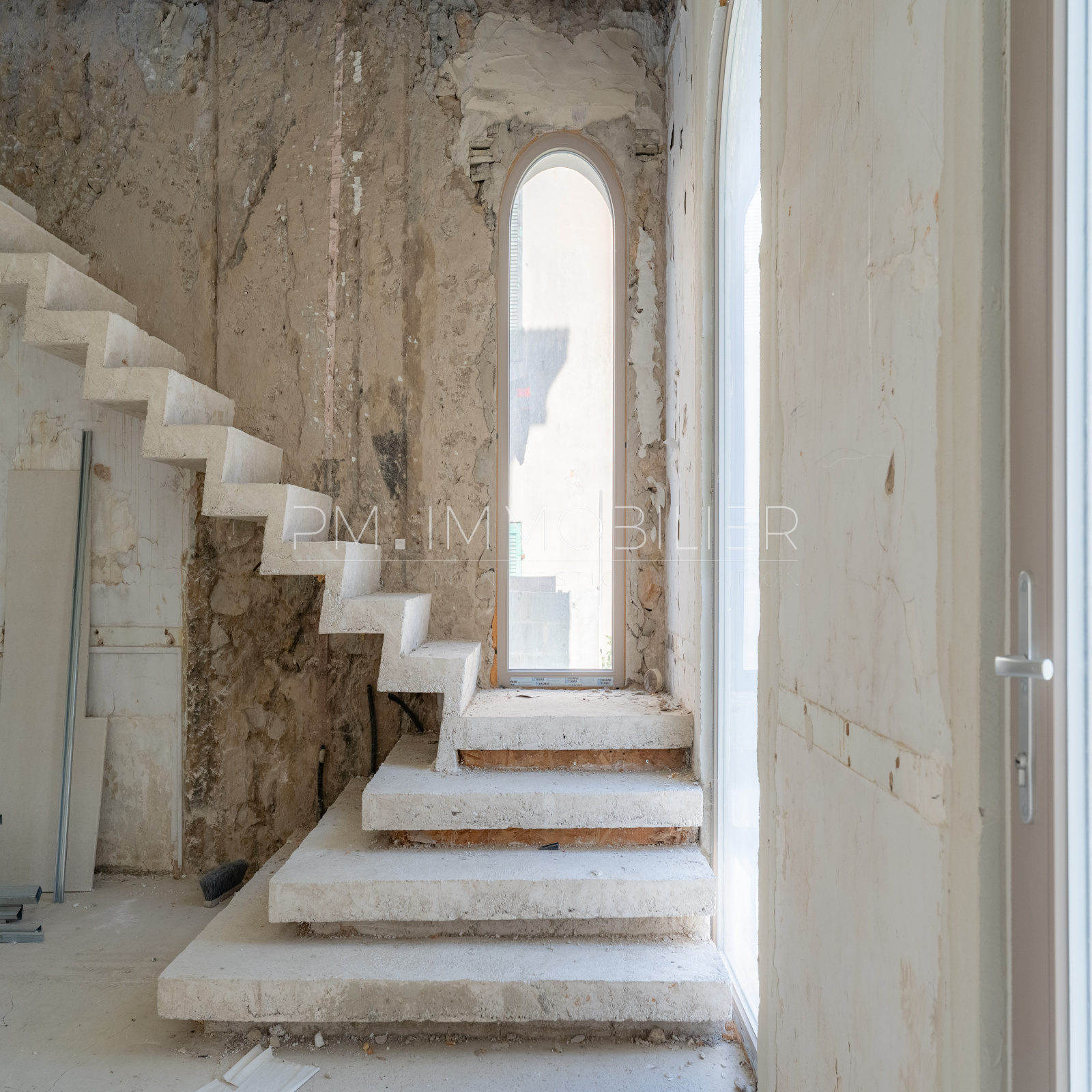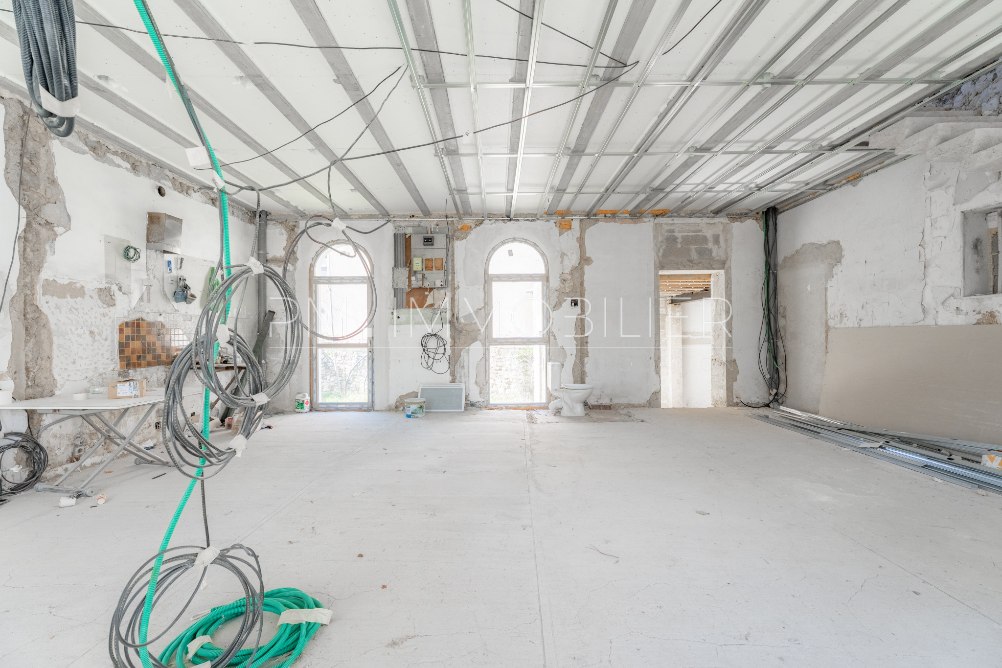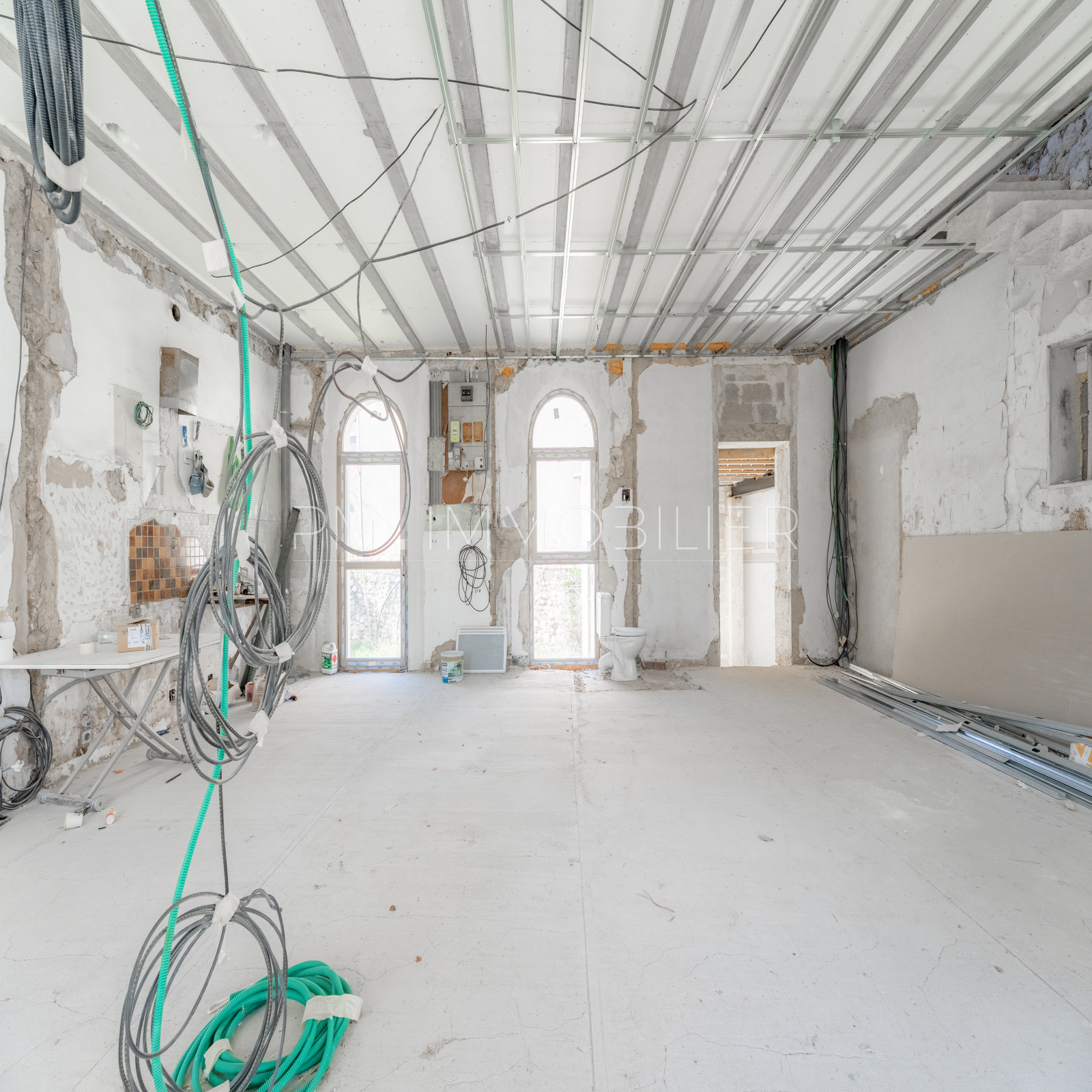Derrière sa façade au charme patiné, cette bâtisse en cours de renaissance dévoile des volumes rares et une lumière omniprésente. Le rez-de-chaussée, entièrement décloisonné, laisse entrevoir une pièce de vie spectaculaire, baignée de soleil, ouverte sur le jardin.